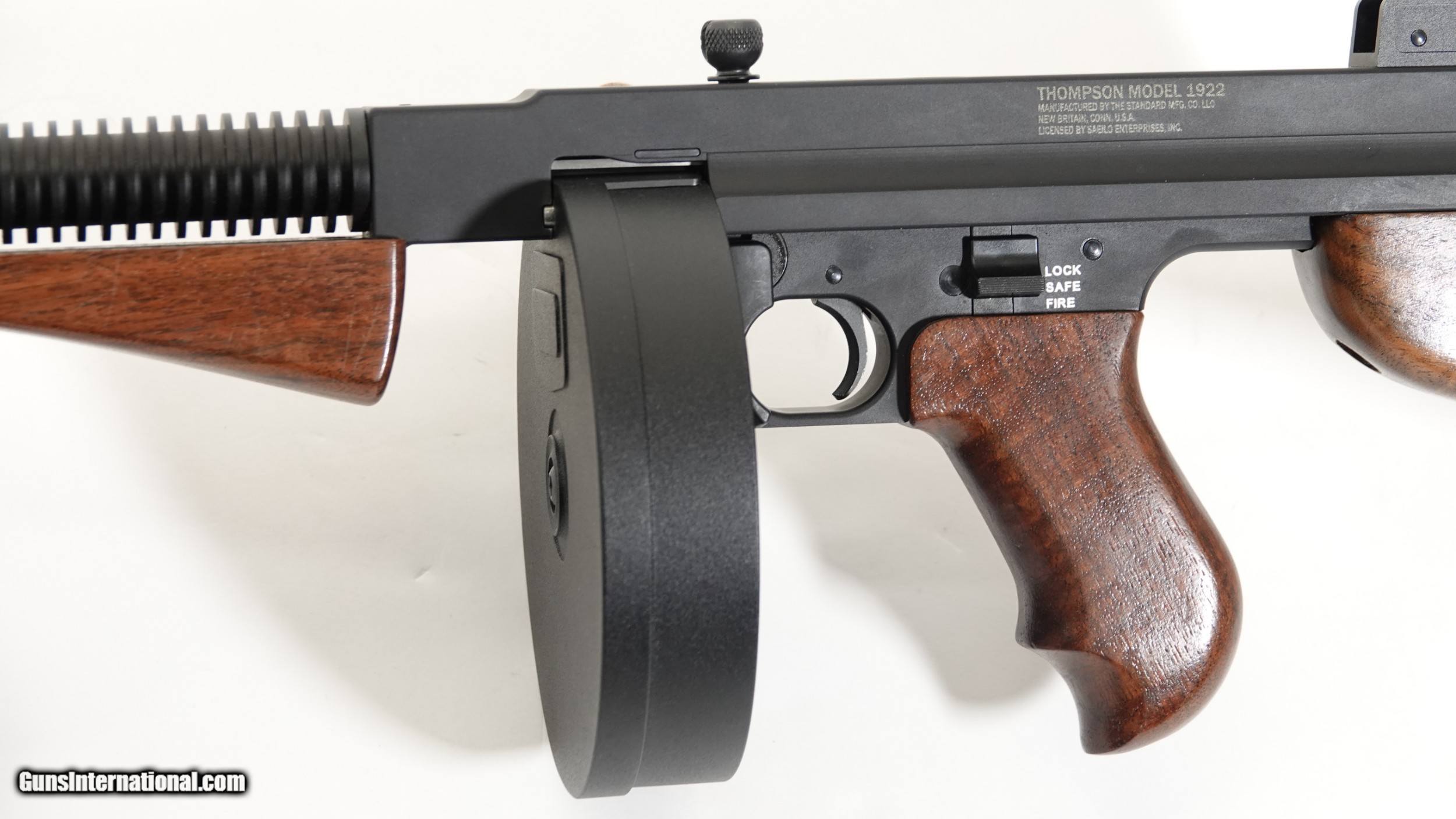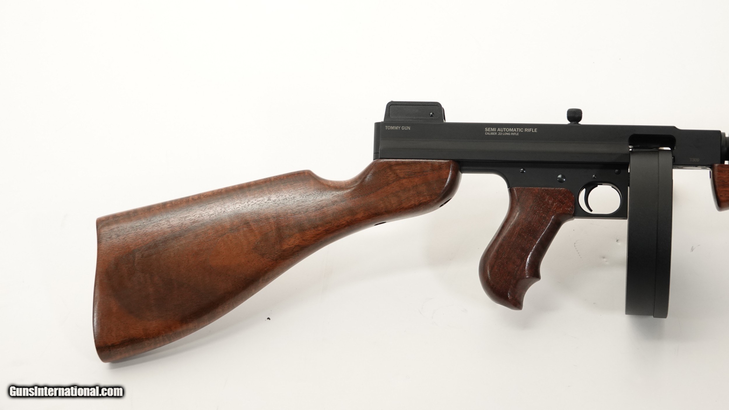 Description: Standard Manufacturing Company- Thompson Model 1922, .22 Long Rifle, Semi-Automatic Rifle, 16.4” barrel, walnut stock and grips, 1/2 size frame, the gun is completely machined out of aircraft-grade aluminum. Standard Manufacturing Company is proud to offer the Tommy Gun Semi-Automatic Rifle in .22LR This is the first time in history that a Thompson product is offered on a true scaled frame according to its caliber. Don’t confuse this gun with a crude finished gun, these guns are built like a Swiss watch, all metal and wood finishes are superior to any other comparable guns on the market, this gun is a marvel of modern engineering, it will be the centerpiece of your gun collection. Barrel Length- 16.4” Overall Length- 34 ½” Weight with 10 round magazine- 4lbs. 10oz. Optional 50 round drum (as shown) magazines are available separately. $1,100.00 We have a limited number of guns available for immediate delivery SOLD |