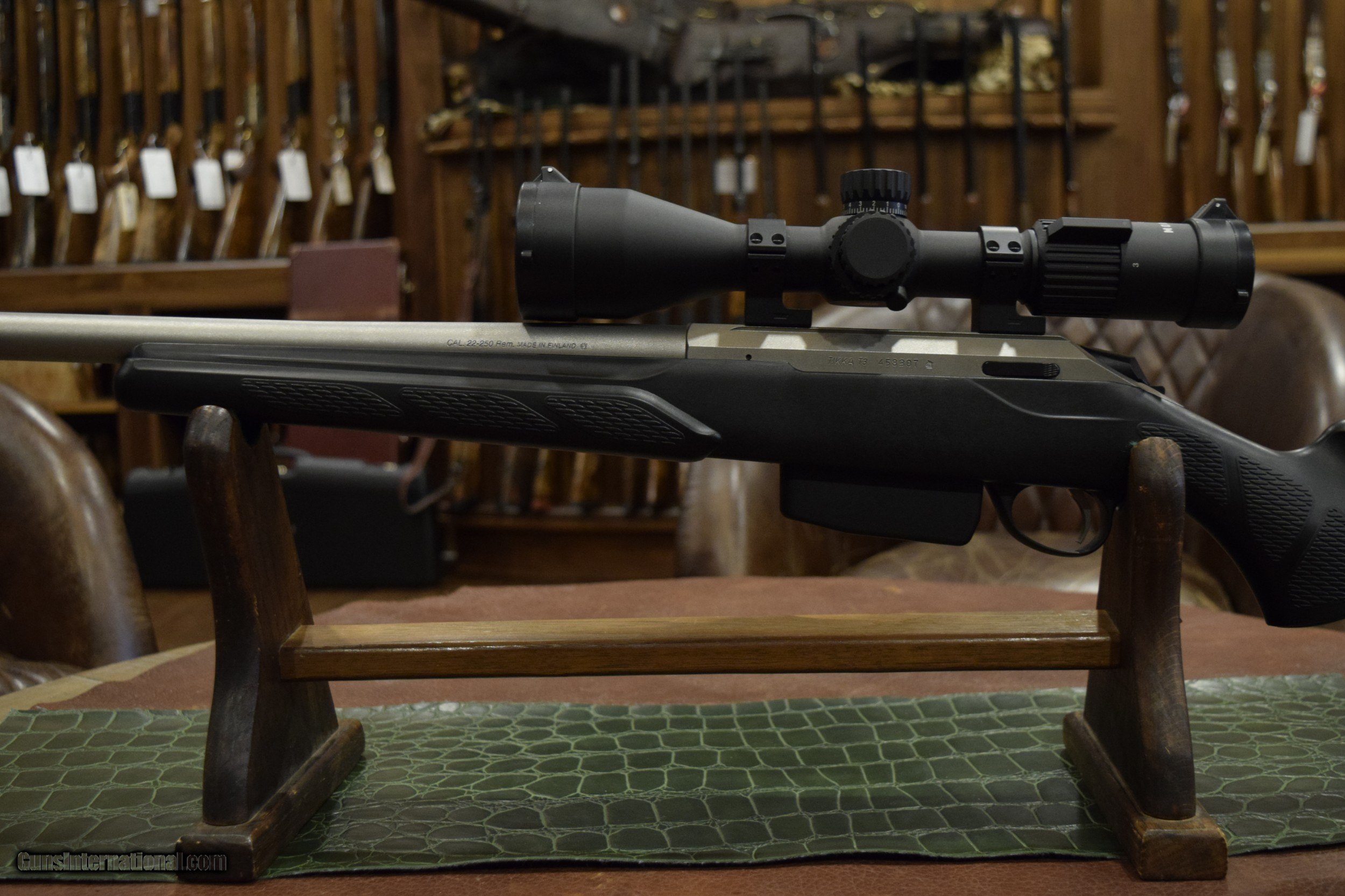 Description: Tikka T3 Stainless Bolt Action Rifle - 22-250 Remington - The Tikka T3 combines high performance with lightweight ease. The Tikka T3 is equipped with an all black synthetic stock with checkering and a matte stainless steel barrel. This item does not come with a box but does come with one magazine. Overall condition is great with minor wear form use to the item. Pre-Owned - TIKKA T3 w/ Scope Bolt 22-250 Rem. 24" Rifle