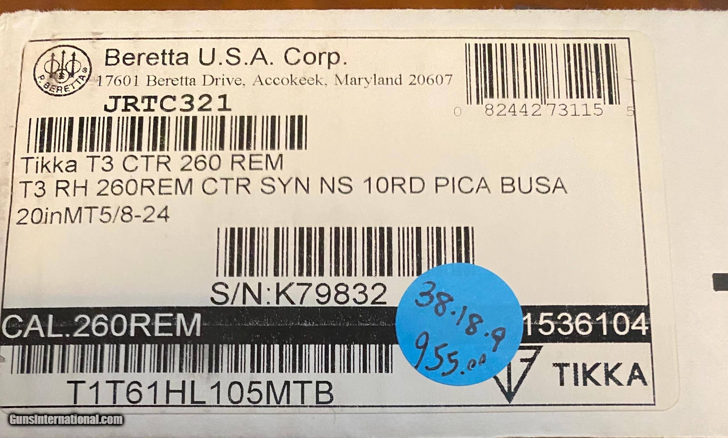 Description: New in the box bolt action rifle in the awesome .260 Remington. SOLD Rifle Caliber: .260 Remington Manufacturer: Tikka Model: T3 Serial Number: JRTC321 Barrel Length: 20 Bore: new Chambers: new Condition: new Metal Condition: new Wood Condition: n/a Bore Condition: new Action: bolt Triggers: factory Stock: synthetic |