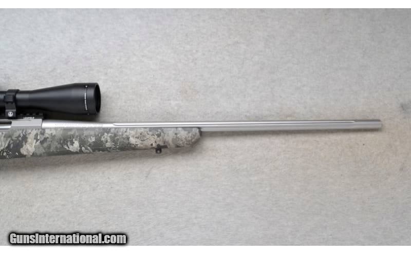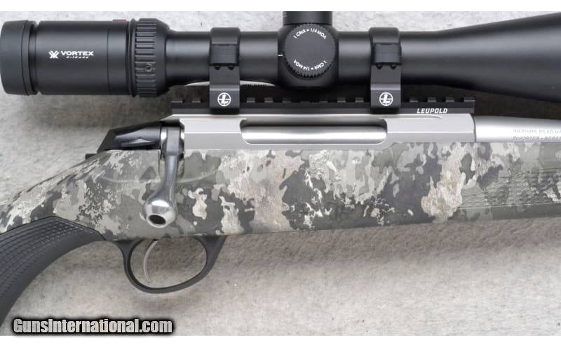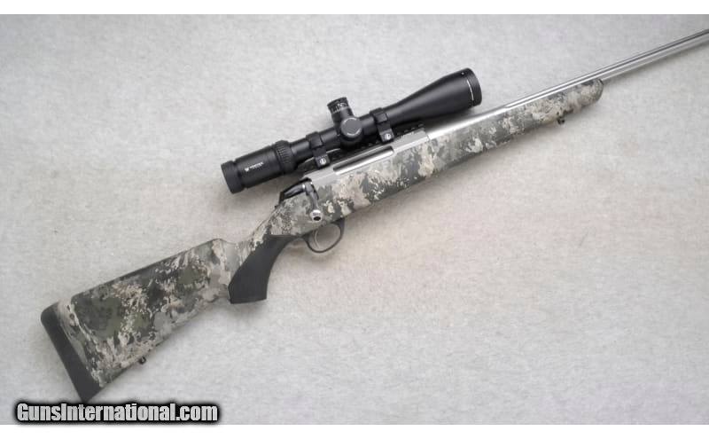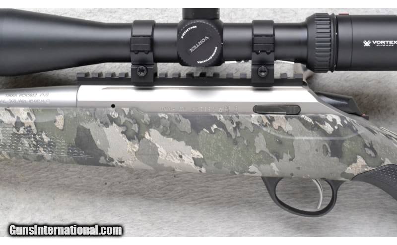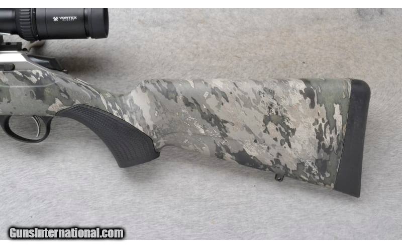 Description: This Tikka Model T3x is a right hand bolt action rifle in .308 Win. Cal. It has a 22.5 inch fluted matte stainless steel barrel. It is outfitted with a Vortex Viper 4-16x44 Scope. The butt stock is a textured black polymer grip in a composite pistol grip in camo. The forearm is a textured grip composite with finger grooves in camo. .308 Winchester SOLD Chambers: Detachable Magazine. Metal Condition: Excellent. Bore Condition: Excellent. Barrels: 22.5 inch fluted matte stainless steel. Stock Dimensions: LOP 13 3/4 inches. Fore End: Textured grip composite with finger grooves in camo. Butt Pad: Tikka black rubber recoil pad. Weight: 7 lb. 8 oz. Sights: Vortex Viper 4-16x44 Scope. Item Location: Richfield, WI |