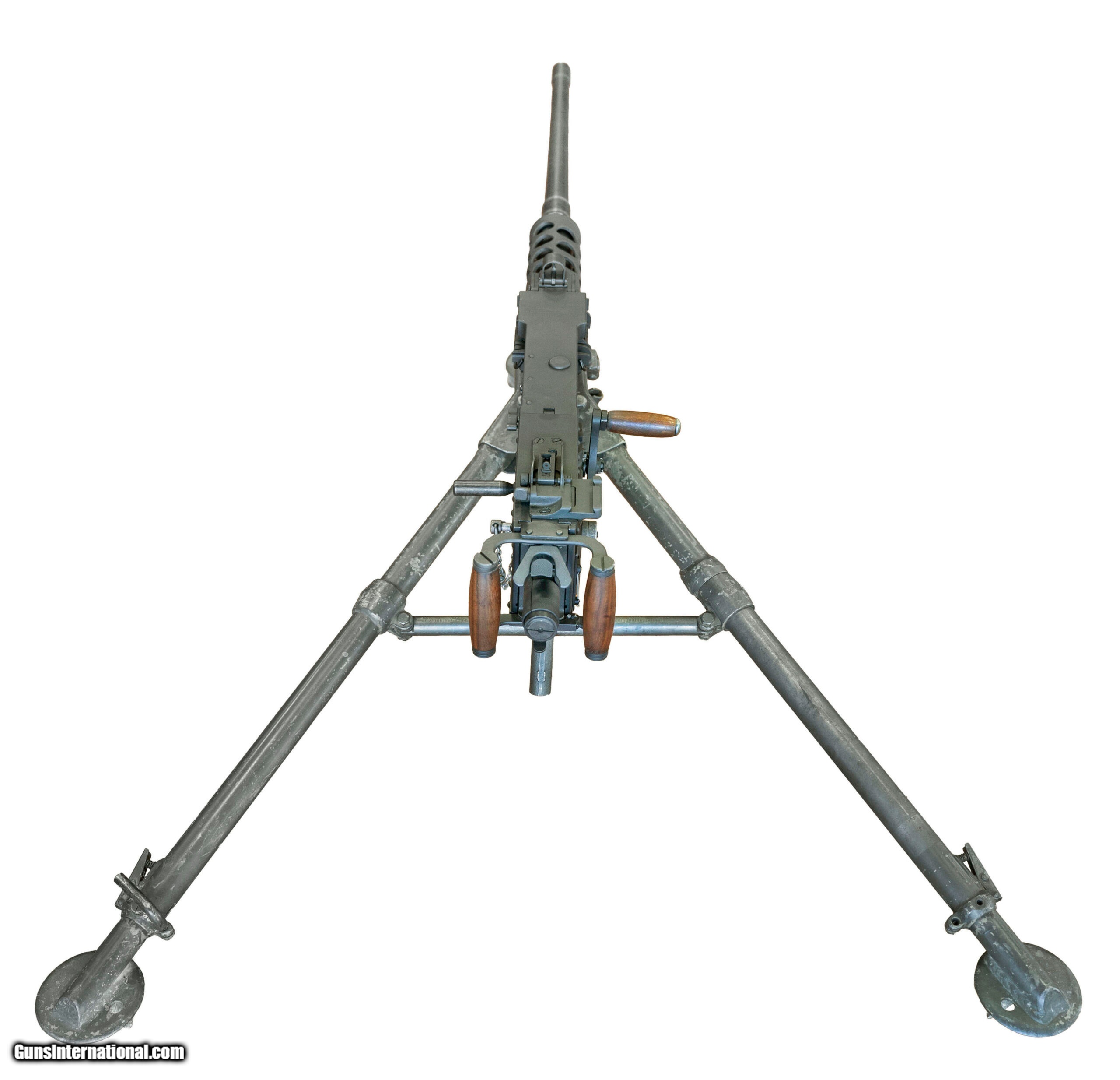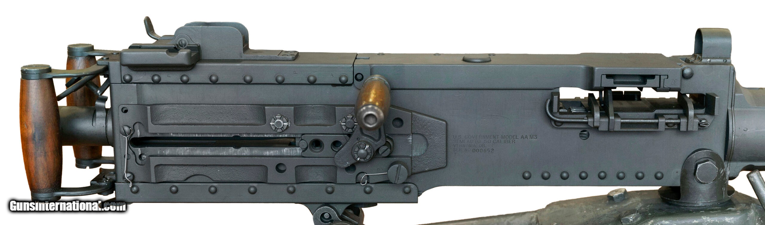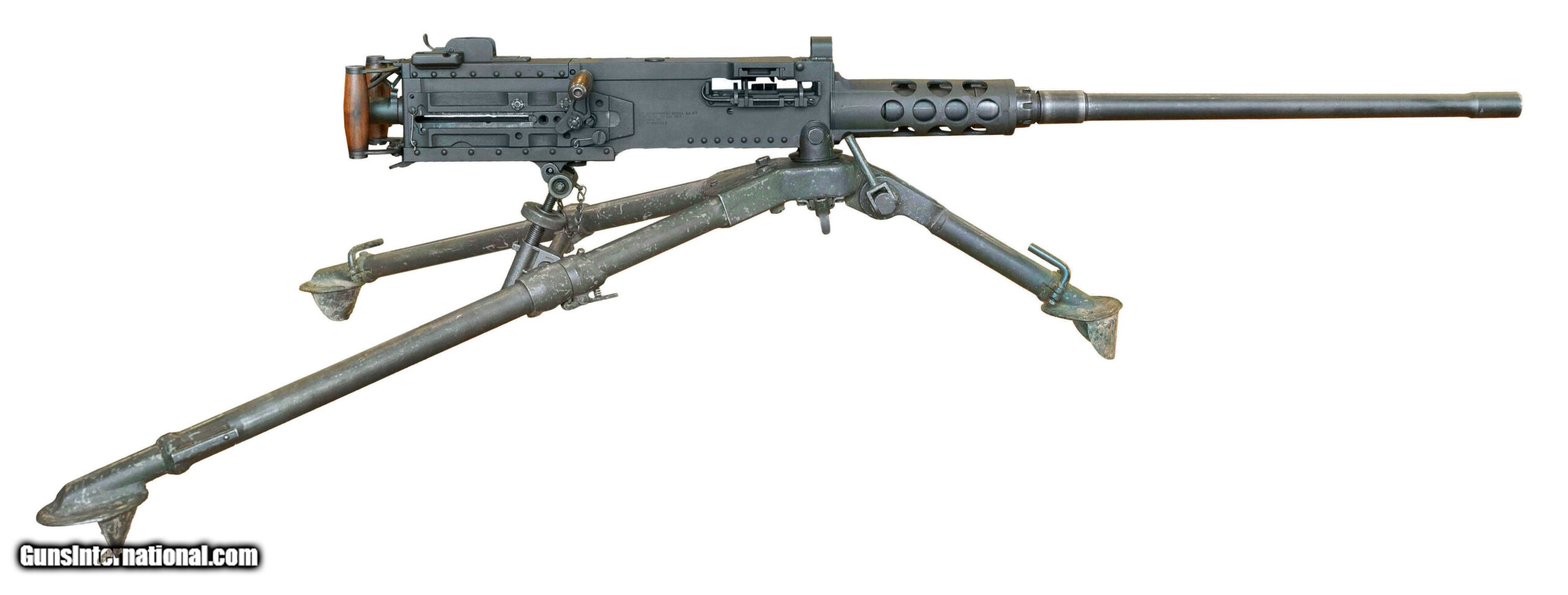 Description: "SN: 000652. Made in 2001 with a 45-inch USGI surplus heavy barrel chambered for the .50-caliber cartridge. This is a semiautomatic clone of the Browning M2HB heavy machine gun that was made using surplus M2/M3 parts & a modern side plate. The top cover was made by FN Herstal & the rear sight assembly incorporates a dovetail for mounting optics. Comes with a spare USGI barrel, a USGI traverse/elevation mechanism, a USGI belt-loader & a USGI M3 tripod that was refurbished by Anniston Army Depot in January 1972. Overall condition is very good. *Additional shipping fees apply. SOLD |