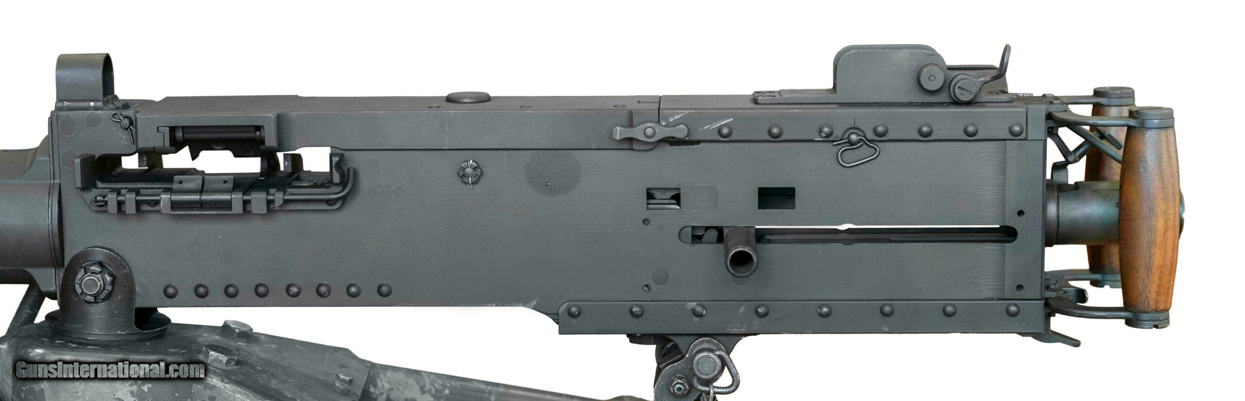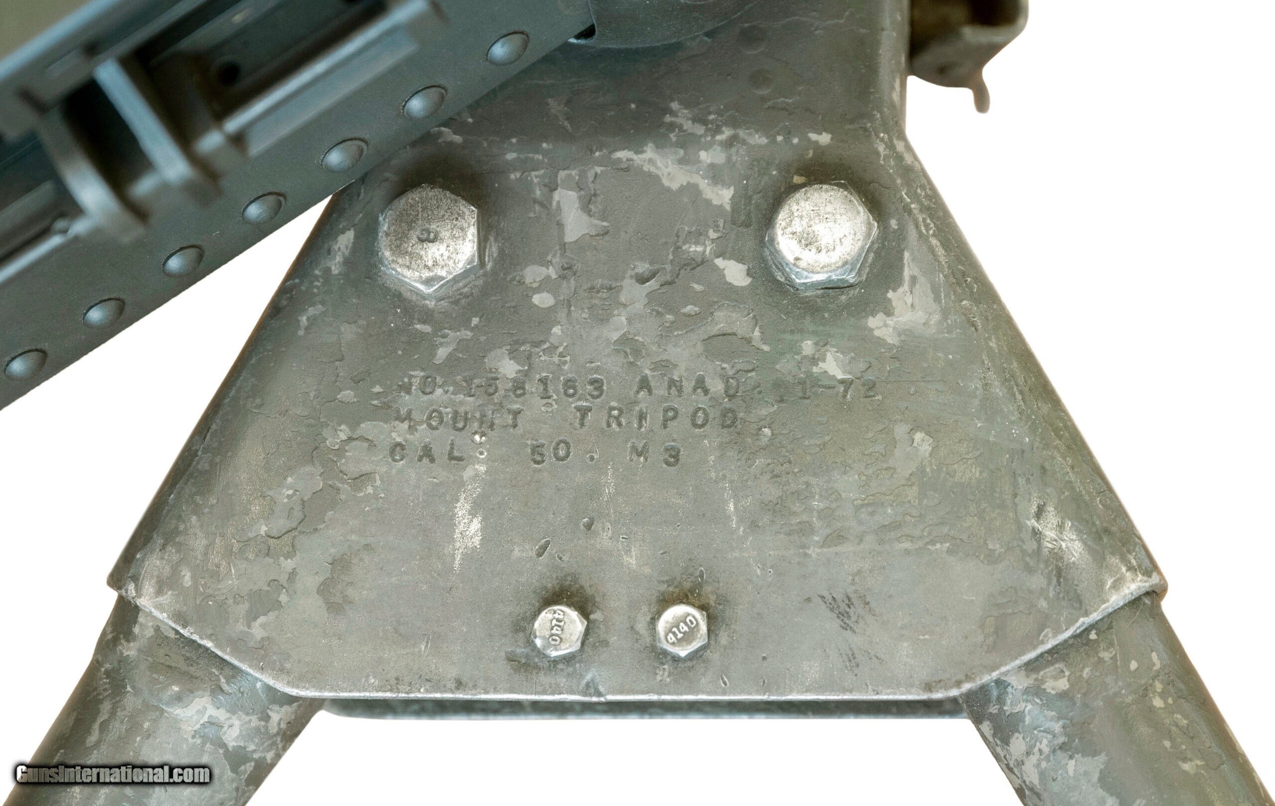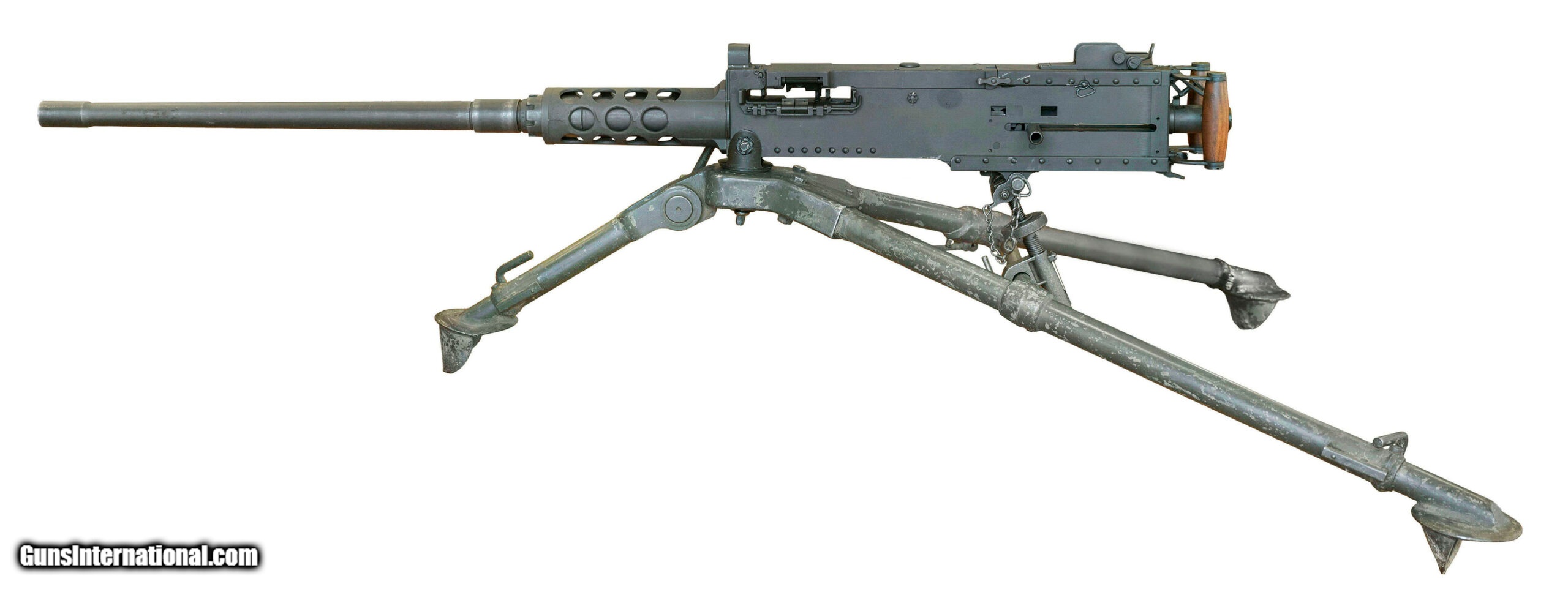 Description: "SN: 000652. Made in 2001 with a 45-inch USGI surplus heavy barrel chambered for the .50-caliber cartridge. This is a semiautomatic clone of the Browning M2HB heavy machine gun that was made using surplus M2/M3 parts & a modern side plate. The top cover was made by FN Herstal & the rear sight assembly incorporates a dovetail for mounting optics. Comes with a spare USGI barrel, a USGI traverse/elevation mechanism, a USGI belt-loader & a USGI M3 tripod that was refurbished by Anniston Army Depot in January 1972. Overall condition is very good. *Additional shipping fees apply. SOLD |