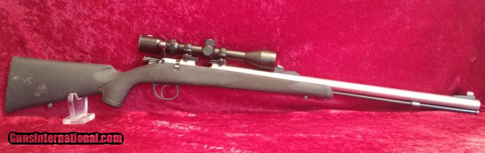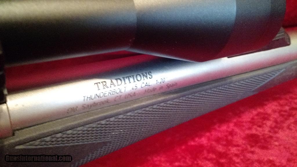 Description: Traditions Thunder Bolt .45 This rifle offers all the features of guns that are twice the price. The stainless steel offers strength and corrosion resistance, reliable use regardless of what conditions Mother Nature throws at you. Comes with a 3x9 Bushnell Scope and front/rear fiber optices sights! The Stainless plus Syn. Stock makes this a great All-Weather Tool.