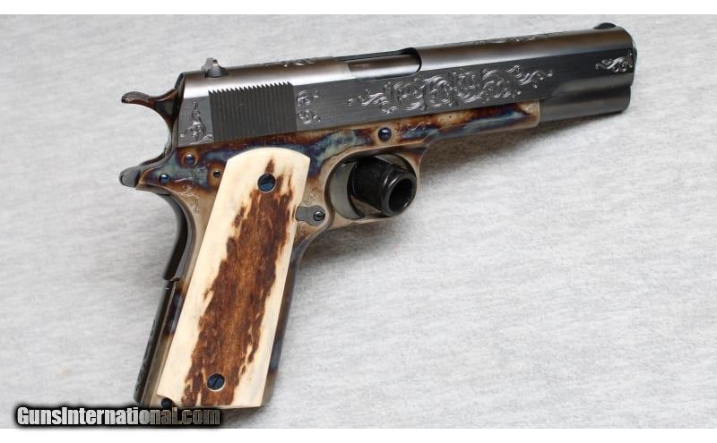 Description: Appears as new with 2 mags and factory hard case. A superb example of custom pistolsmithing - outstanding engraving and case coloring, with stag grip panels. Fit and finish is spectacular, smooth front strap and mainspring housing, case colored hammer, fire blued safety lever and slide stop. This pistol appears to have most of the features of Turnbull's "BBQ" series of 1911 pistols. .45 Auto SOLD Chambers: semi auto Metal Condition: As new Bore Condition: Bright Barrels: 5 Triggers: Single action Butt Pad: Stag grips Sights: Iron sights Item Location: La Vista, NE |