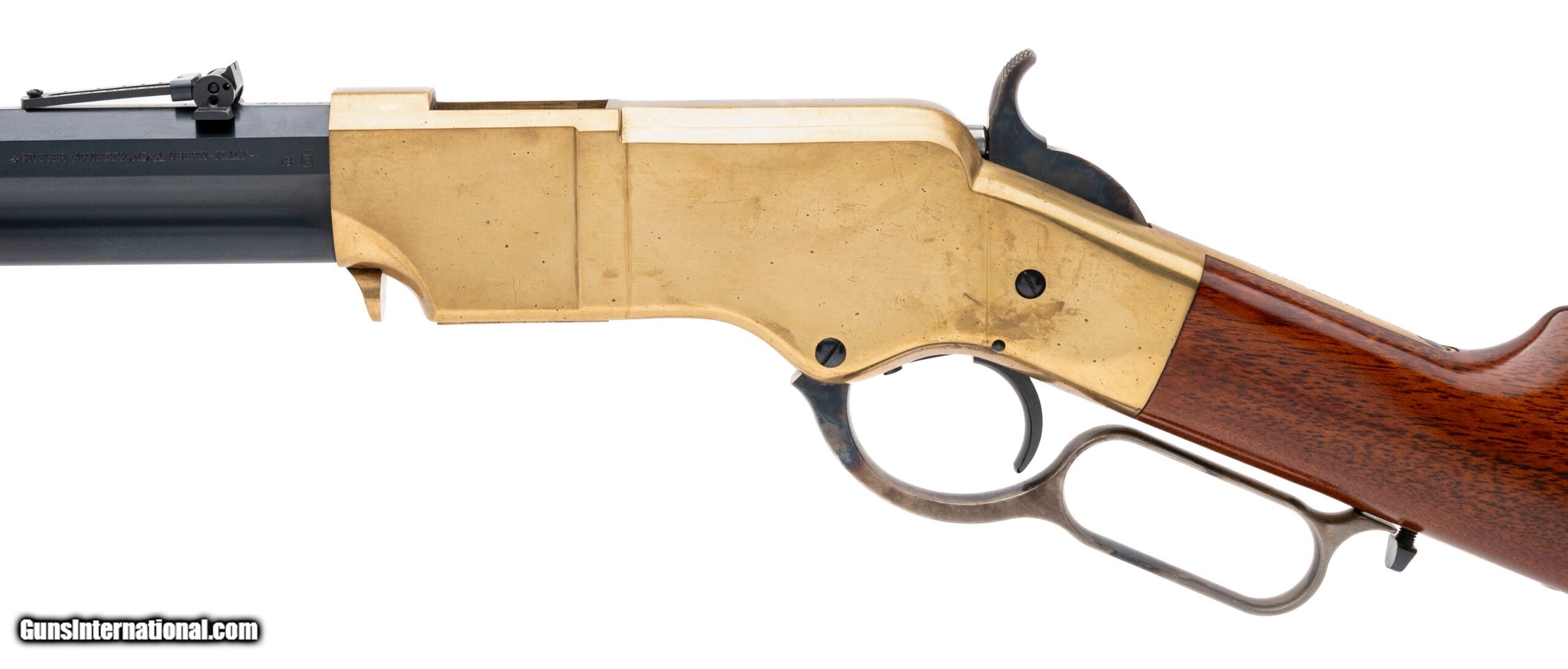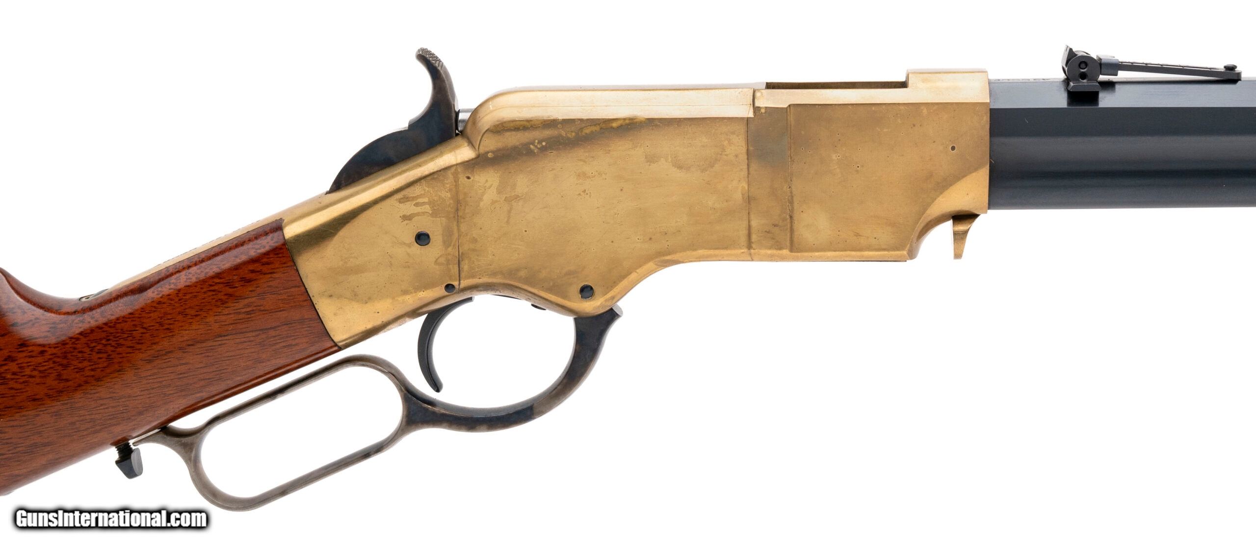 Description: "SN: W36676. Modern production, .45 Colt with a 18.5"" octagon barrel. Bore is excellent. Italian made lever-action rifle with bladed front sight, adjustable rear sight, brass receiver w/case color hardened accents, blue finished barrel, and wood stock w/brass butt plate. Finish and stock show minor handling marks. Overall condition is very good. SOLD |