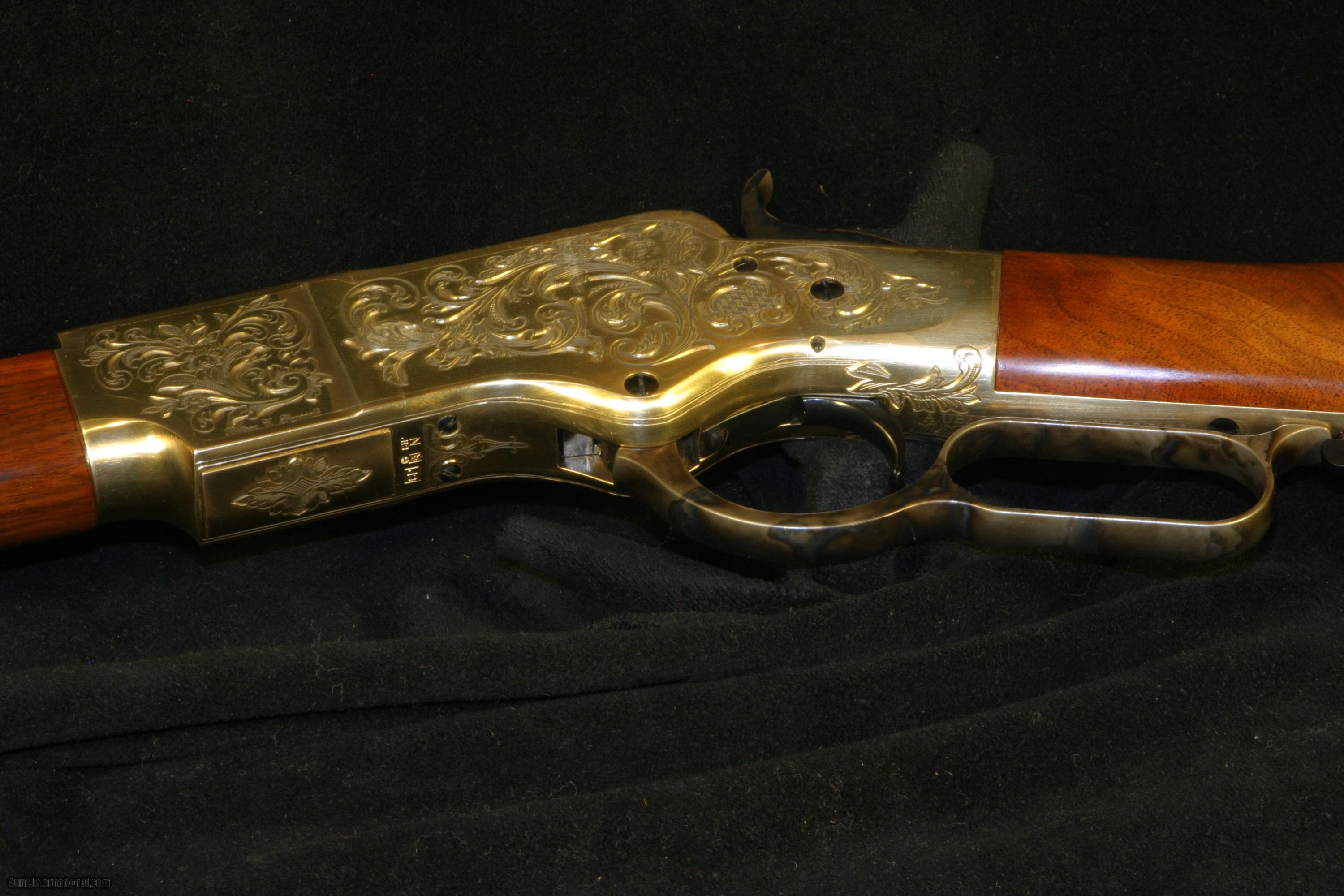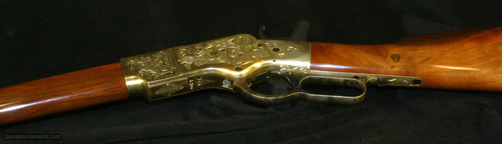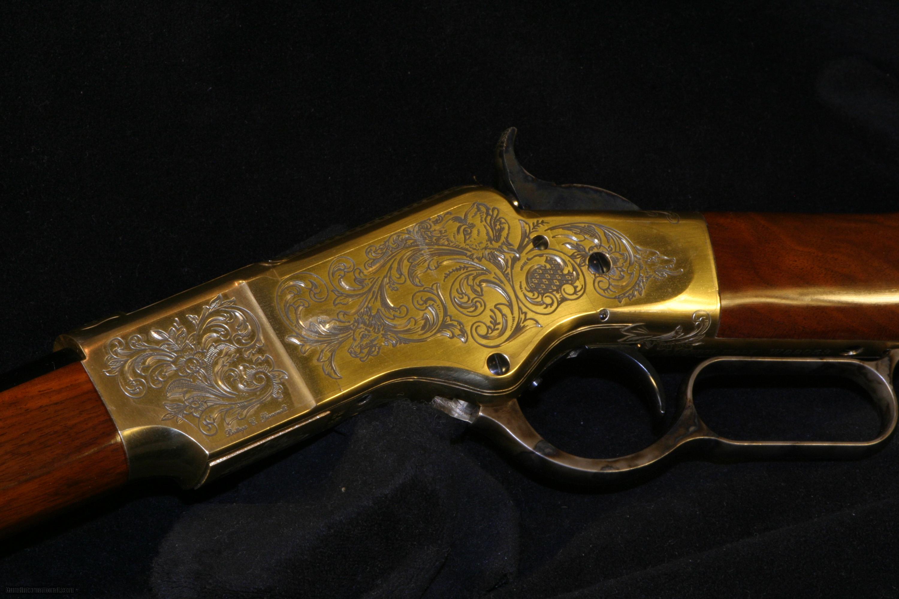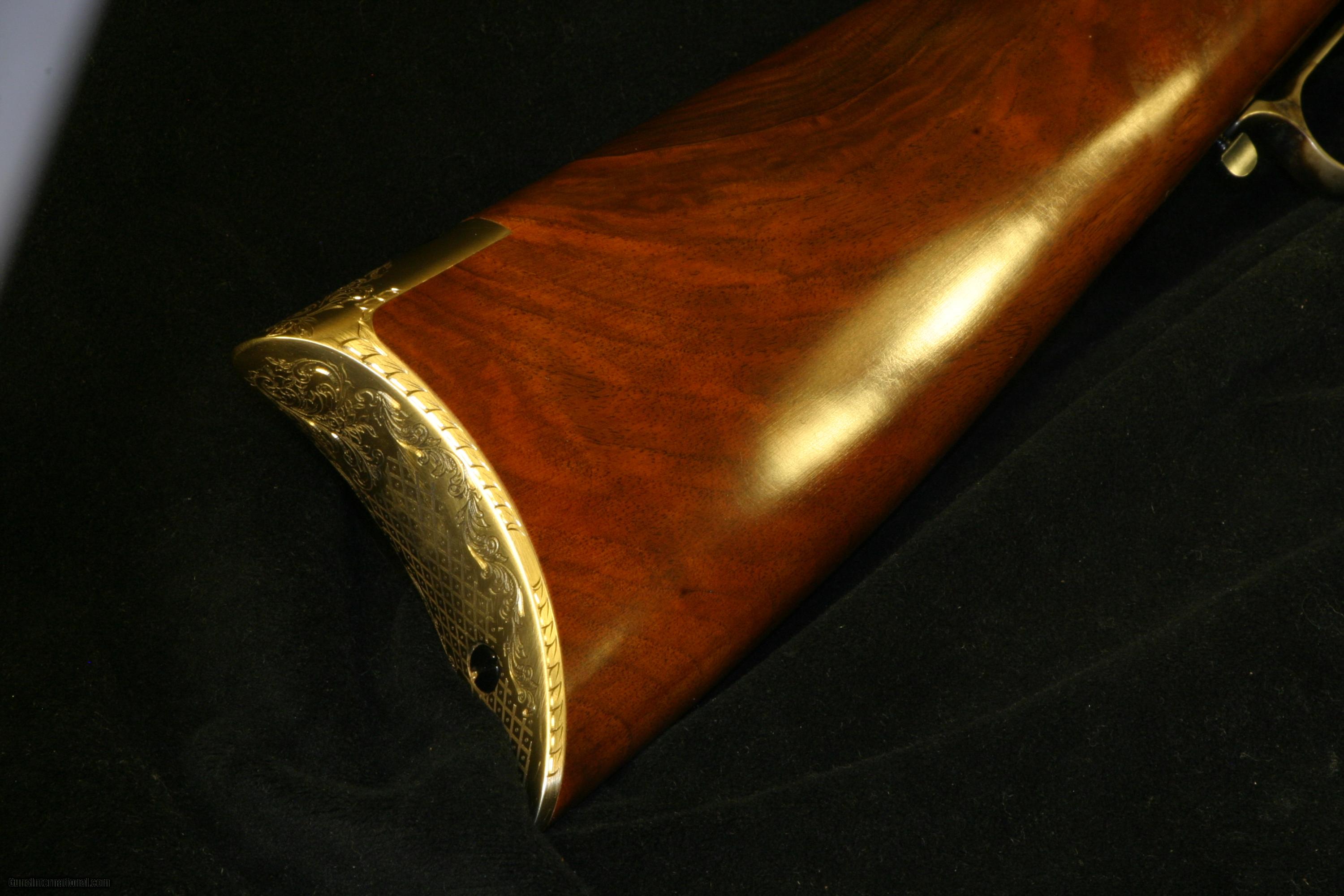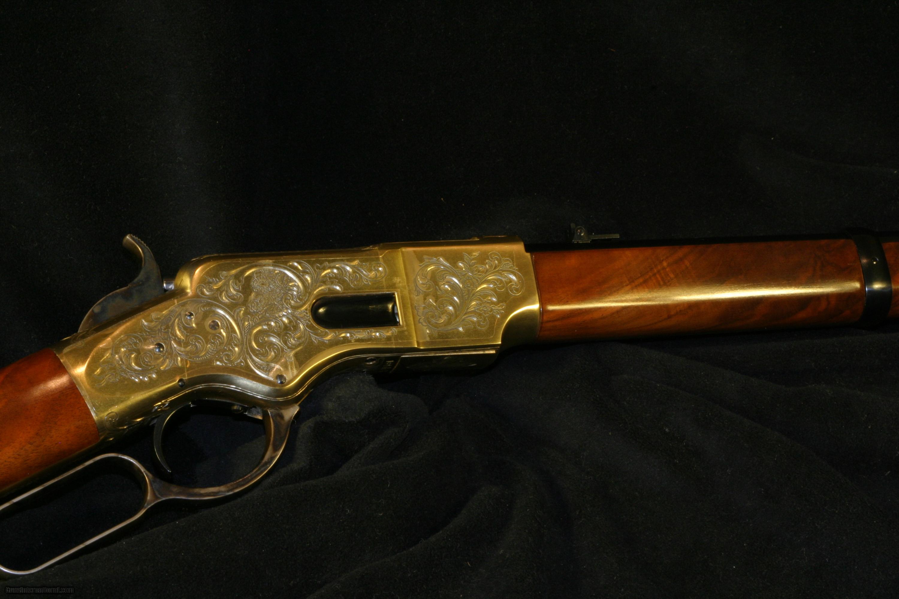 Description: Short Rifle,factory engraved,The 1866 Flatside Short Rifle limited edition is Uberti’s way to celebrate the 150th anniversary of the creation of the Winchester Yellowboy. It has the transitional flat-sided receiver of the very earliest 1866 rifles, a unique shape that disappeared in the course of the year 1866. .45 Colt 20″Brass Frame and Buttplate, C/H Lever SOLD |