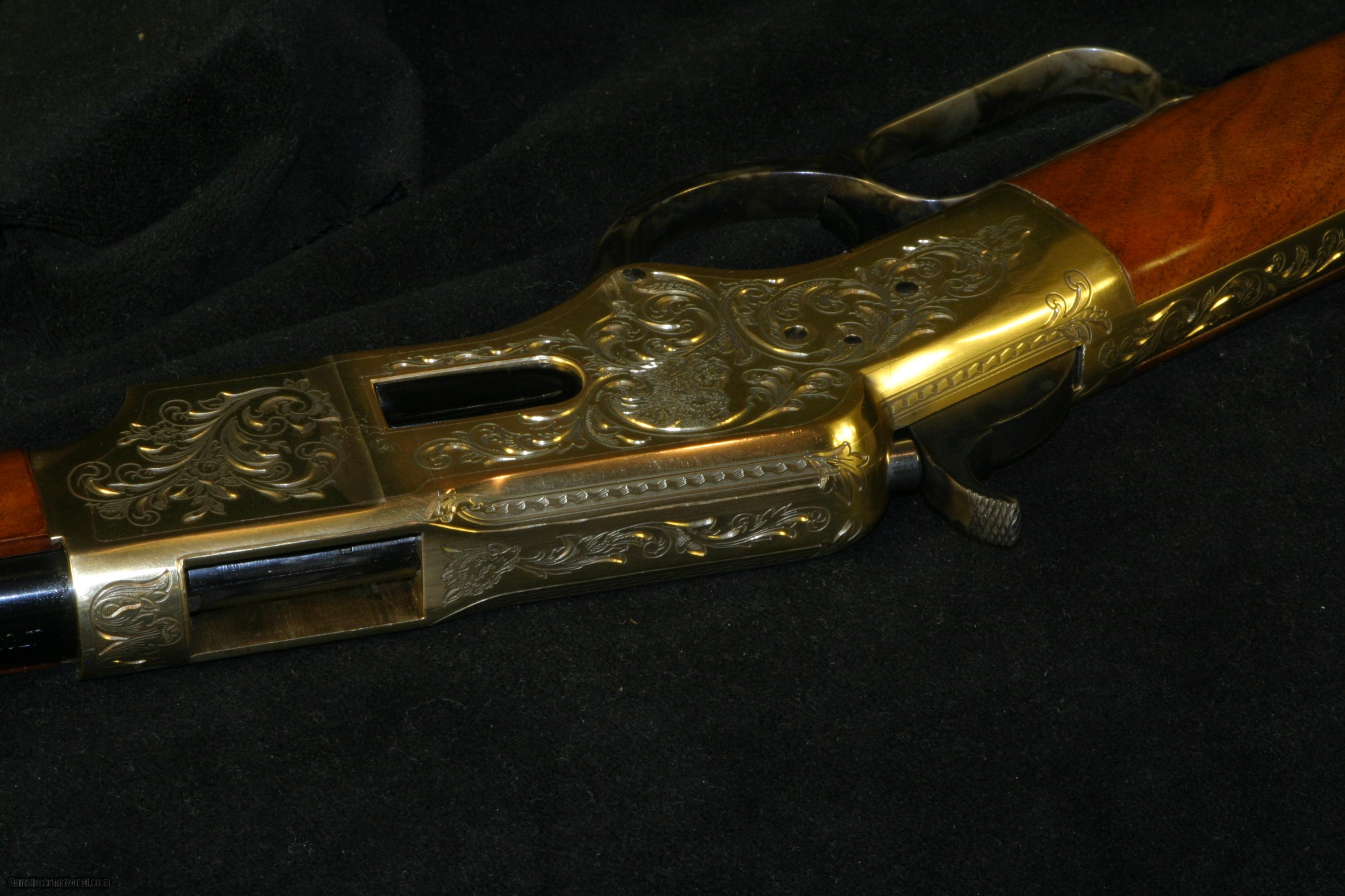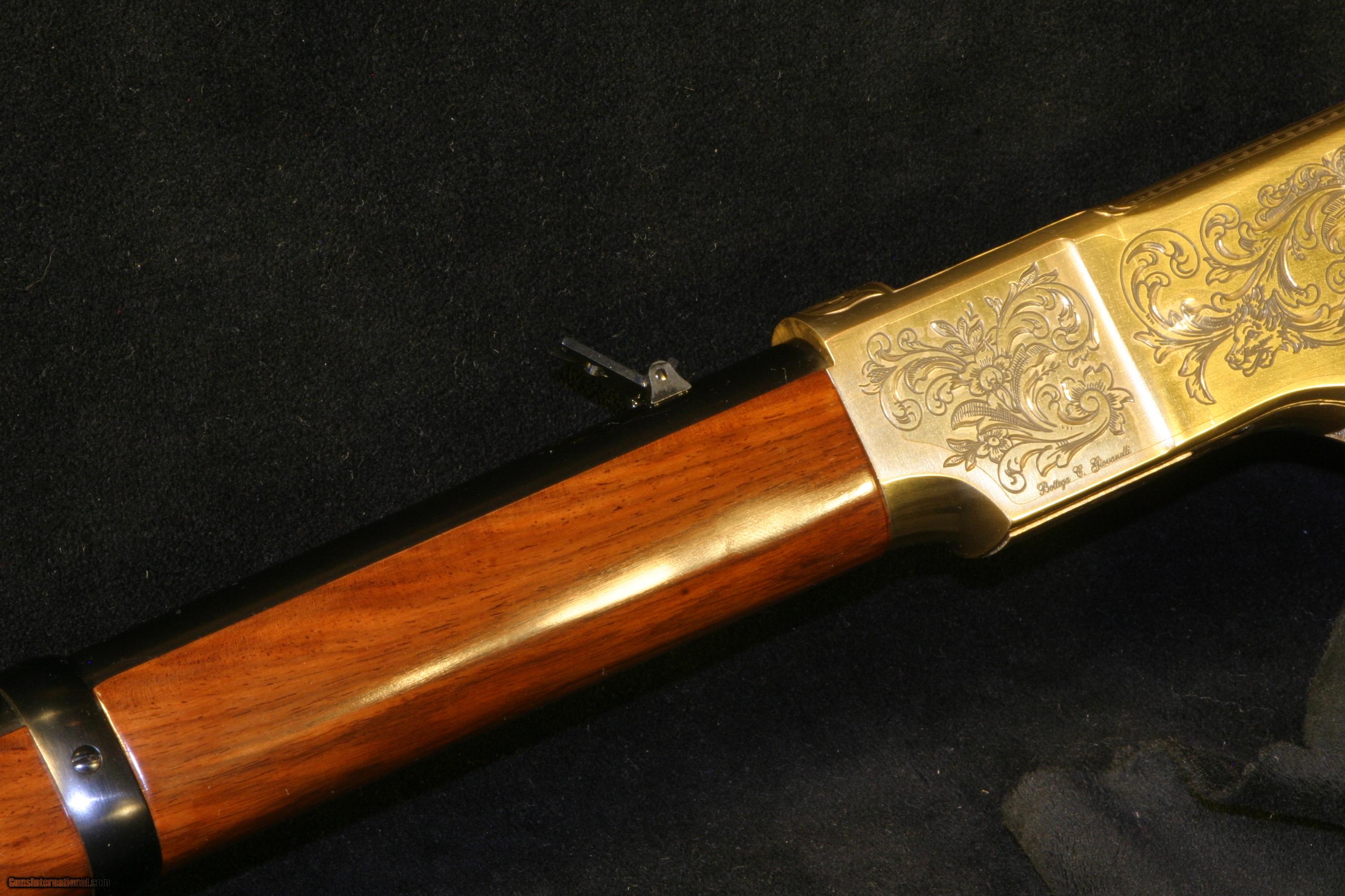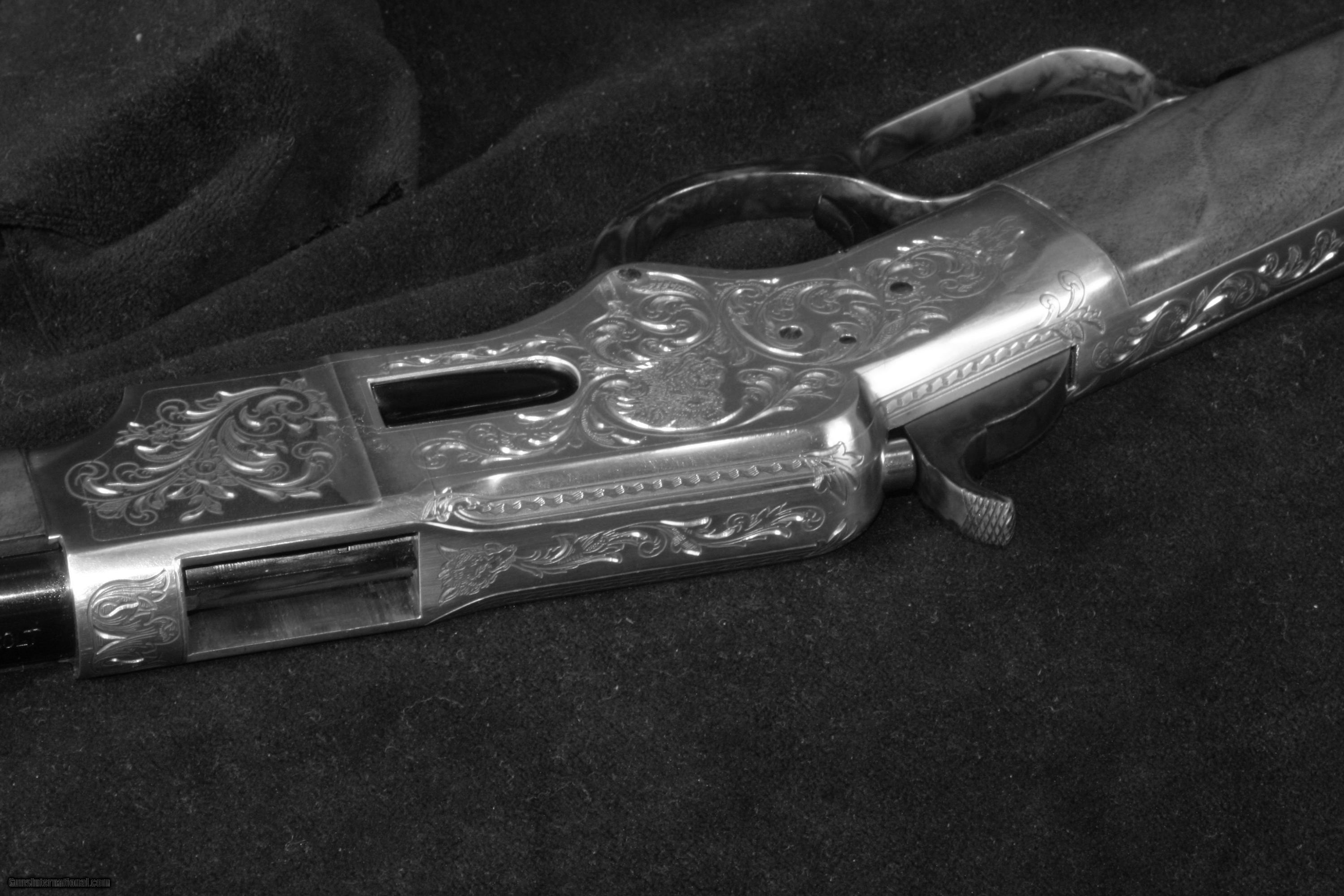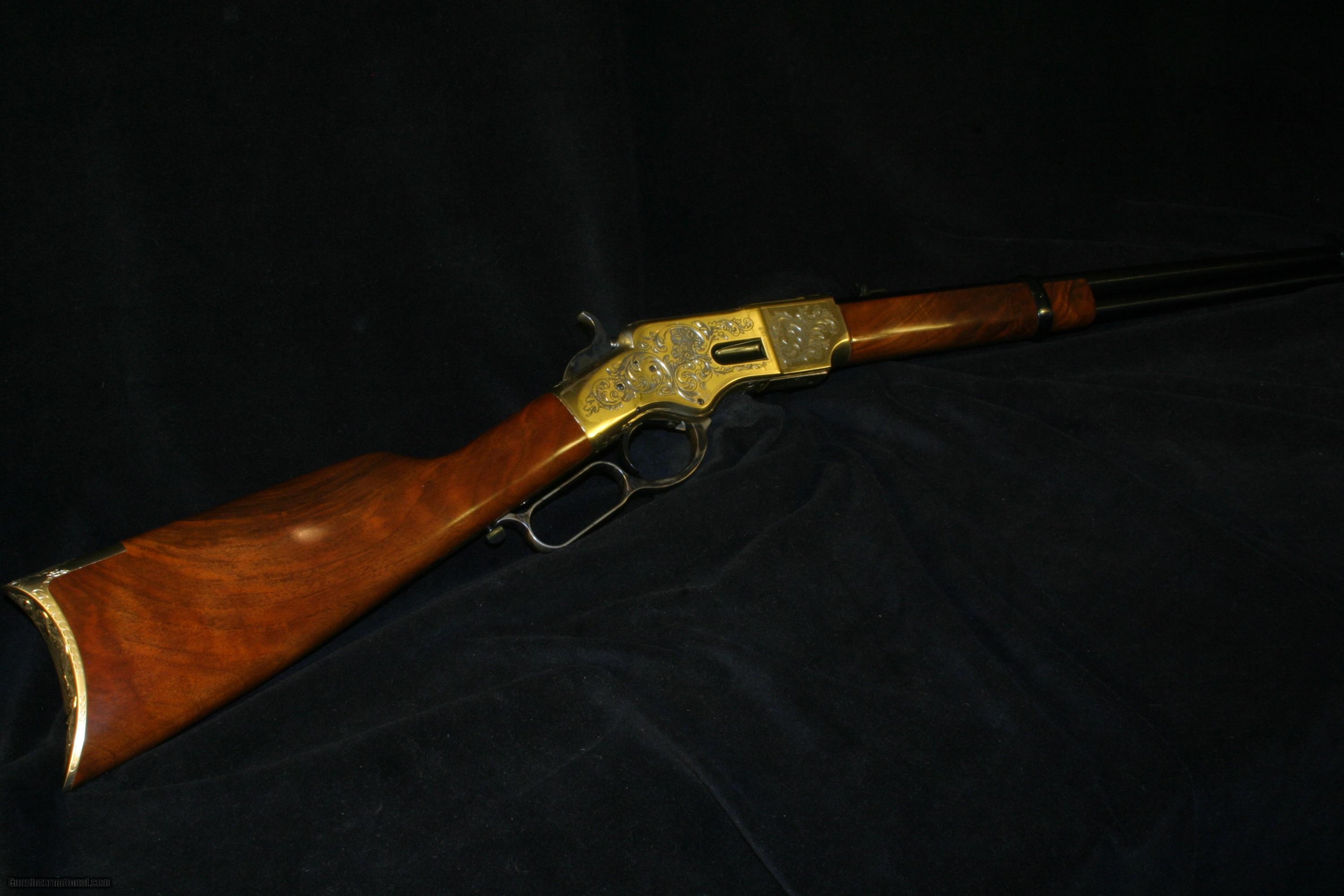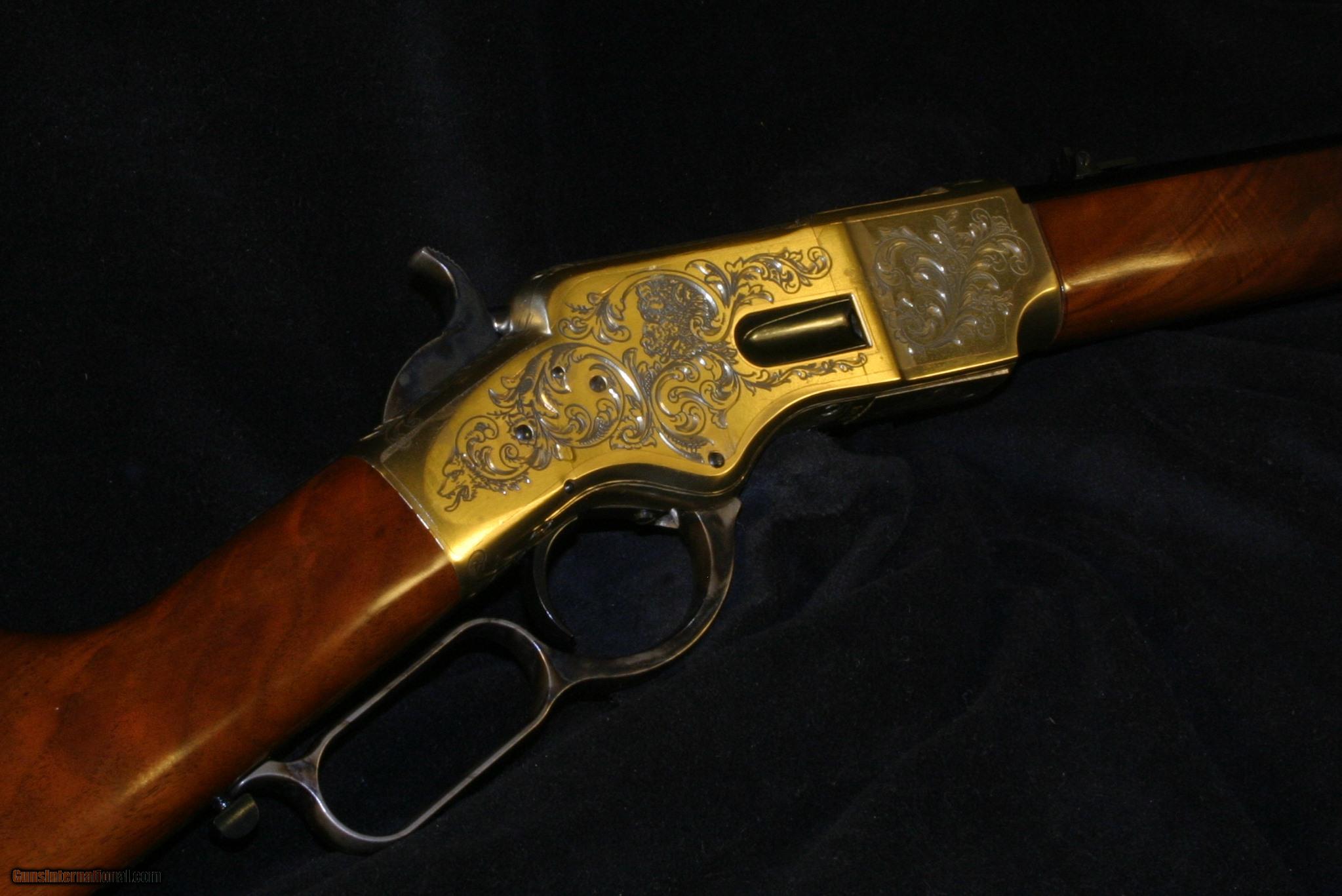 Description: Short Rifle,factory engraved,The 1866 Flatside Short Rifle limited edition is Uberti’s way to celebrate the 150th anniversary of the creation of the Winchester Yellowboy. It has the transitional flat-sided receiver of the very earliest 1866 rifles, a unique shape that disappeared in the course of the year 1866. .45 Colt 20″Brass Frame and Buttplate, C/H Lever SOLD |