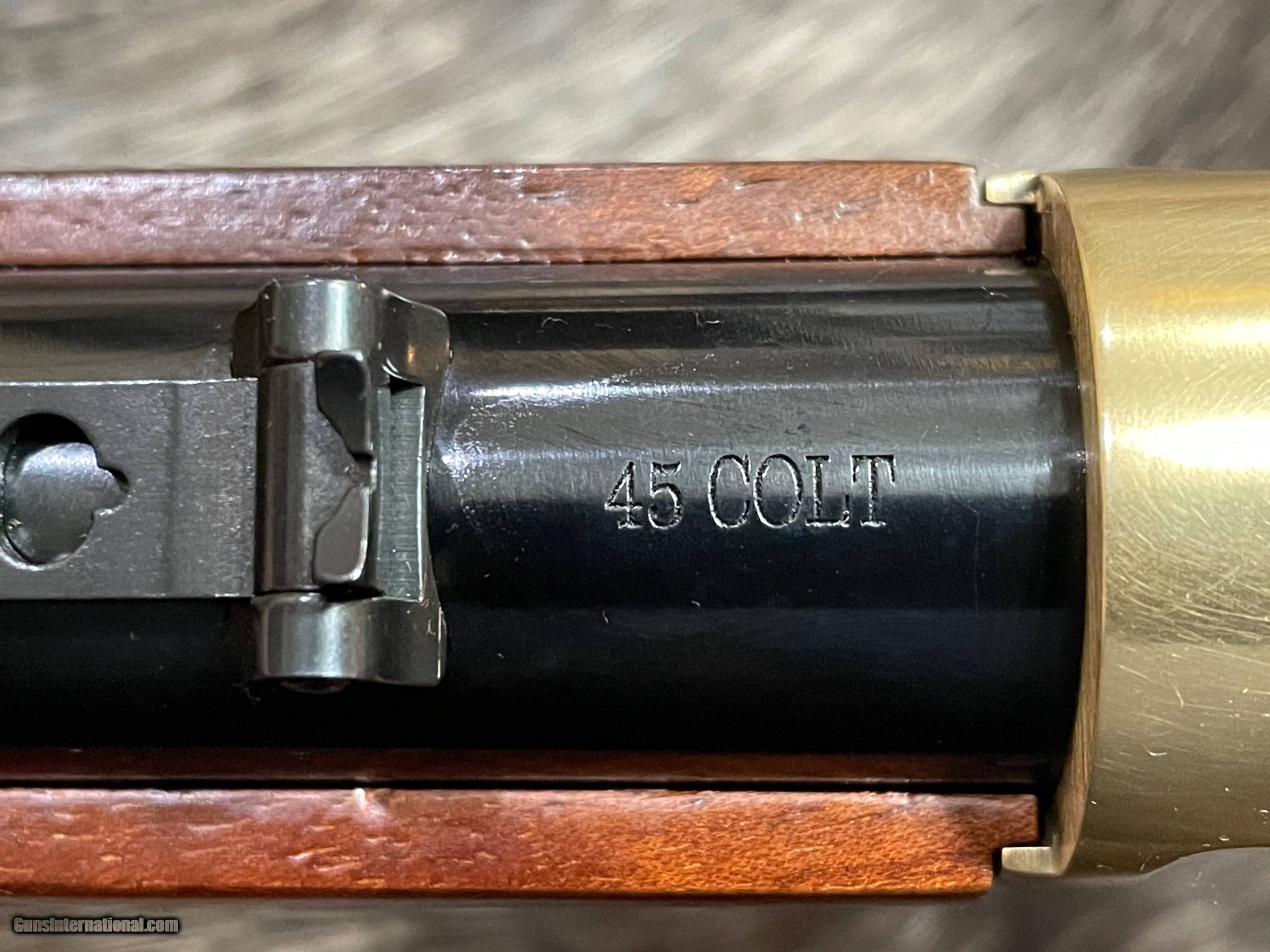 Description: NEW 1866 WINCHESTER YELLOWBOY SADDLE RING CARBINE 19" IN 45 COLT WITH BEAUTIFUL WOOD STOCK BY UBERTI / CIMARRON - LAYAWAY AVAILABLE. UNLIKE OTHER SELLERS, JD OUTFITTERS DOES NOT USE STOCK/GENERIC PHOTOS OR DROP-SHIP FROM A THIRD-PARTY. THE RIFLE YOU SEE IS IN JD OUTFITTERS’ INVENTORY, IS READY TO SHIP, AND IS THE RIFLE YOU WILL RECEIVE! Features Of This GREAT Lever Action Rifle Include: