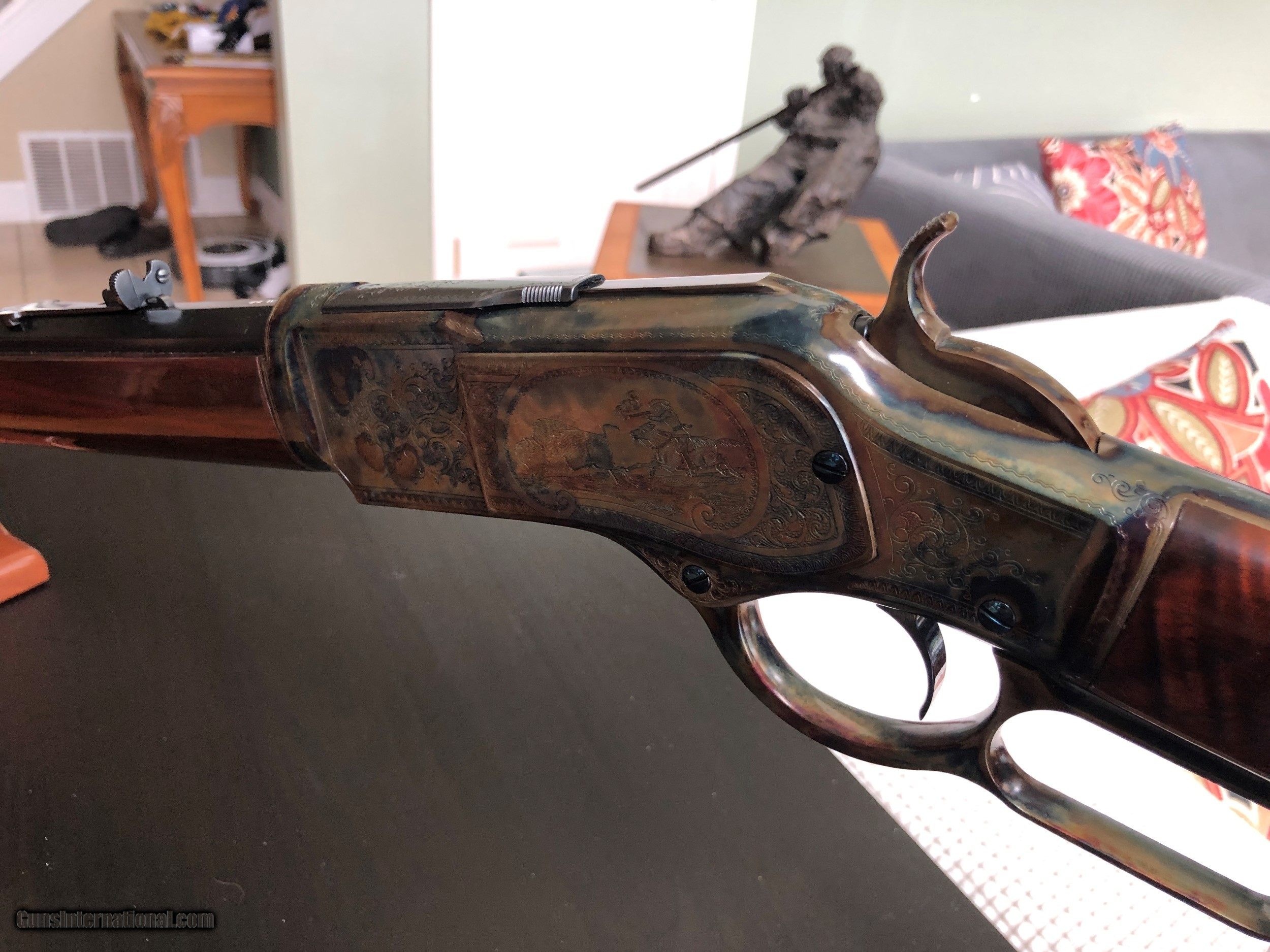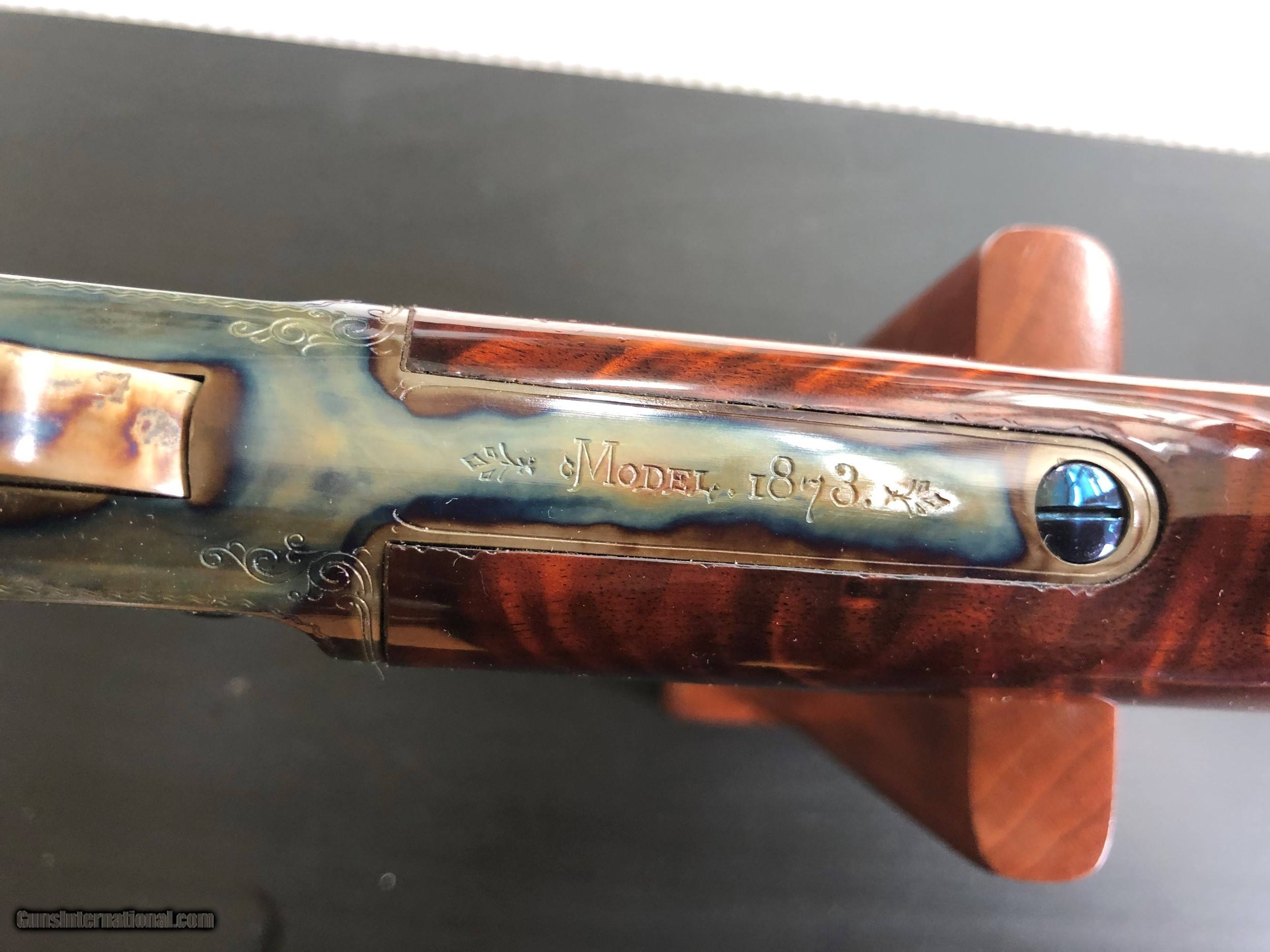 Description: SALE PENDING This stunning Uberti Cimarron lever action rifle was purchased new in 2001. The owner sent it back to Italy for factory engraving. It was then sent to Doug Turnbull Restoration in New York for color case work. The photos do not do this rifle justice. It was unfired when I bought it and I've fired six shots through it. It has the smoothest lever action I've experienced. This Model 1873 Sporting Rifle and Carbine is in .44 WCF 44--40 with a 24" barrel. It is as new with papers and receipts. No box. I'm retired law enforcement but not a dealer. I'm liquidating my private collection and am not accepting trades. I will ship only to your FFL dealer. Payment Type Accepted: USPS Money Order or Cashier's Check Please add $70 for shipping and insurance to Lower 48. SOLD Rifle Caliber: .44-40 Winchester Manufacturer: Ubertti Model: Winchester 1873 Serial Number: 85876 Barrel Length: 24 Caliber Info: 44WCF 44-40 Bore: As New Condition: Used as New Metal Condition: As New Wood Condition: As New Bore Condition: As New |