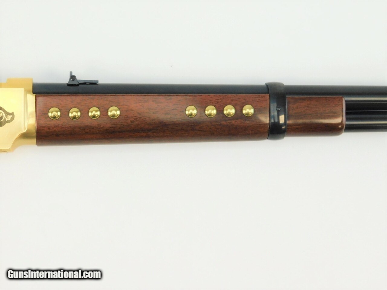 Description: Manufacturer: Taylor's & Co. Model: 1866 Carbine Indian Engraved SKU: 550029 Caliber: .45 Colt Barrel Length: 19" Capacity: 10 Rounds Receiver: Brass Engraved Stock: Walnut, Gold Nail Heads on Stock and Forend Overall Length: 37.87" Sights: Rear Ladder Sight With Front Blade On Barrel Band Features: Mounted Saddle Ring Weight: 7.5 lbs All items are factory new in box unless otherwise stated. Based on the information available to us, the above specifications describe this item to the best of our knowledge. For further information, please contact or visit the manufacturer's . SOLD |