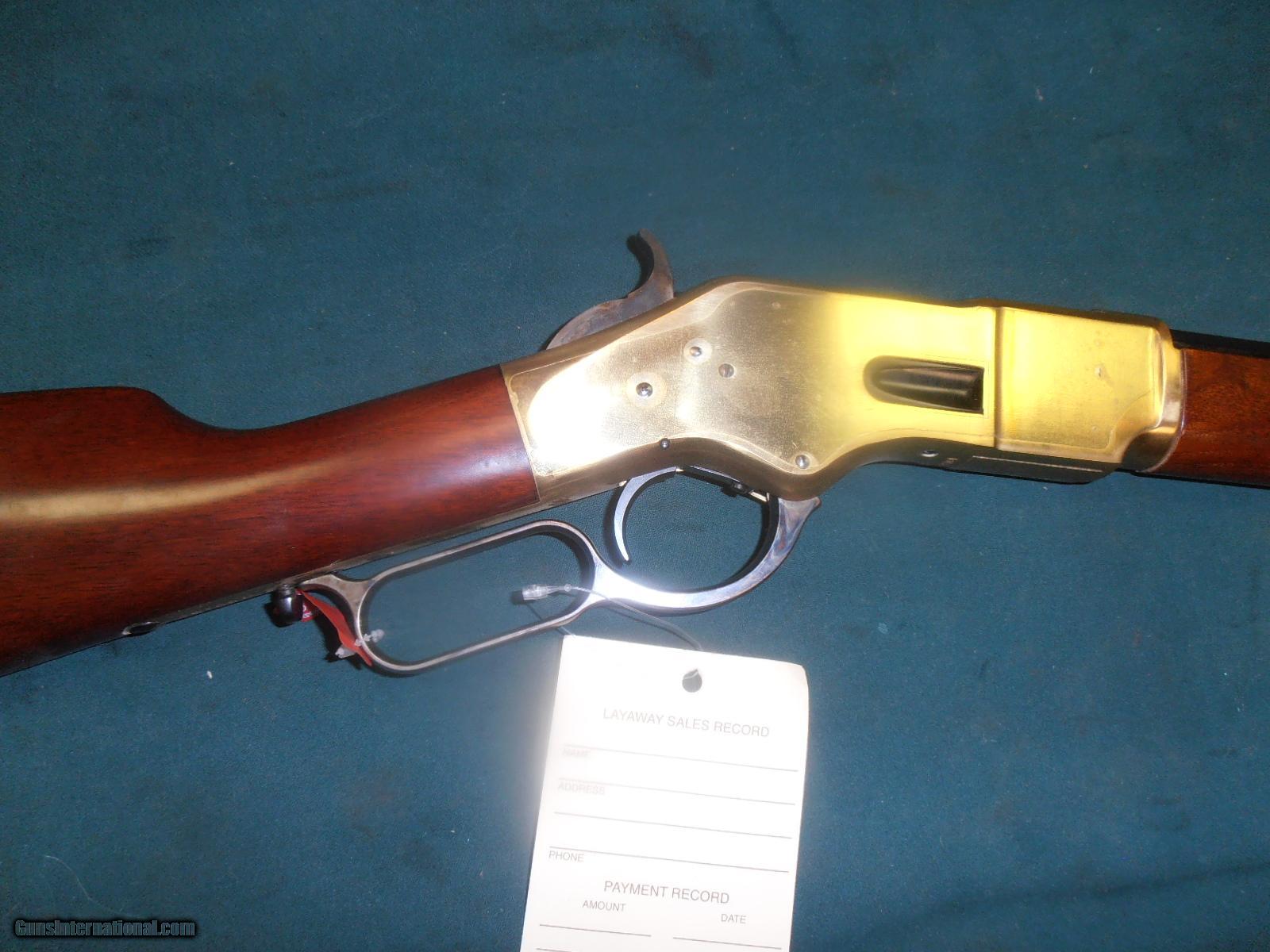 Description: Brand new, Uberti 1866 with a 24.25" barrel, 45 LC, new in box. Factory part number is 342290. Email me if you would like these pics sent to you, they will come through bigger and better than on the listing page here. Email me with any questions. I am a store front dealer, and I will close s if the gun sells locally. Once ahas reached my reserve, I will pull it from my shelves. Please check your local laws to confirm it is legal to own in your state! Buyer pays $25 shipping and insurance to your FFL, in the lower 48. AK, HI or PR is extra. I will ship to California, NO PROBLEM! All my guns come with a non firing, 3 day unconditional return privilege, from the day UPS delivers to your dealer. Buyer pays shipping both ways if the gun comes back. I can add a new hard case by PLANO for secure shipping for $25 if the buyer wishes (highly recommended, cheap insurance, really helps keep the UPS monster from eating my guns!). No sales tax on guns ship out of Kansas, guns sold in Kansas are subject to Kansas sales tax. I am a licensed FFL, and will include a copy of my FFL with the gun for your dealers records. I will ship to a C&R if the gun is eligible (you look it up!). I will ship to California, but you need to confirm the gun is legal where you are, California or other. I am always looking for good clean, old original Winchesters to buy, consign, or trade, especially pre '64's model 70's and model 54's. WE ALSO TRADE FOR CLASSIC CARS AND TRUCKS! I will leave feedback as soon as the buyer leaves feedback on me. Email me with any questions, and good luck! SOLD |