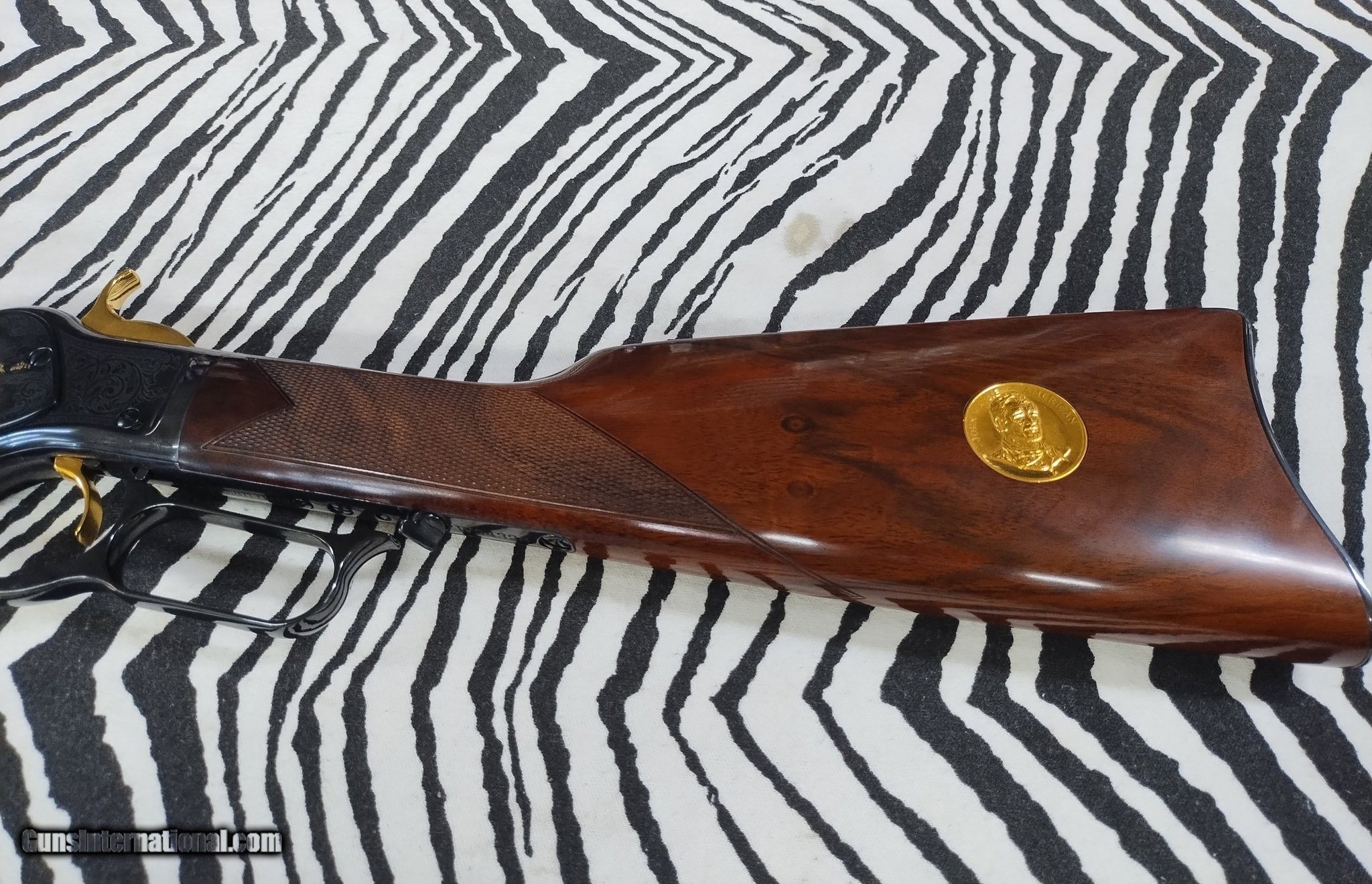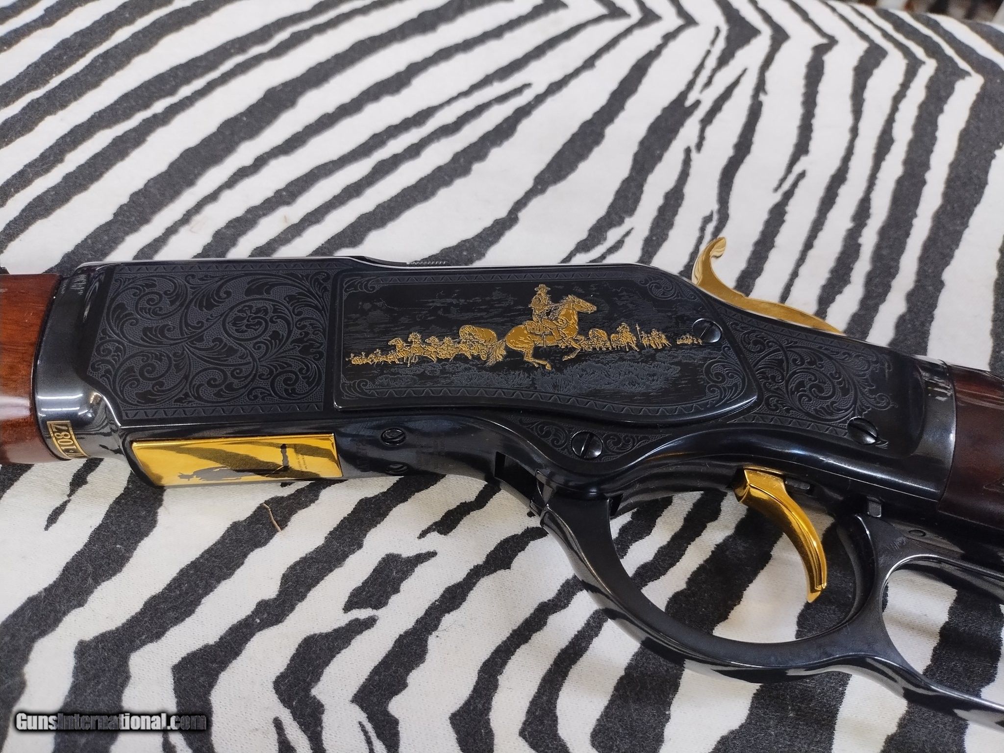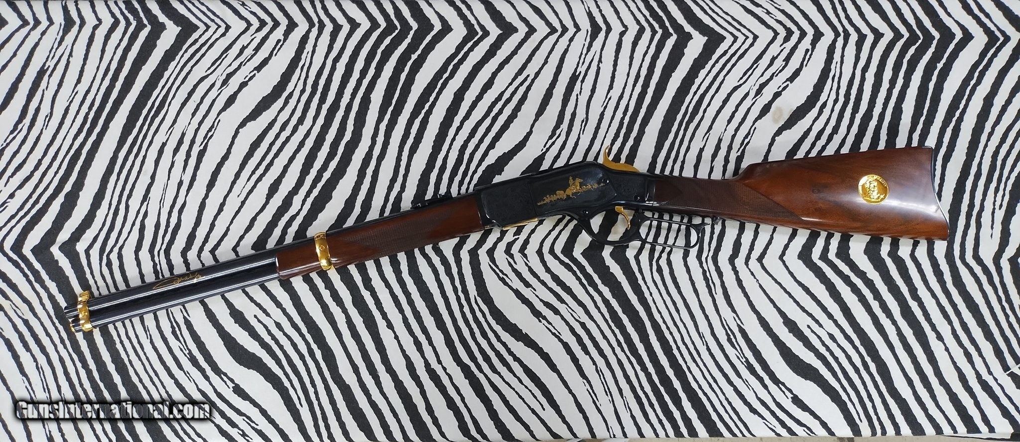Description: Guns Listing ID: 560214 This is the America Remembers Uberti 1873 John Wayne Tribute Rifle. Only 3500 were produced in the run. The left side of the barrel features John Wayne’s signature, and inset into the polished walnut stock is a 24-karat gold-plated medallion with John Wayne’s portrait, along with the legend “John Wayne – American". The handsome walnut stocks are checkered on this John Wayne commemorative rifle and finished to a high gloss, and the hammer and trigger are polished and decorated in 24-karat gold. The right side of this John Wayne rifle features a scene familiar to every fan of Western classic. In it, John Wayne leads the U.S. Cavalry through the buttes and dry gullies of desolate Monument Valley. Above the scene flies a banner that reads “John Wayne." The left side of the receiver features John Wayne as a wagon train scout, leading settlers and a cavalry escort through Apache territory. this scene was taken from the paining, “Under Attack," by famed Western artist Frank McCarthy. If you look closely, you will see a rifle in John Wayne’s right hand! SOLD Manufacturer: UBERTI Model: 1873 Caliber Info: .45 LC Condition: Used - Non-Certified Barrels: 19 BARREL Action: LEVER ACTION Finish: BLACK ENGRAVED |