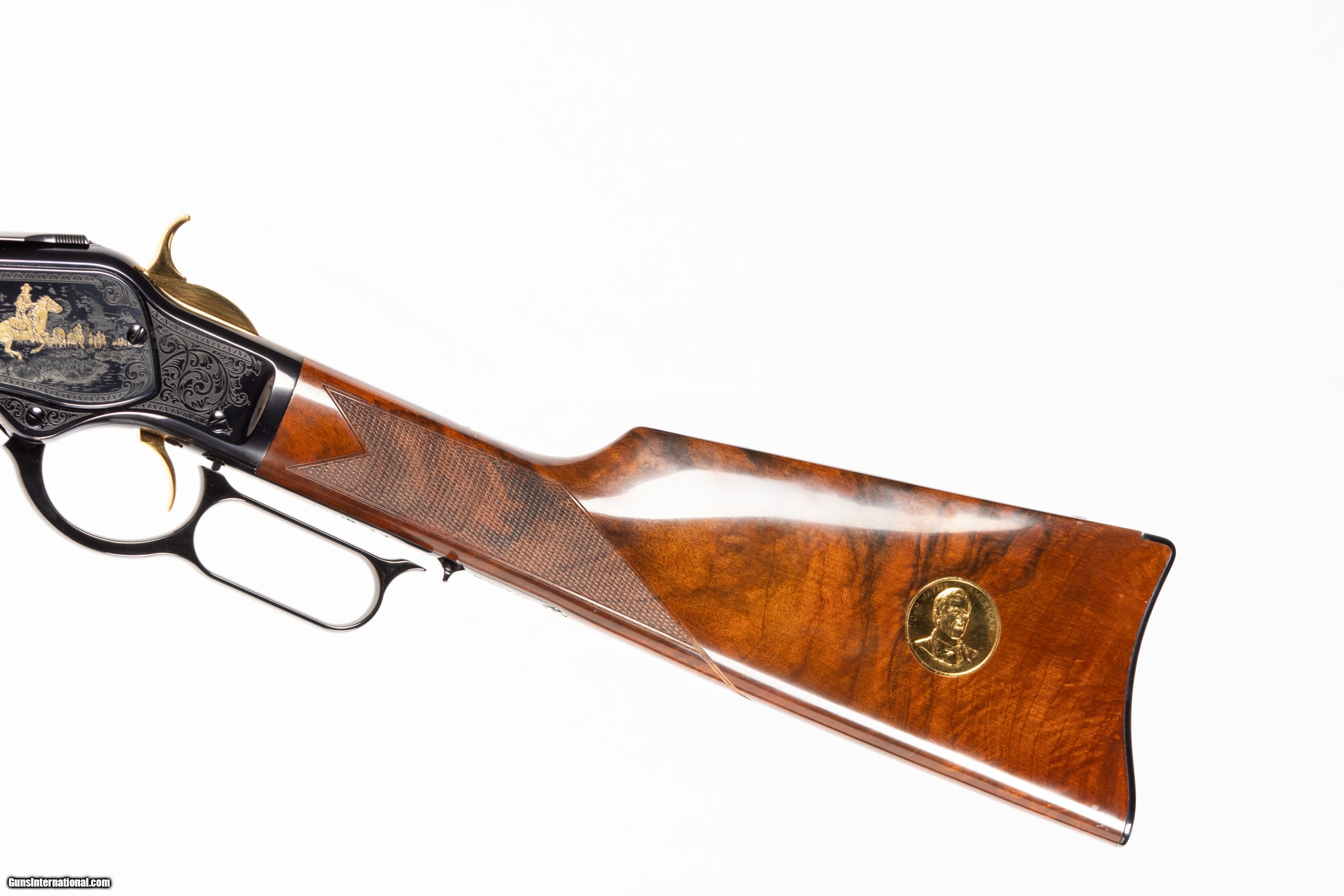 Description: Uberti 1873 John Wayne Commemorative chambered for 45 LC with a 19 inch barrel and a bright & shiny bore. The receiver features floral engraving on the left with a scene of John Wayne riding a rearing horse and John Wayne leading a posse on the right side. There is golden medallion in the fancy checkered walnut stock and a gold signature on the barrel. This firearm is in excellent condition and is covered by Dury's Lifetime Warranty.