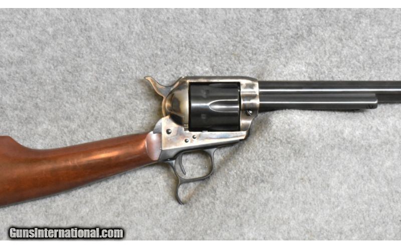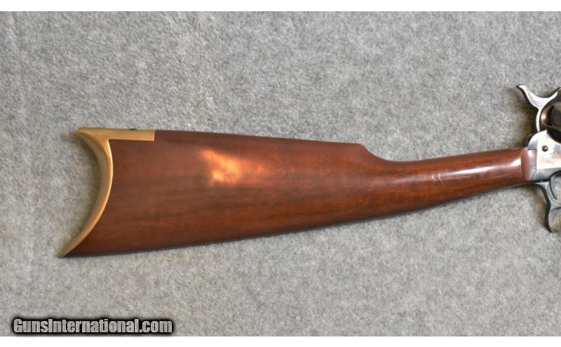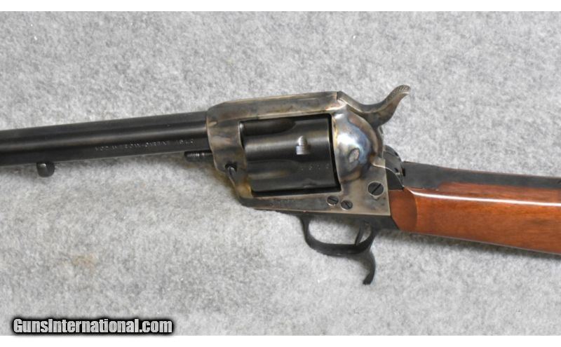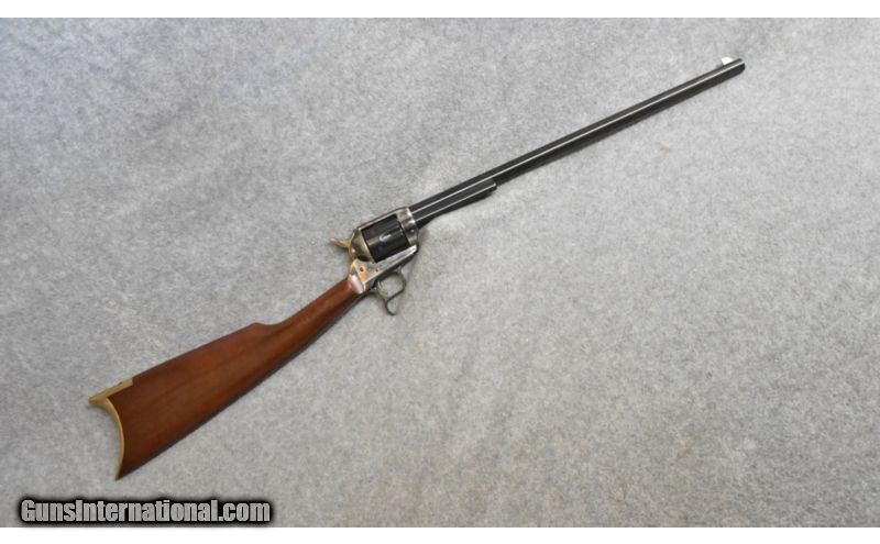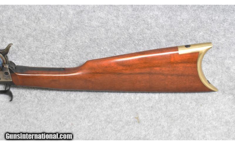 Description: Uberti American Carbine .45 Long Colt SOLD Caliber Info: .45 Long Colt Metal Condition: Very good, a bit of wear on the brass Wood Condition: Very good, scratch on the stock Bore Condition: Clean with bright lands Barrels: 18 inch Triggers: Single grooved trigger Stock: English style straight walnut Stock Dimensions: 13 1/2 inch LOP Butt Pad: Brass plate Weight: 4 lbs Sights: Fixed blade front Item Location: Kansas City, KS |