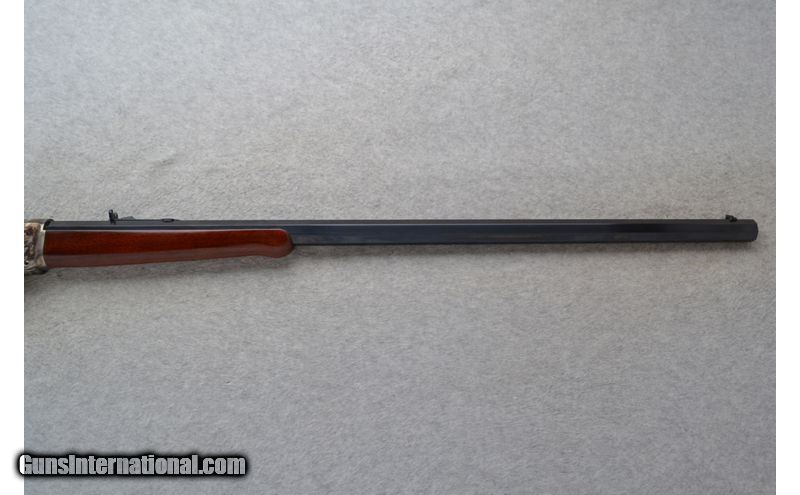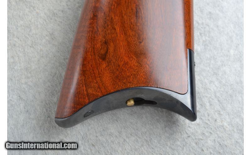 Description: Uberti 1885 high wall factory chambered in .44 WCF, but has been professionally rechambered to .444 Marlin. 30" octagon barrel with factory front blade and semi buckhorn rear sight. The action has some light case color wear. The barrel has some faint scratches and some light brown patina. Stock and fore end have some handling marks with a few through the finish. .444 Marlin Rechambered SOLD Chambers: Single shot. Metal Condition: Cyanide case colored action shows some light wear. Blued barrel has some faint scratches along with some light brown patina. Wood Condition: Stock and fore end have some light handling marks and a few scratches. A few dings are through the finish. Bore Condition: Bright bore with strong rifling. Barrels: 30" octagon. Triggers: Smooth trigger. Stock Dimensions: 14" LOP Fore End: Unchecked straight hand stock and fore end. Butt Pad: Smooth steel crescent with sliding door compartment that has a cleaning rod. Sights: Factory front blade with semi-buckhorn rear sight. Item Location: Mitchell, SD |