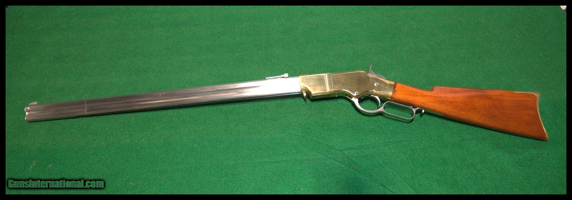 Description: Previsouly owned Uberti reproduction of the Henry Pattern rifle in .45LC. Brass receiver & tangs, polished SS barrel, magazine, and lever Gun only, no box. SOLD Rifle Caliber: .45 |