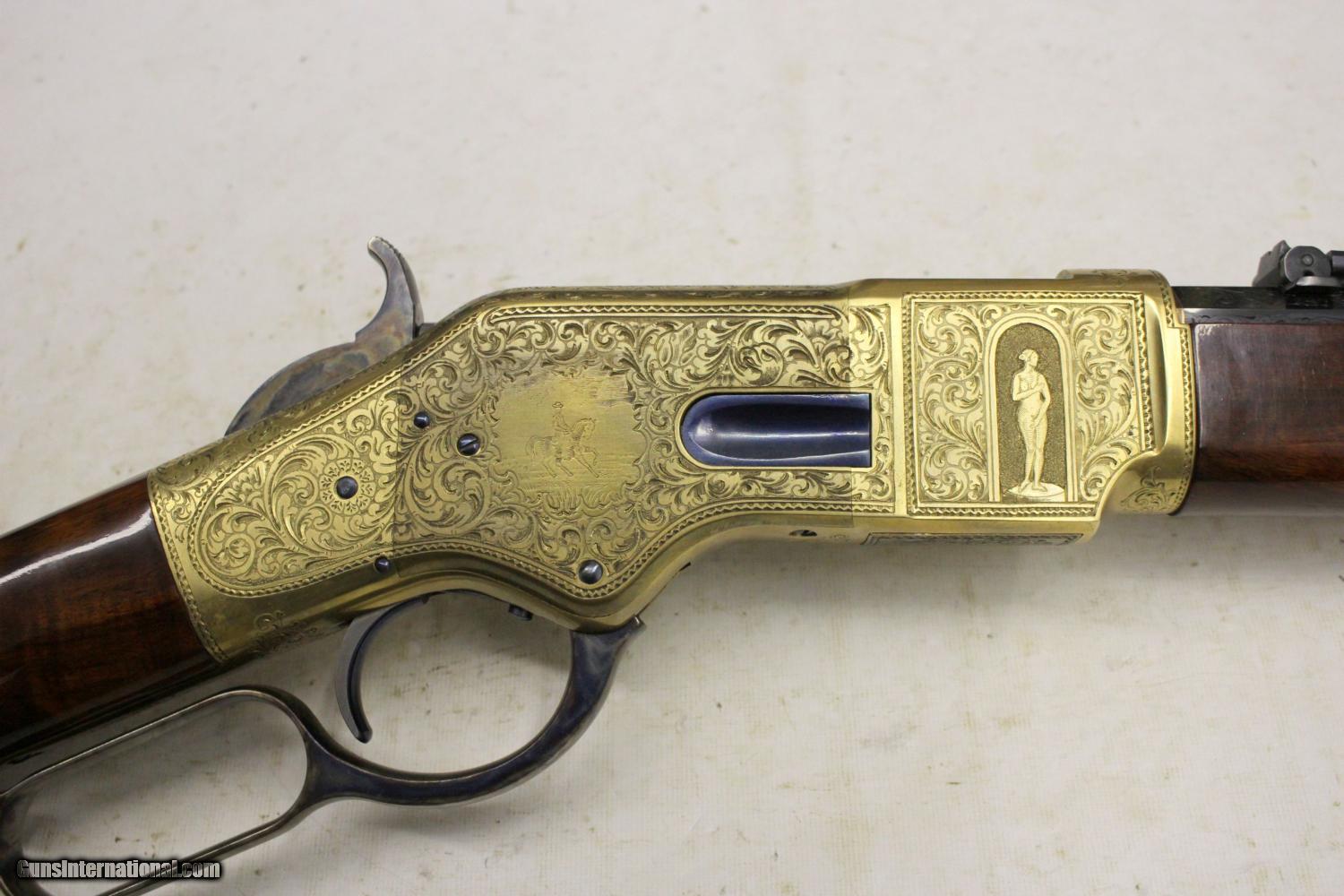 Description: We are offering for sale an Uberti Model 1886 also known as “An Engravers Tribute to Gustave Young”. This is an absolutely gorgeous rifle chambered in .44 WCF. The gun shows extremely intricate engravings on many of the components. This rifle is 99% condition. 24” Octagon barrel is mint with inlay around the muzzle and breech end. Bore is excellent; bright with strong rifling. Barrel is marked with the title listed in the previous paragraph. The brass receiver is heavily engraved with intricate detail. Hammer and lever show case colors. Crescent brass butt plate shows engraving as well. Furniture is mint with a beautiful shine. ***** WE ONLY ACCEPT VISA AND MASTERCARD ***** Make: Uberti Model: 1866 Caliber: .44 WCF SN# GY045 Action: Lever Action Barrel Length / Condition: 24 ”; Excellent Ribbing (Y/N): No Receiver Condition (ie. Bluing, Engraving, etc.): Excellent with engravings Stock Condition (ie.Checkering, Wear, etc.): Excellent with gloss shine Fore-end Condition (ie. Checkering, Wear, etc.) Same as above Kind of Sights (ie. Front, Rear): Fixed front blade sight, Rear Ladder Sight Trigger/Grip: Very good Recoil Pad: Crescent metal butt plate with engravings Overall Length: 42 ¾” PLEASE CHECK OUT ALL PHOTOGRAPHS FOR CONDITION Please know the legality of any weapon in your state before . If a gun can’t be transferred to you we will charge a 15% re-stocking fee. Also, we are a PART TIME business, Only in office on Saturdays 10am-4pm. If you make an offer on Sunday-friday we may not get back to you for 24+ hours, please send us an email with any questions, and we will do our best to get back in a timely manner. Thank You. We are not a shop open to the public, no private viewings. We stand behind our descriptions, and gladly take returns, however we know based on the descriptions given, you will not be disappointed. No Face To Face Transfers! Please note: Clicking "buy" does not guarantee that this gun is yours, However clicking “Buy” will reserve this gun for you, if it hasn’t been sold in store. We will try to do our best to remove the posts as efficiently as possible, but sometimes delays may ensue. “Buy” is your safest bet to reserve a gun. Also please add 6.25% MA state sales tax (if from MA) and 3% credit card shop courtesy fee. After Clicking “buy” we will need the following from you, via email before we ship. 1: A copy of your preferred FFL’s license via email () 2: Your preferred method of payment (If Credit card: 16 digit, MM/YY exp date, 3 digit code Plus billing address) 3: Your Shipping information/ Your preferred FFL’s Shipping information. You have 5 business days to arrange payments and ffl information to us. Any purchase not completed within this time frame will be cancelled, and the ad will be put back active online. Please before calling with concerns read these conditions and meet them accordingly $$$$$ Shipping is 40.00 $$$$$$$$$$$$$ SOLD |
