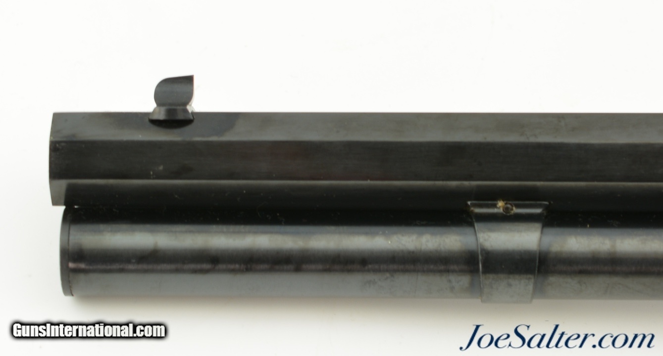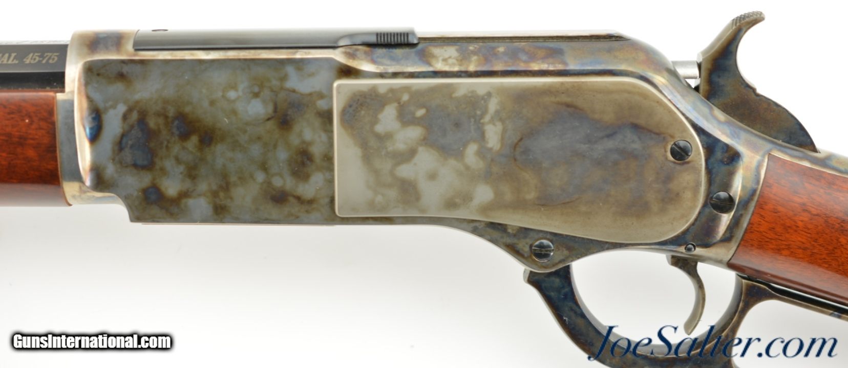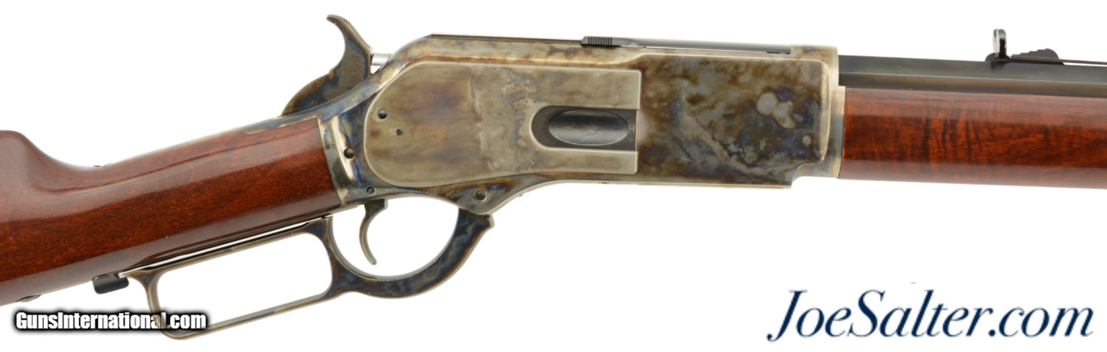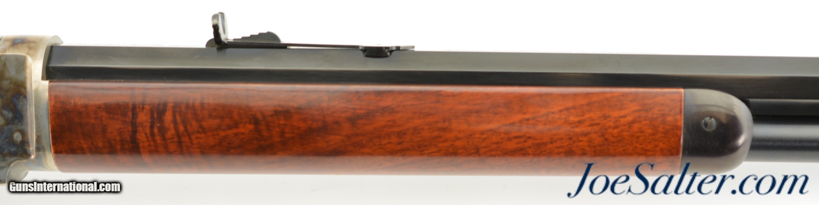 Description: Serial #CN1160, .45-75 WCF, 28" octagon barrel with an excellent, bright bore. This is an extremely handsome, modern version of the legendary Winchester Model 1876 rifle. The rifle retains virtually all of the original blue on the barrel, magazine tube, dust cover, and buttplate, with a commensurate amount of the original color case-hardening remaining on the frame, lever, and hammer. The walnut forend and buttstock are also in excellent, little-used condition, although there is a single tiny blemish on the underside of the forend about halfway down. Additionally, the stock compartment contains a segmented cleaning rod, and the rifle is housed in the original cardboard box with papers. These .45-75 chambered rifles were discontinued in 2020, and this example is in excellent, almost unused condition. FFL; SOLD |