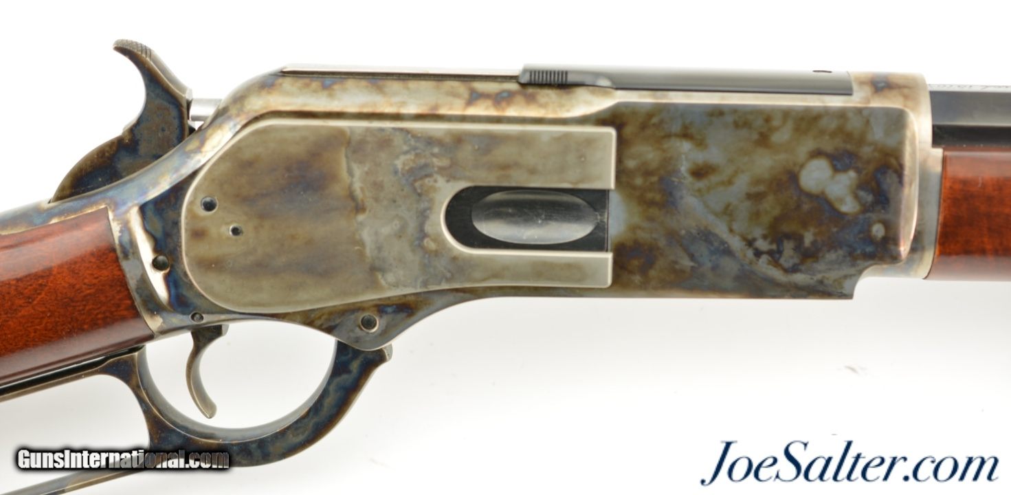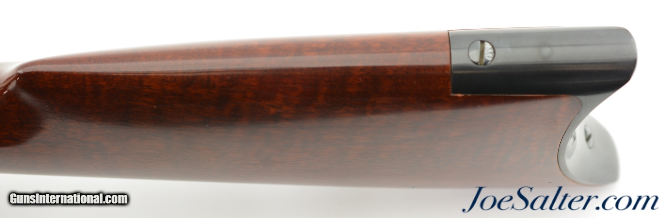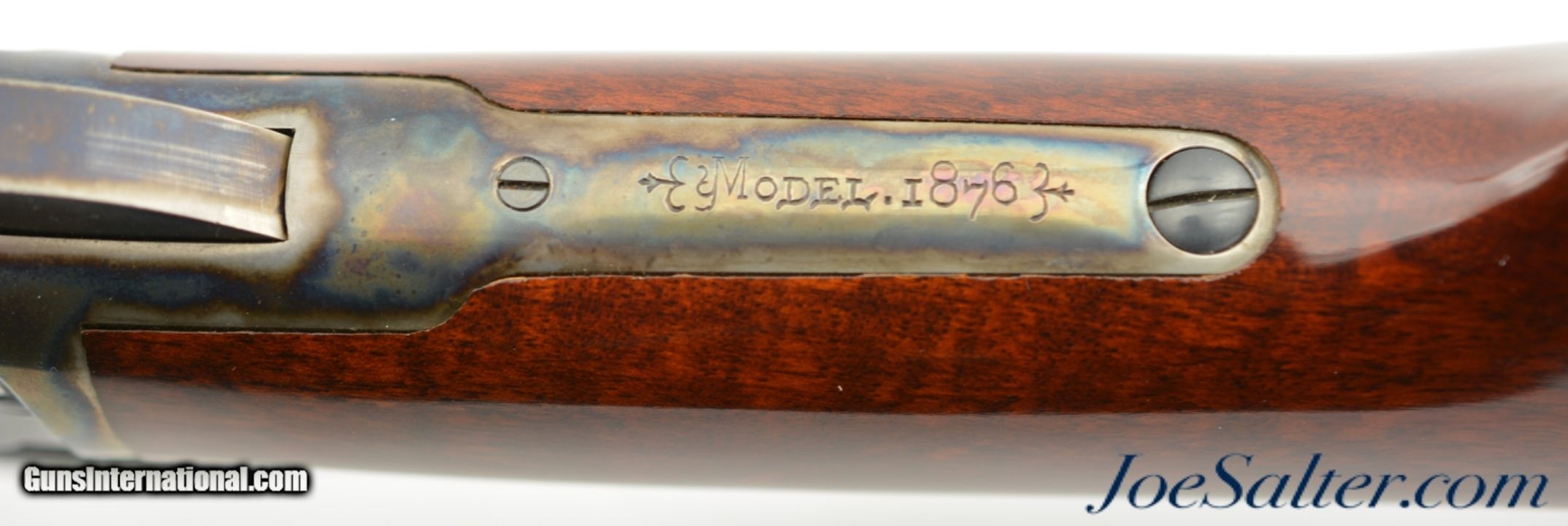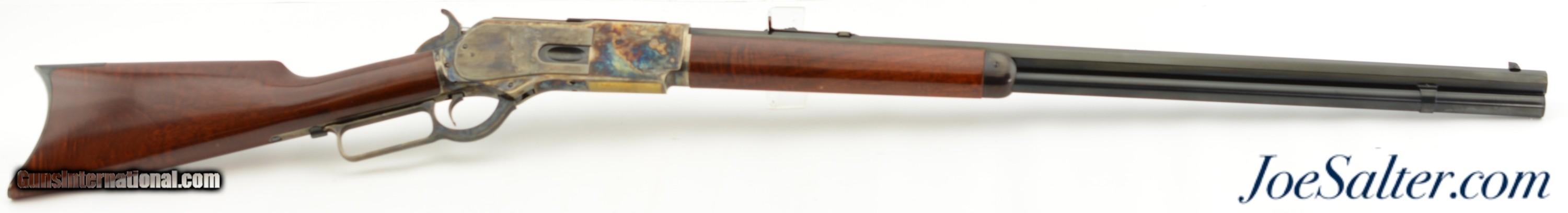 Description: Serial #CN1160, .45-75 WCF, 28" octagon barrel with an excellent, bright bore. This is an extremely handsome, modern version of the legendary Winchester Model 1876 rifle. The rifle retains virtually all of the original blue on the barrel, magazine tube, dust cover, and buttplate, with a commensurate amount of the original color case-hardening remaining on the frame, lever, and hammer. The walnut forend and buttstock are also in excellent, little-used condition, although there is a single tiny blemish on the underside of the forend about halfway down. Additionally, the stock compartment contains a segmented cleaning rod, and the rifle is housed in the original cardboard box with papers. These .45-75 chambered rifles were discontinued in 2020, and this example is in excellent, almost unused condition. FFL; SOLD |