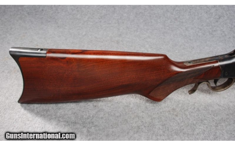 Description: SOLD Caliber Info: .45-120 Metal Condition: NIB Wood Condition: NIB Bore Condition: NIB Barrels: 32". Heavy. Octagon. Stock: Walnut with checkered pistol grip. Stock Dimensions: 14 1/4" LOP Fore End: Wraparound checkering. Schnabel tip. Butt Pad: Blued crescent buttplate. Breakdown cleaning rod fits in a compartment in the buttstock. Weight: 10 Lbs. Sights: Front sight is dovetailed into the octagonal barrel. Can be drifted for windage. Rear buckhorn. Extras: Box, papers. Item Location: Billings, MT |