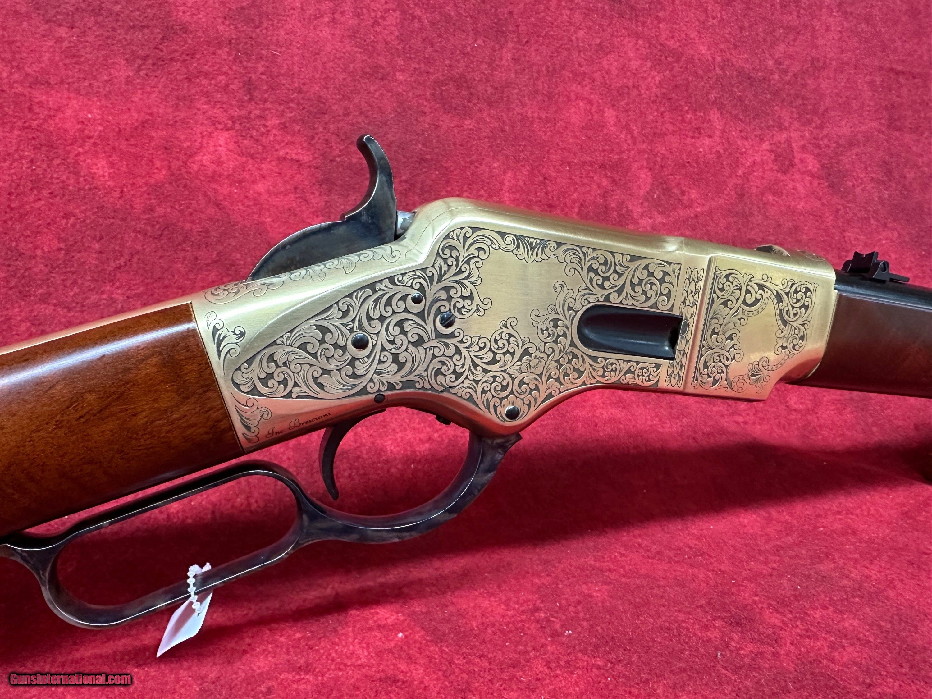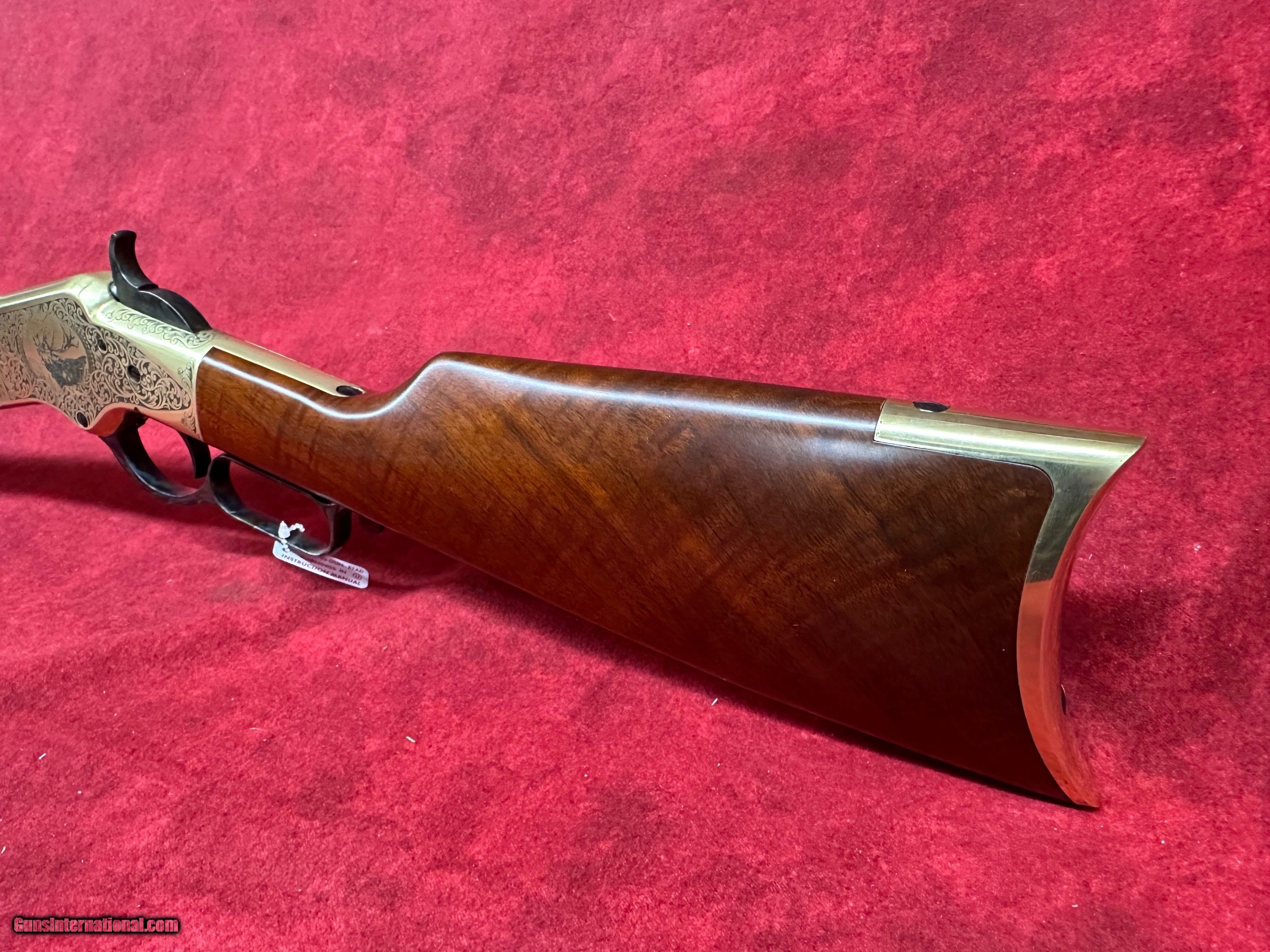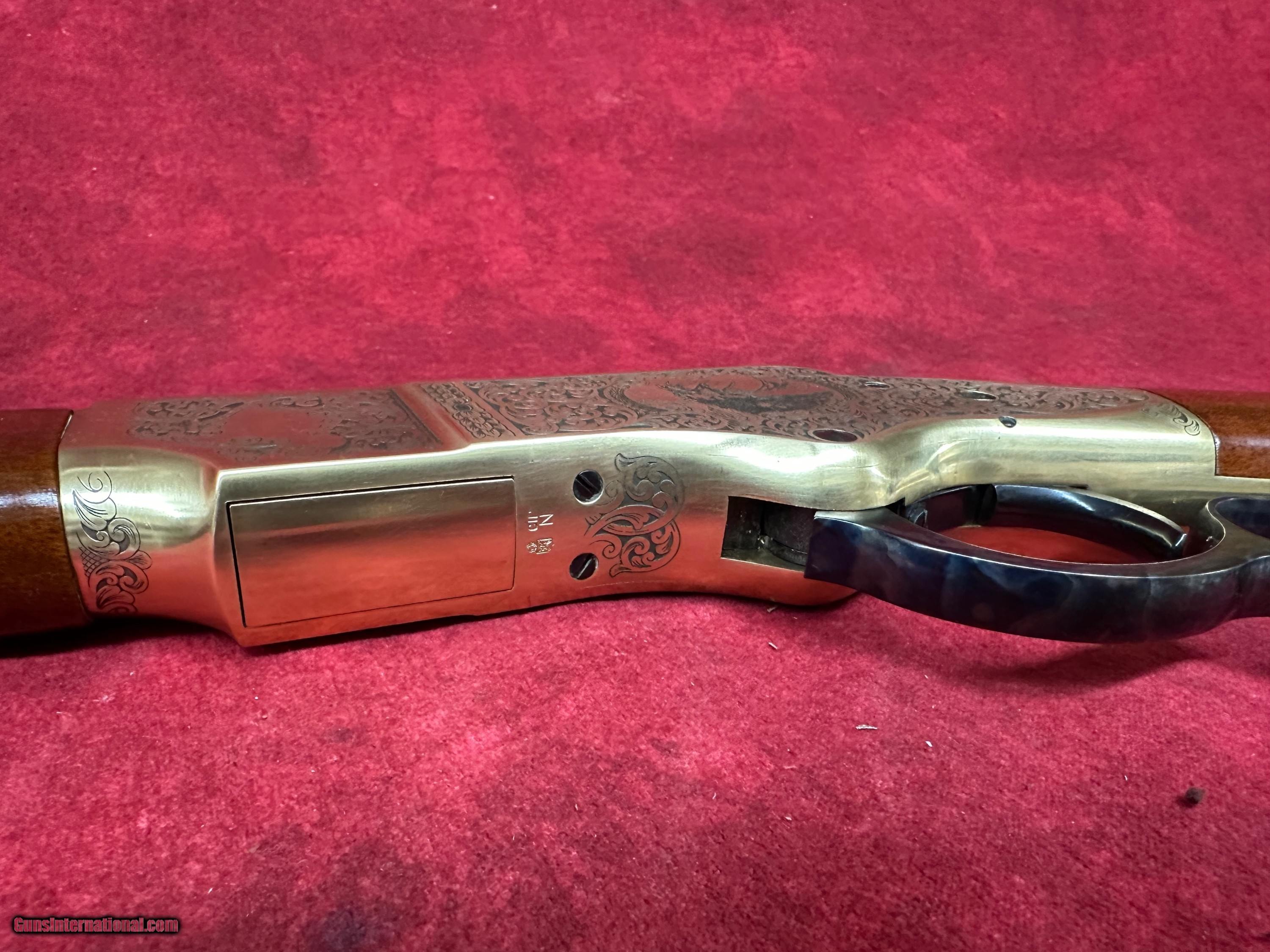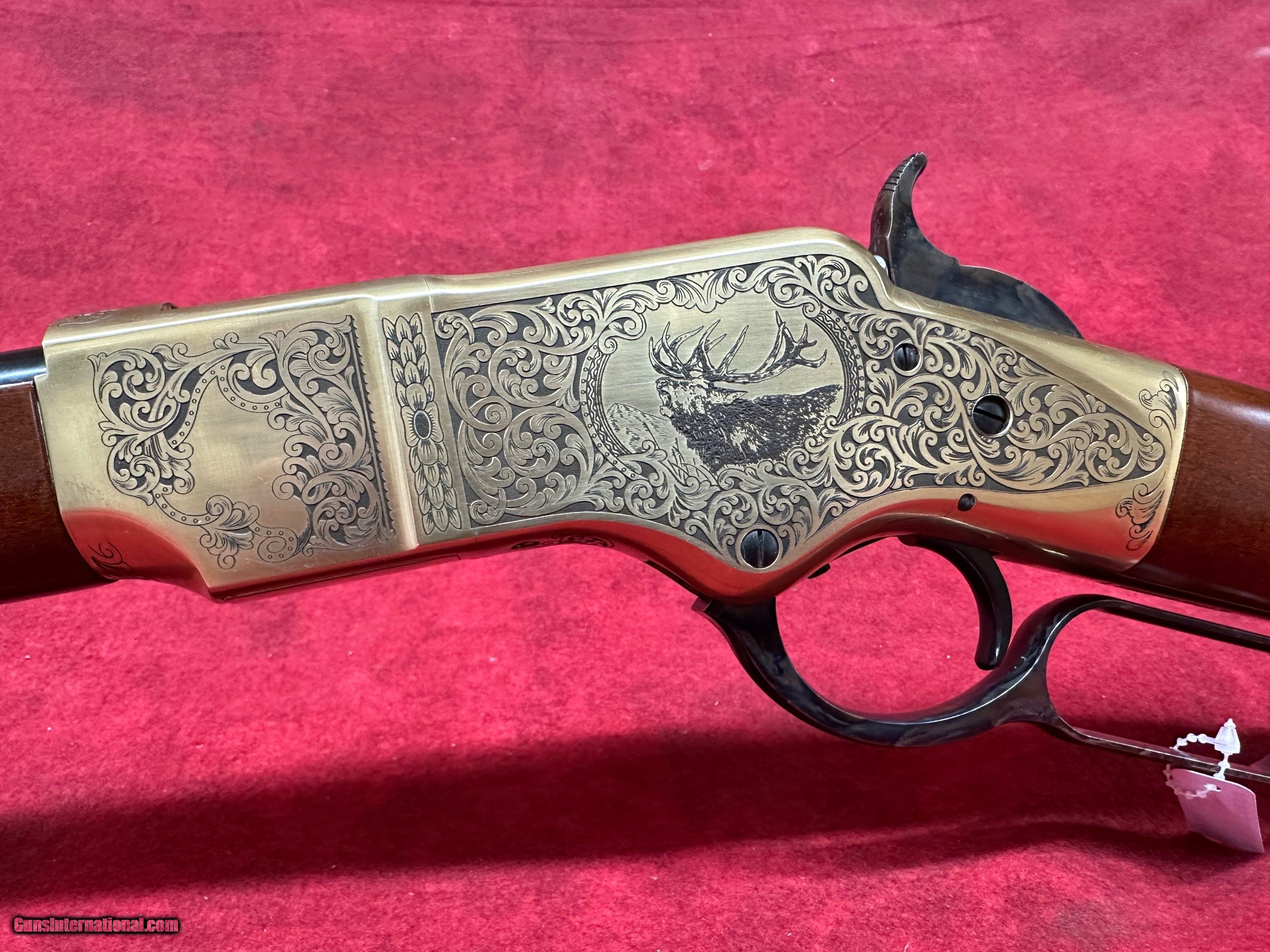 Description: Uberti 1866 Yellowboy Deluxe .45 LC 20" Barrel A-Grade Walnut 10+1 Rifle (342341) This rifle is brand new in the box. The Winchester Model 1866 was a revolutionary design when it was first produced. It might not have been the first leaver action rifle, but it did give rise to the popularity of their design. At the time of the Model 1866’s introduction, single shot muzzle-loading rifles reigned supreme, and repeating rifles that used metallic cartridges were still considered a novelty. The Model 1866’s ability to fire over and over again without reloading gave it’s user a massive amount of firepower and a considerable advantage over those still using muzzle loading designs. They quickly gained a reputation for being reliable and accurate, and their bronze frame gave the rifle a yellow color, hence their nickname “The Yellow Boy.” Uberti is offering the 1866 Yellow Boy Deluxe. This special edition rifle’s receiver features a beautiful series of engravings, meticulously copied from an original rifle from a private collection. The design shows a timeless acanthus-leaf motif on both sides. The left side of the receiver contains a medallion-shaped frame surrounding a bugling elk, while the right side has an escutcheon that may be left blank or engraved with the owner’s initials. All the work has been performed by the famed Atélier Giovanelli of Italy. Features of the 1866 Yellow Boy Deluxe:
