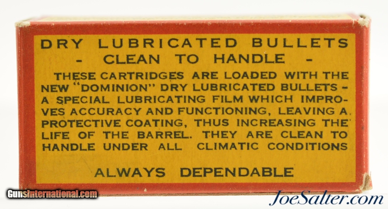 Description: This full 50 round one piece box is the third style used between 1932 and 1950. Box is very Good - Near excellent and shows light Shelf wear and light soiling. Ammo is Excellent. Listed in Blyth + Dunn as CIL-4-LR-23.; SOLD |