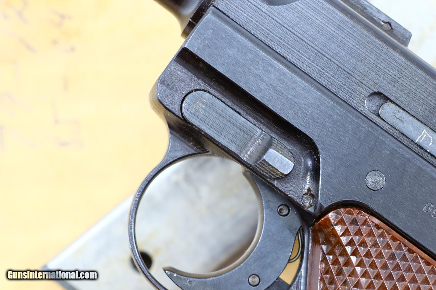 Description: Description: After WWII, Valmet manufactured approx 2500 L-35 pistols for commercial sale, largely using military overrun parts in the serial range 6800-9300, this example near NIB with spare magazine with takedown tool in original factory-matching shipping box. One of the earlier examples, it still retains the loaded indicator in a rectangular housing, the slide markings having been altered from the military VKT to the commercial VALMET/L-35. Mechanical features are otherwise identical to the late military pistols other than the frame no longer having the shoulder stock lug. This all matching pistol has the correct brown mottled plastic grips each molded with the VKT logo and secured with a single screw. Correct magazine with an in-the-white body and blued floorplate. Complete with spare magazine, takedown tool, and factory-matching cardboard shipping box. Synopsis: Fabulous Finnish VKT Valmet L-35 Lahti pistol, Commercial, near NIB Condition: Near new, the front strap only having a few microscopic dings and the right side of the receiver only having a few scratches. Grips are as new, magazines and takedown tool still with congealed grease. Mirror bore. Perfect manual mechanics. VG box with stains and scuffs, factory taping, very legible, faded inked serial number on end of box. An extraordinary opportunity to buy a virtually new, early, commercial L-35 as assembled right after WWII, with accessories, in its factory-matching box! SOLD Manufacturer: VKT Serial Number: 6975 Caliber Info: 9mmP |