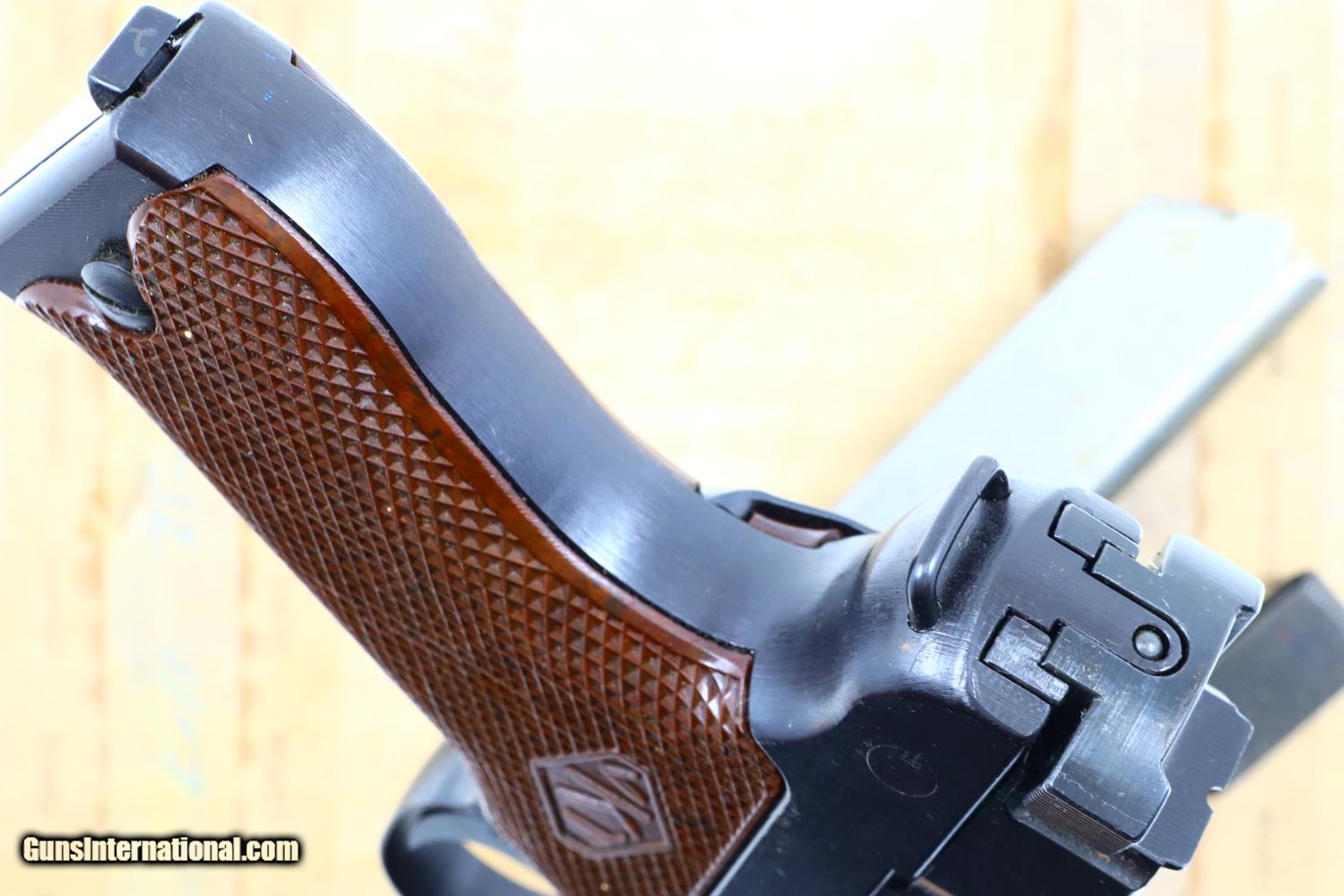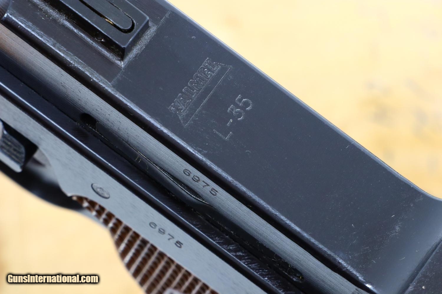 Description: Description: After WWII, Valmet manufactured approx 2500 L-35 pistols for commercial sale, largely using military overrun parts in the serial range 6800-9300, this example near NIB with spare magazine with takedown tool in original factory-matching shipping box. One of the earlier examples, it still retains the loaded indicator in a rectangular housing, the slide markings having been altered from the military VKT to the commercial VALMET/L-35. Mechanical features are otherwise identical to the late military pistols other than the frame no longer having the shoulder stock lug. This all matching pistol has the correct brown mottled plastic grips each molded with the VKT logo and secured with a single screw. Correct magazine with an in-the-white body and blued floorplate. Complete with spare magazine, takedown tool, and factory-matching cardboard shipping box. Synopsis: Fabulous Finnish VKT Valmet L-35 Lahti pistol, Commercial, near NIB Condition: Near new, the front strap only having a few microscopic dings and the right side of the receiver only having a few scratches. Grips are as new, magazines and takedown tool still with congealed grease. Mirror bore. Perfect manual mechanics. VG box with stains and scuffs, factory taping, very legible, faded inked serial number on end of box. An extraordinary opportunity to buy a virtually new, early, commercial L-35 as assembled right after WWII, with accessories, in its factory-matching box! SOLD Manufacturer: VKT Serial Number: 6975 Caliber Info: 9mmP |