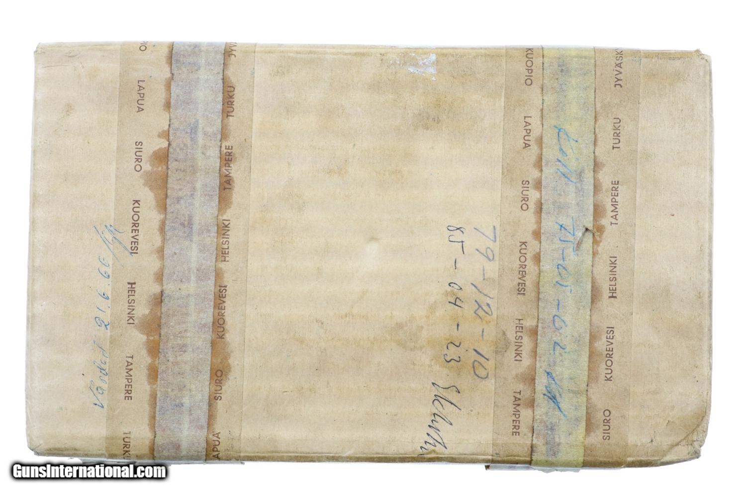 After WWII, Valmet manufactured approx 2500 L-35 pistols for commercial sale, largely using military overrun parts in the serial range 6800-9300, this example near NIB with spare magazine with takedown tool in original factory-matching shipping box. One of the earlier examples, it still retains the loaded indicator in a rectangular housing, the slide markings having been altered from the military VKT to the commercial VALMET/L-35. Mechanical features are otherwise identical to the late military pistols other than the frame no longer having the shoulder stock lug. This all matching pistol has the correct brown mottled plastic grips each molded with the VKT logo and secured with a single screw. Correct magazine with an in-the-white body and blued floorplate. Complete with spare magazine, takedown tool, and factory-matching cardboard shipping box.