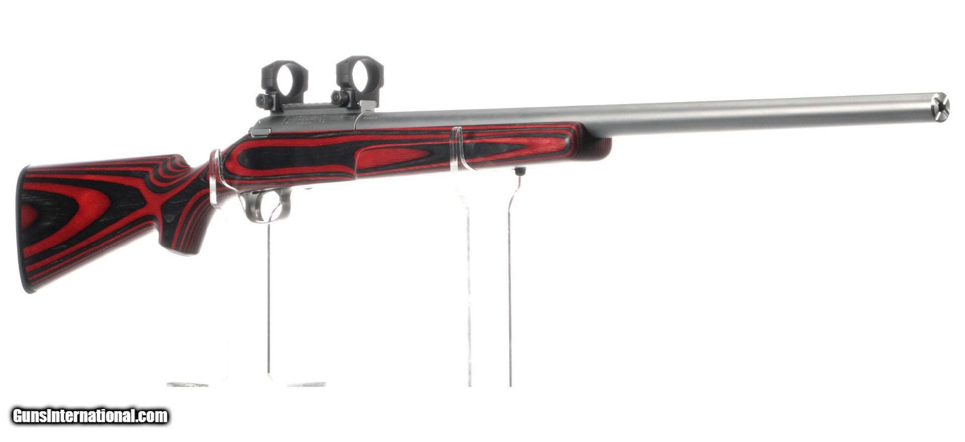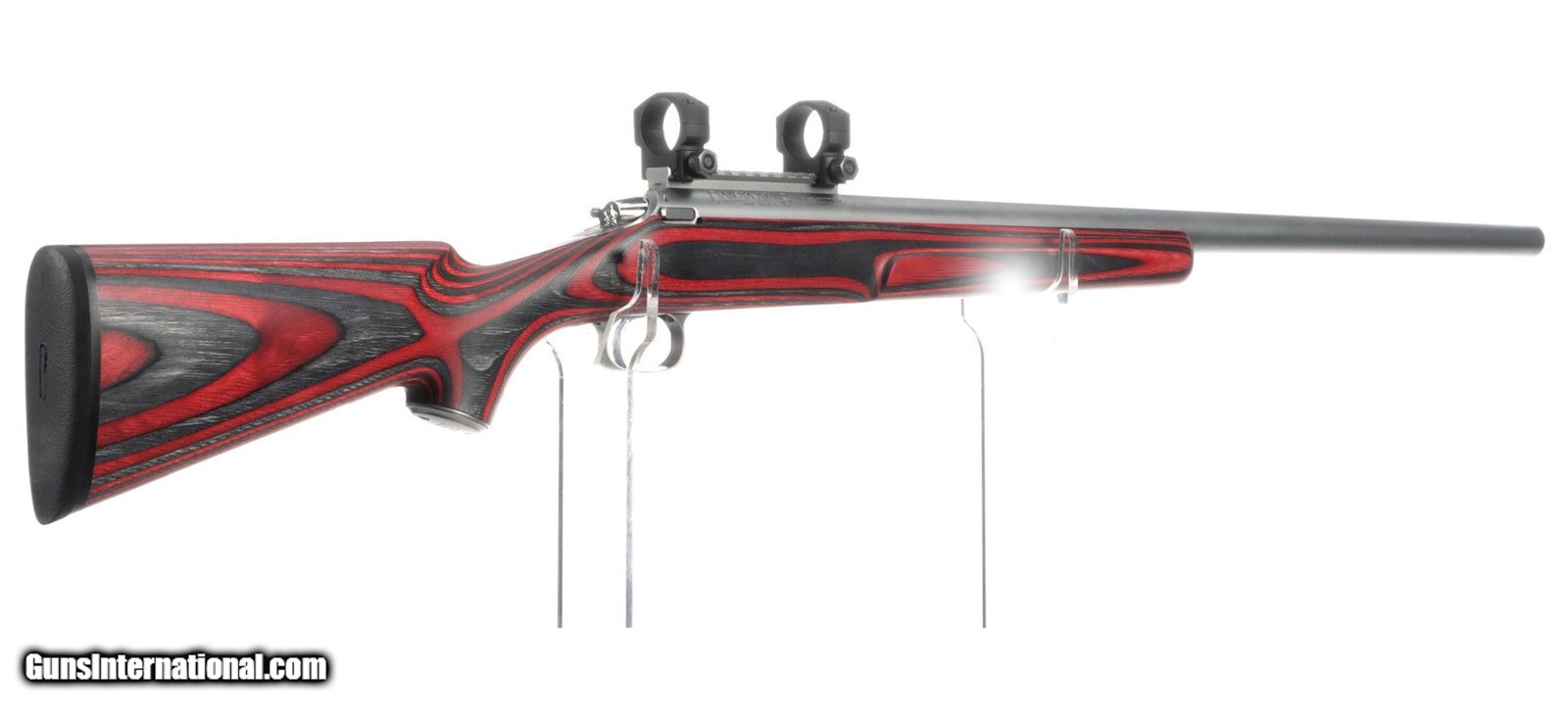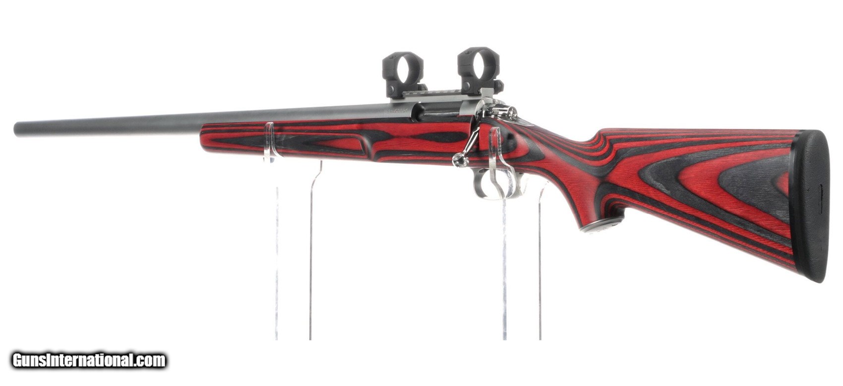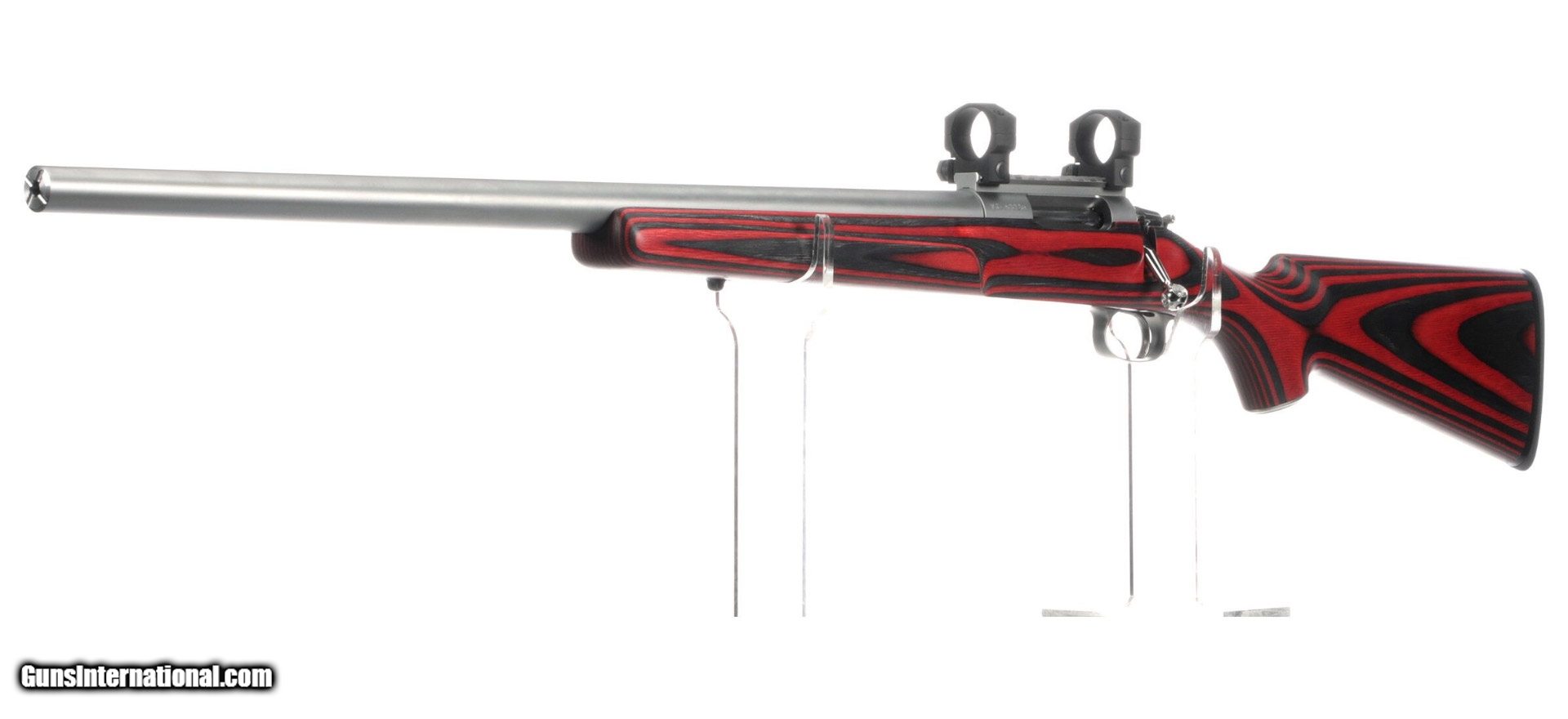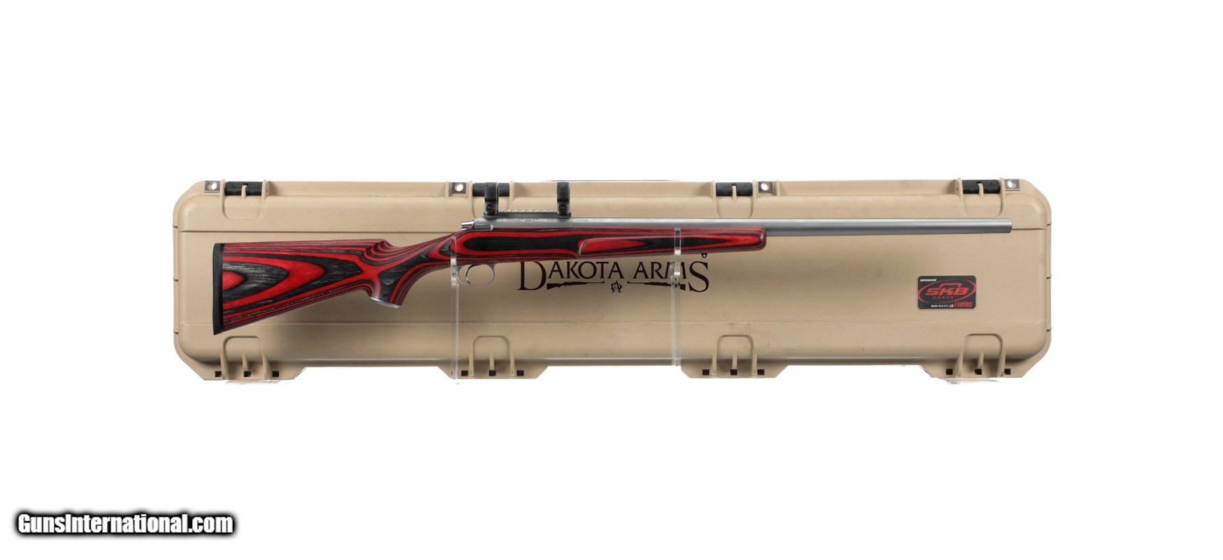 Description: As new apparently unfired condition stainless "Varminter" with Dakota Cert of Ownership in Dakota SKB rifle case, this is probably one of a kind. True left hander in 19 Badger. Heavy 24 1/2" stainless barrel, with rings on a Picatinny rail. Eye-catching ruby/gray lam stock, stainless grip cap, rubber pad. SOLD |