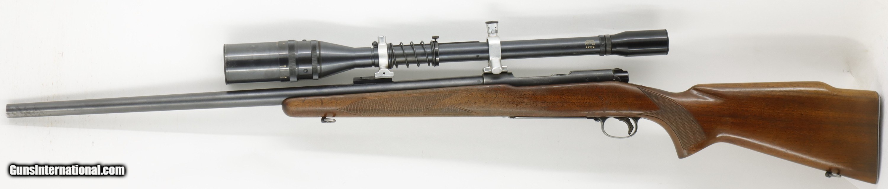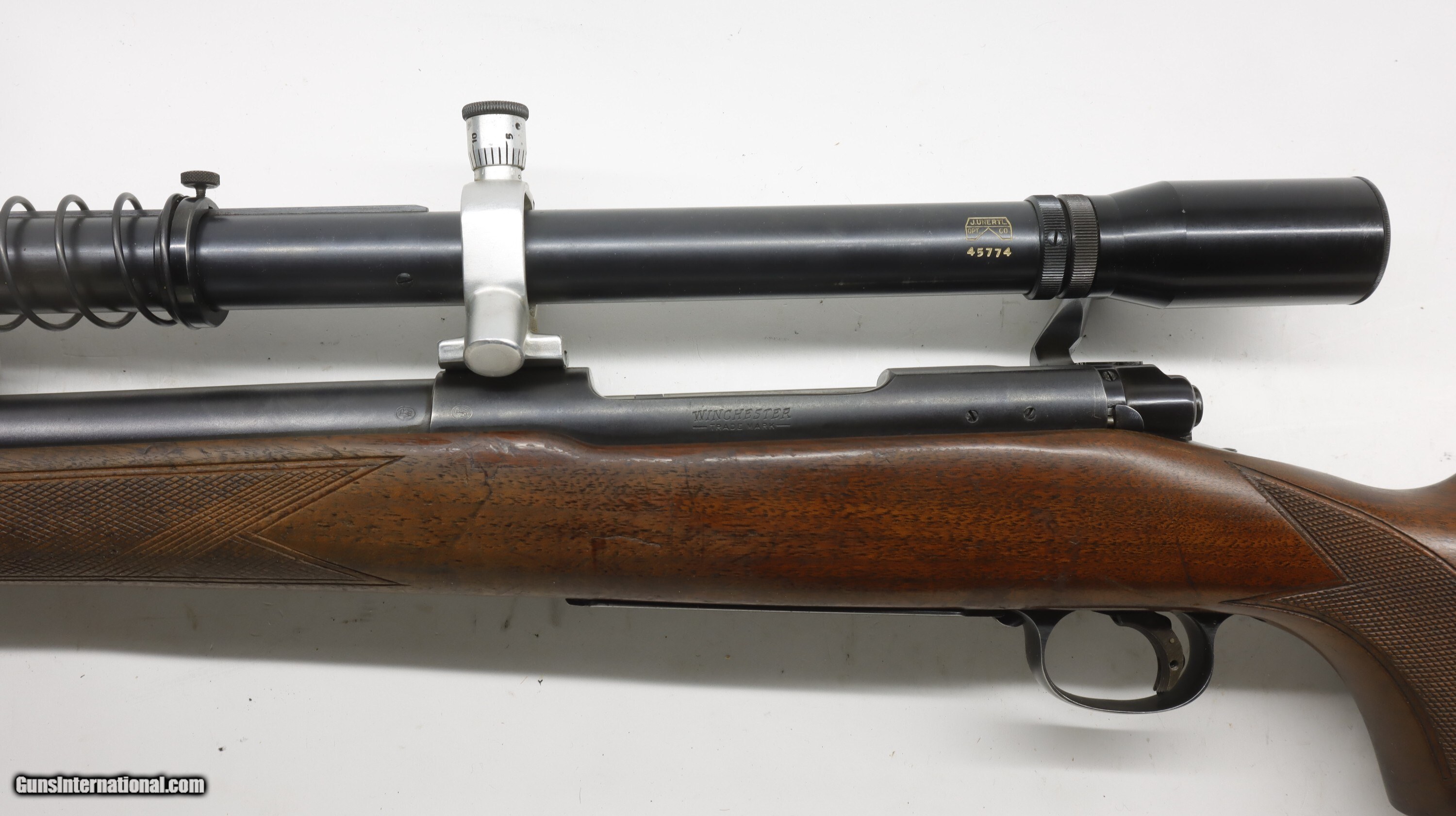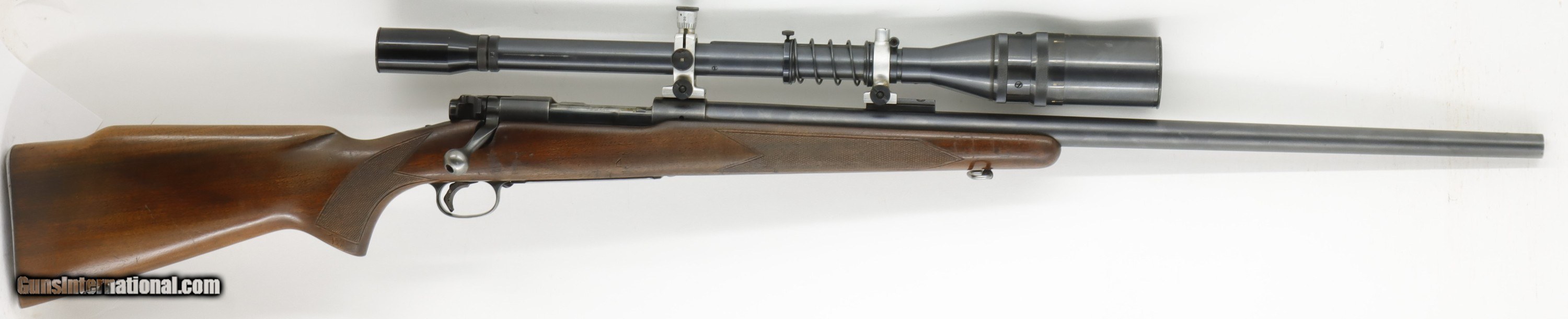 Winchester Model 70 Varmint, 243 Winchester, 26" Medium weight Stainless barrel. SN is 4464xx, made in 1959. Factroy finsih on both wood and metal, factory metal butt plate. Comes with a Unertl 15x Rifle scope. Clean and clear glass. Canjar Trigger. Good bore, good working order. Nice vintage package! Gun has a Canjar trigger, can be set all the way down to 2oz