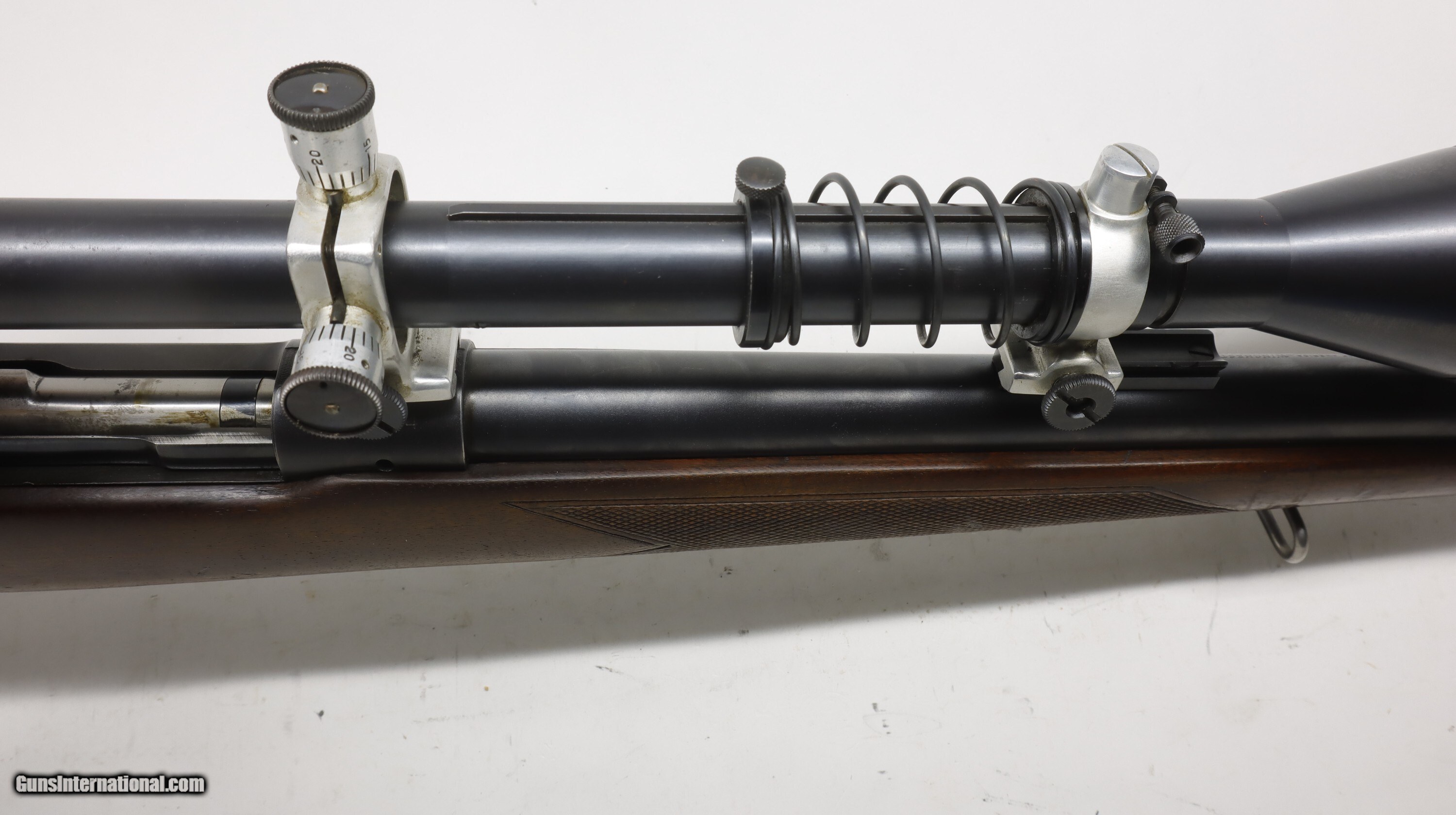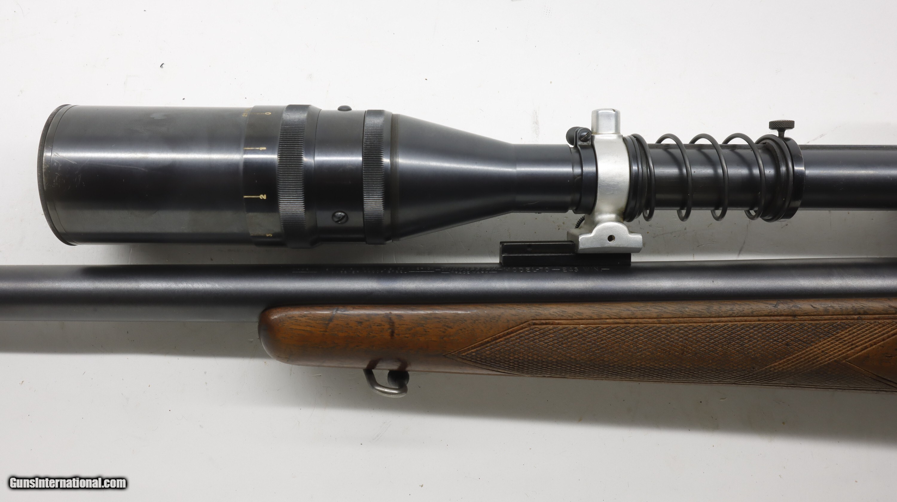 We also trade for gold and silver.Winchester Model 70 Varmint, 243 Winchester, 26" Medium weight Stainless barrel. SN is 4464xx, made in 1959. Factroy finish on both wood and metal, factory metal butt plate. Comes with a Unertl 15x Rifle scope. Clean and clear glass. Canjar Single Set Trigger. Good bore, good working order. Nice vintage package!