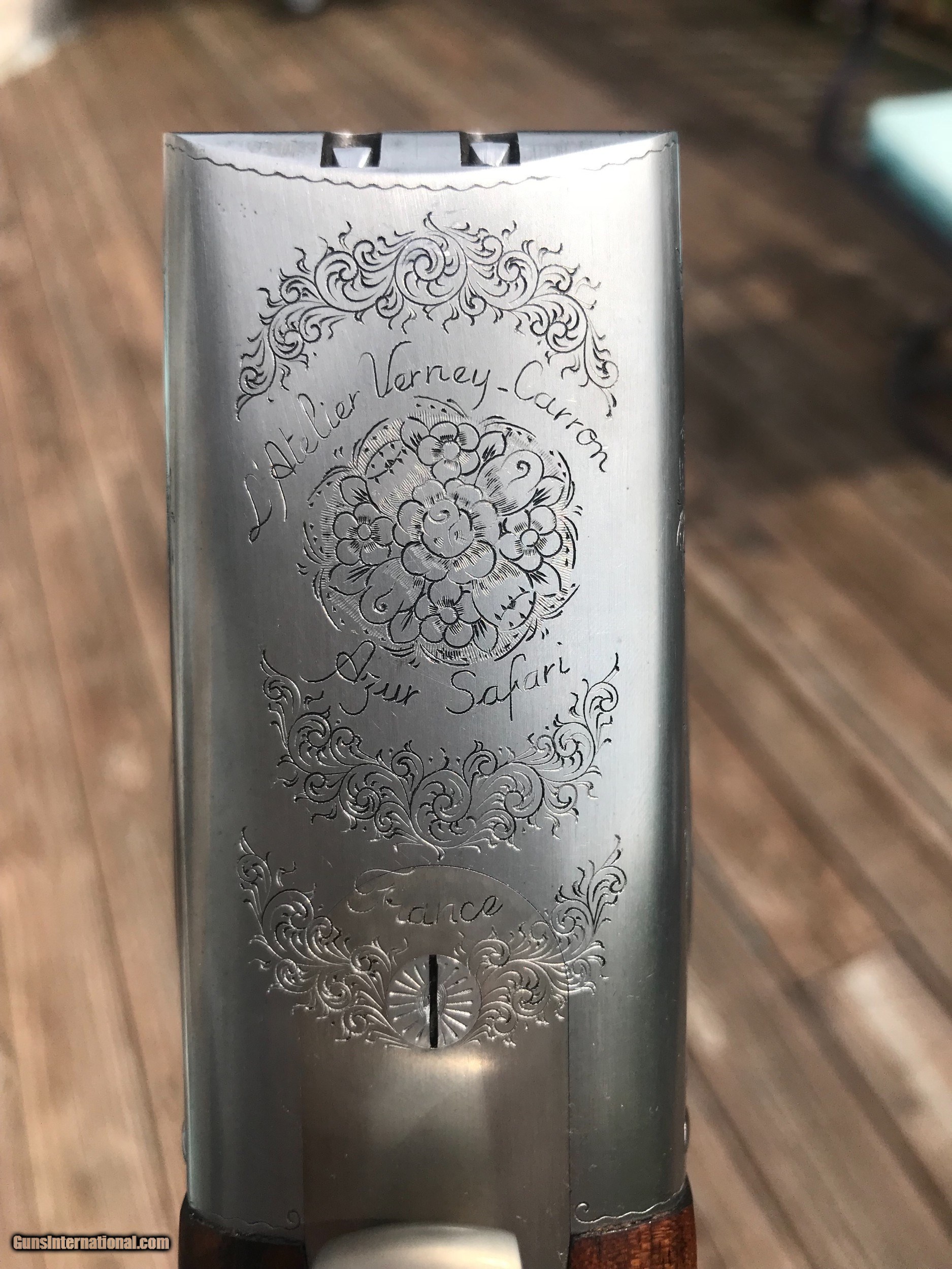 Description: For sale is a very fine Verney Carron Azure PH in 500 Nitro Express Caliber. Handmade in France in Atelier Verney Carron’s workshop by master gunsmith’s. This rifle has beautiful walnut with dark chocolate and butterscotch tones. Finely hand checkered stock and forearm. Fine hand engraved English Rose and Scroll engraving. The length of pull measures 14 3/4” to the rear trigger over a 3/4” decelerator buttpad and a 1/4” spacer. The front trigger has the wonderful and pricey option of an articulated trigger, which prevents trigger slap onto your trigger finger. This greatly aids in reducing the discomfort of firing such a powerful firearm. The rifle is equipped with powerful ejectors for a quick reload when seconds can mean the difference between life and death. The 24” barrels are well regulated for the affordable and readily available Hornady Dangerous Game ammo. The sights are a single rear blade with a single front sight. Balance point is a few inches in front of the trigger guard, perfectly balanced for fast handling. There are a few scratches under the hand guard which are not visible when the rifle is assembled. Other than very light handling marks the rifle is in excellent condition. It is priced to sell and a VC with ejectors and articulated trigger only show up for sale at this price maybe every few years so buy it while you have the chance. I live in the Nashville, TN area and would be happy to show it any serious buyers in the area. No trades please. SOLD Manufacturer: Verney Carron Model: Azure PH Caliber Info: 500 Nitro Express Ejectors: Yes |