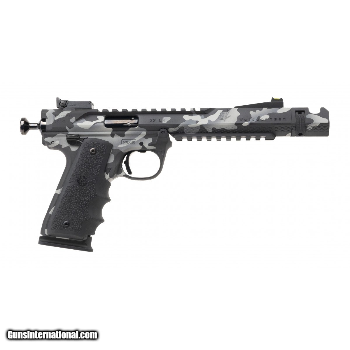 Description: " Semi-auto rimfire pistol with a 6"" barrel, a manual safety, a fiber optic front sight, a Hogue grip and, a black camo finish. NEW. UPC:810162018214. SOLD |
