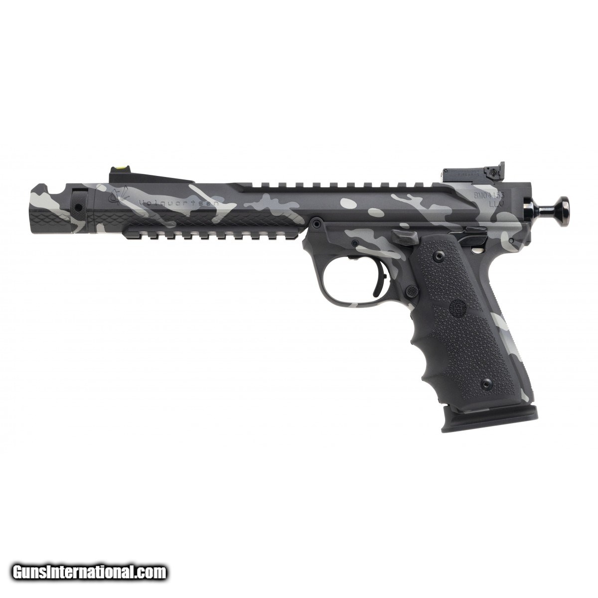 Semi-auto rimfire pistol with a 6"" barrel, a manual safety, a fiber optic front sight, a Hogue grip and, a black camo finish. NEW. UPC:810162018214.