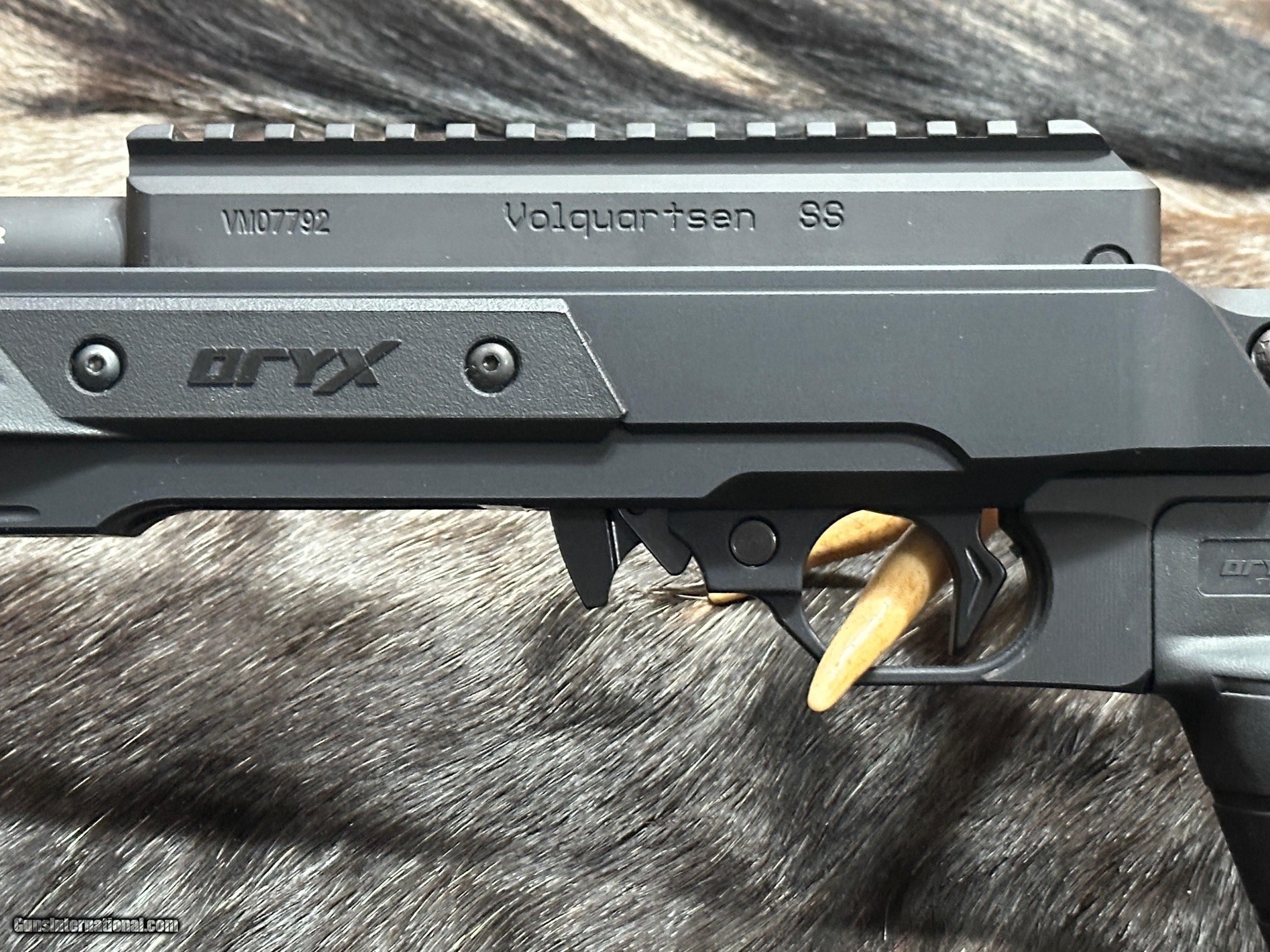 Description: NEW VOLQUARTSEN CUSTOM VF-ORYX RIFLE IN 17 HMR WITH MDT ALUMINUM CHASSIS - LAYAWAY AVAILABLE UNLIKE OTHER SELLERS, JD OUTFITTERS DOES NOT DROP-SHIP FROM A THIRD-PARTY. THE RIFLE YOU SEE IS IN INVENTORY AND IS READY TO SHIP! The new VF-ORYZ is the ultimate precision semi-auto 17 HMR rifle. The VF-ORYX is set into the ORYX Chassis from MDT - perfect when shooting from the bench, a bipod, or a prone position! The snake fluting is not a straight flute, nor a spiral flute but a hybrid of the two. Its increased surface area allows more heat dissipation than conventional straight flutes but at the same time is more rigid than spiral flutes. A Forward Blow Compensator is then installed to provide recoil free shooting. Its innovative design will also help direct noise downrange. It has always been Volquartsen's goal to achieve bolt action accuracy from a semi-auto and this begins with the barrel. The VF-ORYX's stainless steel barrel features match bore and chamber tolerances. These dimensions are proprietary to Volquartsen and have evolved from over 25 years of testing. Digital gauging equipment ensures that each barrel meets Volquartsen's stringent criteria. Features Of This GREAT SEMI-AUTO Rifle Include: