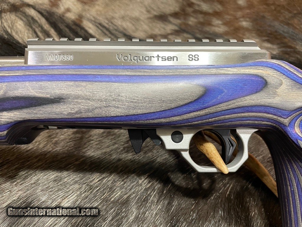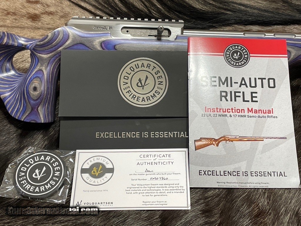 Description: NEW VOLQUARTSEN CUSTOM IF-5 RIFLE IN 17 HMR WITH BLUE LAMINATED THUMBHOLE SILHOUETTE STOCK - LAYAWAY AVAILABLE UNLIKE OTHER SELLERS, JD OUTFITTERS DOES NOT DROP-SHIP FROM A THIRD-PARTY. THE RIFLE YOU SEE IS IN INVENTORY AND IS READY TO SHIP! The IF-5 is the total package. It is what every shooter is looking for - lightweight, great balance and most of all incredible accuracy. The I-Fluting increases surface area, reduces weight and adds rigidity to the barrel more than any other fluting design offered. This means maximum heat dissipation and unbelievable accuracy all from a barrel that is 12 oz. lighter than a bull barrel. The IF-5 comes standard with a Forward Blow Compensator to give it that added touch - both in terms of looks and performance. It has always been Volquartsen's goal to achieve bolt action accuracy from a semi-auto and this begins with the barrel. The IF-5's stainless steel barrel features match bore and chamber tolerances. These dimensions are proprietary to Volquartsen and have evolved from over 25 years of testing. Digital gauging equipment ensures that each barrel meets Volquartsen's stringent criteria. Features Of This GREAT SEMI-AUTO Rifle Include: