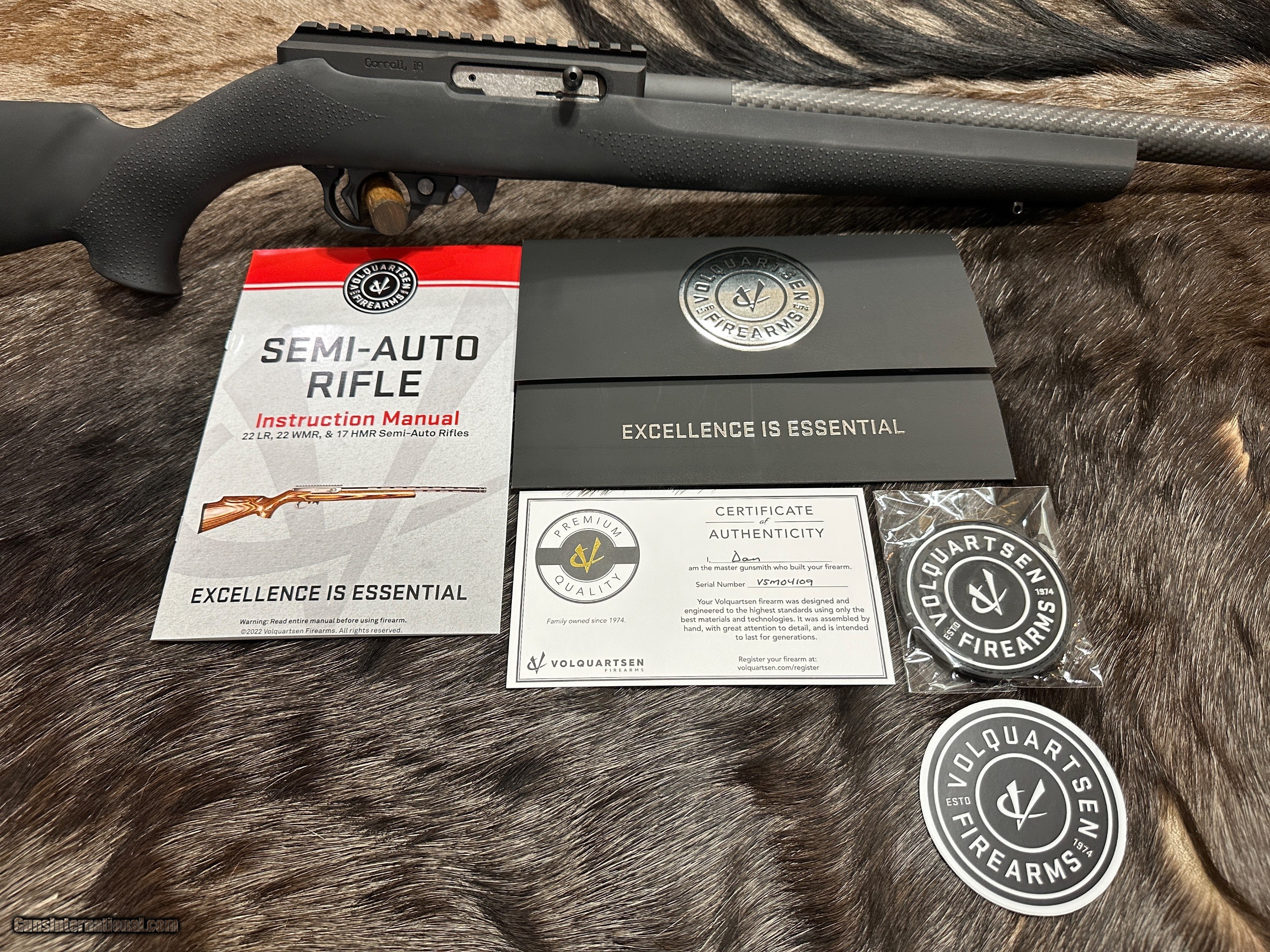 Description: NEW VOLQUARTSEN SUPERLITE RIFLE IN 22 WMR WITH HOGUE RUBBER STOCK - LAYAWAY AVAILABLE UNLIKE OTHER SELLERS, JD OUTFITTERS DOES NOT USE STOCK/GENERIC PHOTOS OR DROP-SHIP FROM A THIRD-PARTY. THE RIFLE YOU SEE IS IN JD OUTFITTERS’ INVENTORY, IS READY TO SHIP, AND IS THE RIFLE YOU WILL RECEIVE! The SUPERLITE is the total package. It achieves bolt action accuracy from a semi-auto. It features a super lightweight but ultra tough CNC-machined aluminum hard anodized receiver and a carbon fiber barrel with match bore and chamber tolerances. The SUPERLITE is a great plinker or hunting rifle that’s a breeze to carry and shoot. It has great balance and most of all incredible accuracy. Features Of This GREAT SEMI-AUTO Rifle Include: