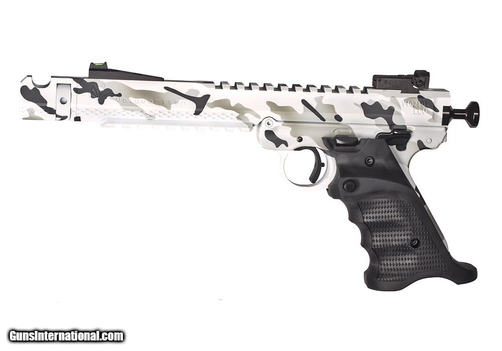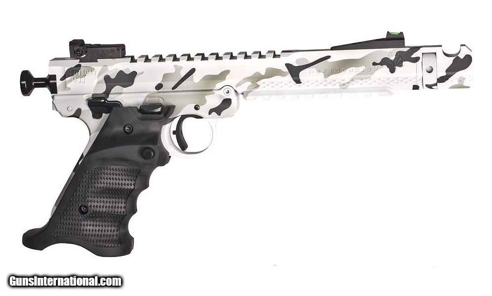 Description: Manufacturer: Volquartsen Firearms Model: Arctic Mamba-TF SKU: VF4H-0004 Caliber: .22 LR Capacity: 10 Rounds Barrel Length: 6" Stainless Steel Housed in an Aluminum Shroud, Threaded Muzzle 1/2x28 Compensator: Aluminum, Single Port LLV Competition Upper Overall Length: 12.5" Picatinny Rail Finish: Arctic Camo Ruger MK IV Standard Aluminum Frame Grips: Volthane Grips Sights: Fiber Optic Front and Target Rear Weight: 2 lbs 3 oz All items are factory new in box unless otherwise stated. Based on the information available to us, the above specifications describe this item to the best of our knowledge. For further information, please contact or visit the manufacturer's . SOLD |