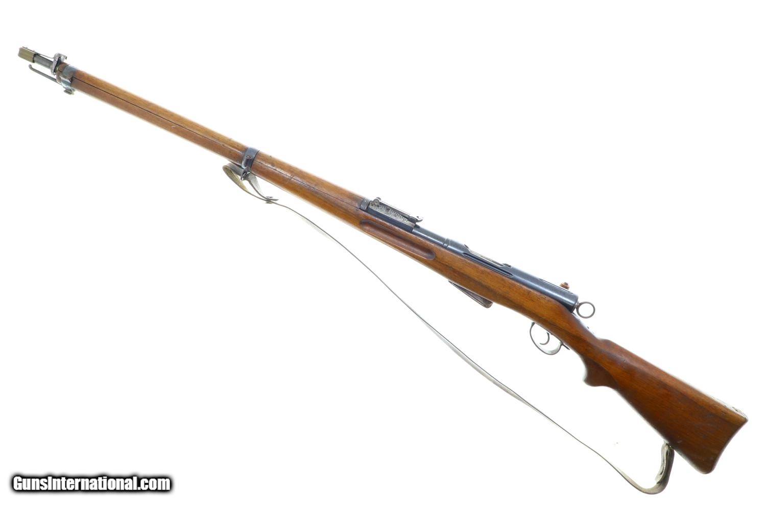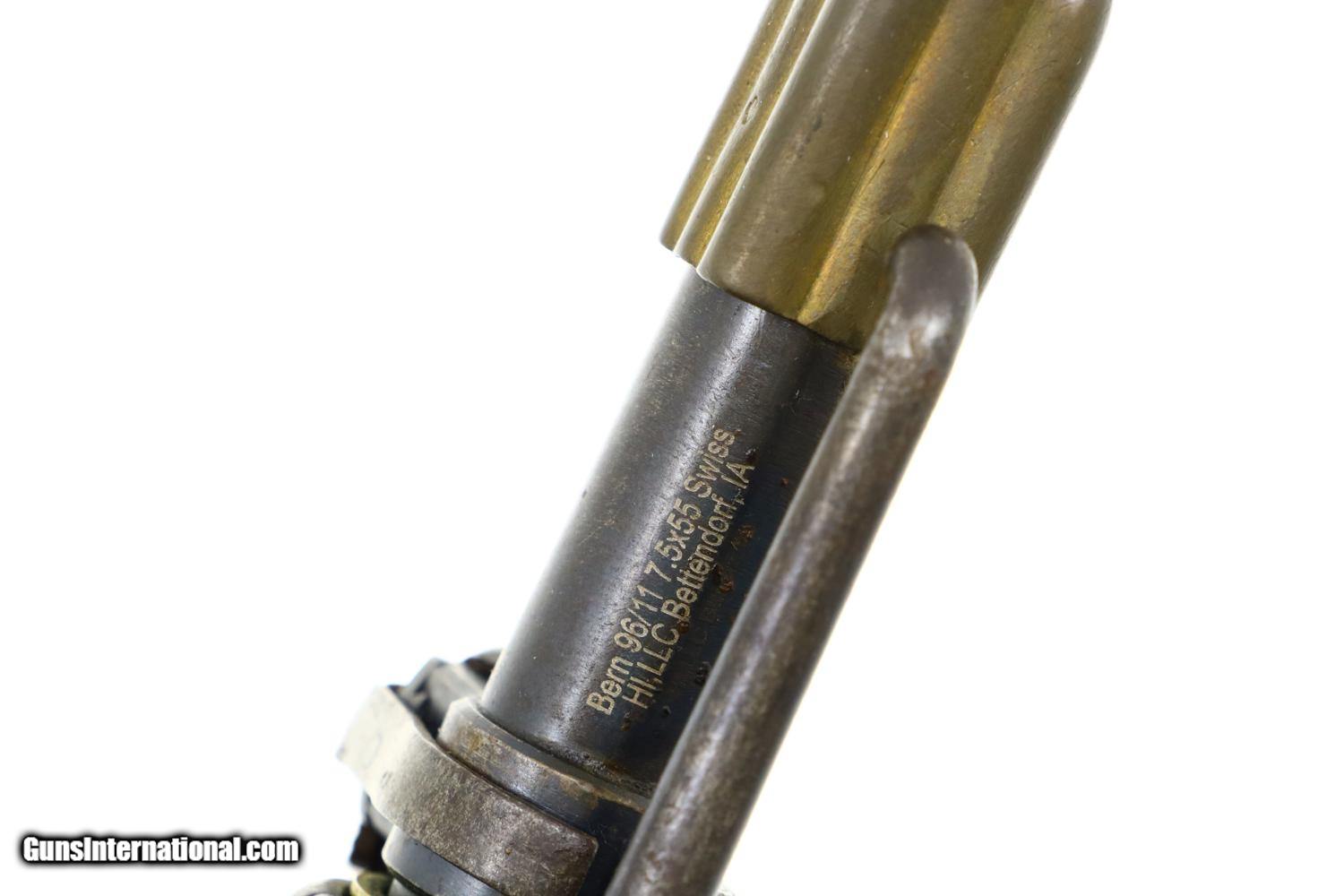 Description: Standard configuration and matching 1896/11 rifle, caliber 7.5x55, with barrel length 30.7'/overall length 51.2'/6-shot detachable magazine, made 1912 to 1920, total production estimated at 135,000, according to swisswaffen this example made 1897, deacccessioned in 1963, with tangent rear sight graduated 3-20, straight pull bolt, detachable magazine, brass muzzle cap, and metal buttplate. The left side of receiver is marked 216359, the same number repeated on the barrel, bolt, and bottom of the magazine. Walnut stock, military accepted. Metal buttplate. Military sling undated. Synopsis: Bern 1896-11, Swiss Military Rifle, 216359, I-1151 Condition: G with considerable fading and freckling. Cocking knob modified as imaged. Bright bore with sharp rifling. Perfect manual mechanics. A classic and early Swiss military rifle, in service for over 50 years, perfect for your collection! ~~Insured shipping fee of $75; most packages shipped using FedEx 2nd Day.~~ SOLD Curio/Relic: Yes Manufacturer: Bern Serial Number: 216359 Caliber Info: 7.5x55 |