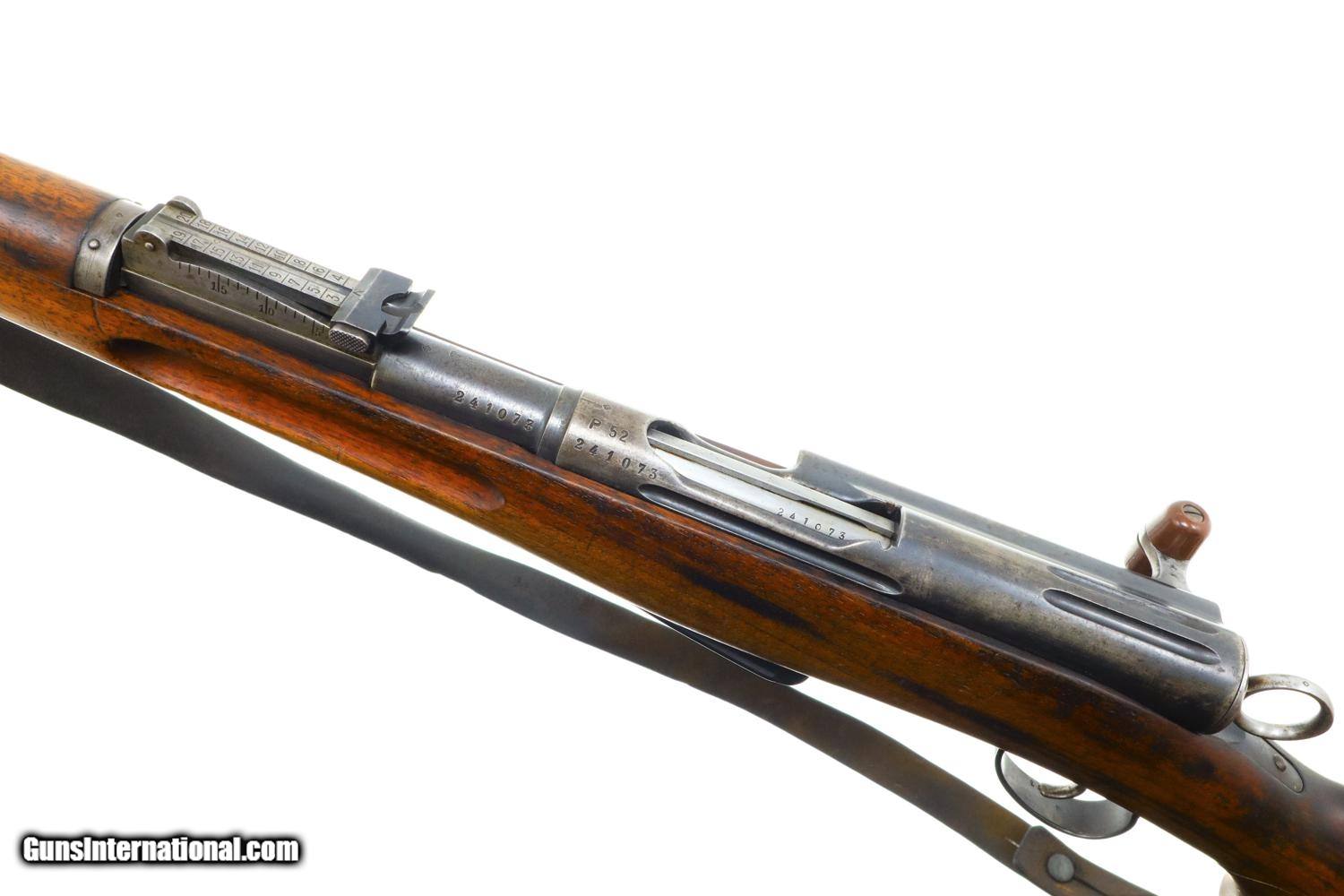 Description: Standard configuration and matching 1896/11 rifle, caliber 7.5x55, with barrel length 30.7'/overall length 51.2'/6-shot detachable magazine, made 1912 to 1920, total production estimated at 135,000, according to swisswaffen this example made 1899, deacccessioned in 1963, with tangent rear sight graduated 3-20, straight pull bolt, detachable magazine, brass muzzle cap and metal buttplate. The left side of receiver is marked 241073, the same number repeated on the barrel, bolt, and bottom of the magazine. Walnut stock, military accepted. Metal buttplate. Correct muzzle cap. Leather sling. Synopsis: Bern 1896-11, Swiss Military Rifle, 241073, I-1071 Condition: G original blue with fading as photographed . Mirror bore with sharp rifling. Perfect manual mechanics. A classic and early Swiss military rifle, in service for over 50 years, perfect for your collection! ~~Insured shipping fee of $75; most packages shipped using FedEx 2nd Day.~~ SOLD Curio/Relic: Yes Manufacturer: Bern Serial Number: 241073 Caliber Info: 7.5x55 |