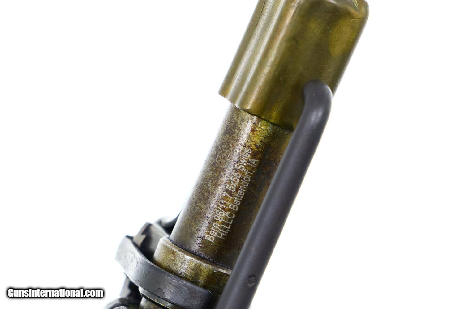 Description: Description: Standard configuration and matching 1896/11 rifle, caliber 7.5x55, with barrel length 30.7''/overall length 51.2''/6-shot detachable magazine, made 1912 to 1920, total production estimated at 135,000, according to swisswaffen this example made 1899, deacccessioned in 1963, with tangent rear sight graduated 3-20, straight pull bolt, detachable magazine, brass muzzle cap and metal buttplate. The left side of receiver is marked 241073, the same number repeated on the barrel, bolt, and bottom of the magazine. Walnut stock, military accepted. Metal buttplate. Correct muzzle cap. Leather sling. Synopsis: Bern 1896-11, Swiss Military Rifle, 241073, I-1071 Condition: G original blue with fading as photographed . Mirror bore with sharp rifling. Perfect manual mechanics. A classic and early Swiss military rifle, in service for over 50 years, perfect for your collection! SOLD Manufacturer: Bern Serial Number: 241073 Caliber Info: 7.5x55 |