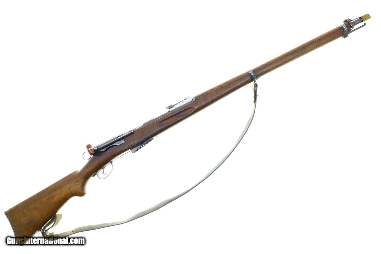 Description: Standard configuration and matching 1896/11 rifle, caliber 7.5x55, with barrel length 30.7'/overall length 51.2'/6-shot detachable magazine, made 1912 to 1920, total production estimated at 135,000, according to swisswaffen this example made 1900, deacccessioned in 1963, with tangent rear sight graduated 3-20, straight pull bolt, detachable magazine, brass muzzle cap and metal buttplate. The left side of receiver is marked 258704, the same number repeated on the barrel, bolt, and bottom of the magazine. Walnut stock, military accepted. Metal buttplate. Correct muzzle cap. Leather sling. Synopsis: Bern 1896-11, Swiss Military Rifle, 258704, I-1050 Condition: G original blue with fading as photographed. Bright bore with sharp rifling. Perfect manual mechanics. A classic and early Swiss military rifle, in service for over 50 years, perfect for your collection! ~~Insured shipping fee of $75; most packages shipped using FedEx 2nd Day.~~ SOLD Curio/Relic: Yes Manufacturer: Bern Serial Number: 258704 Caliber Info: 7.5x55 |