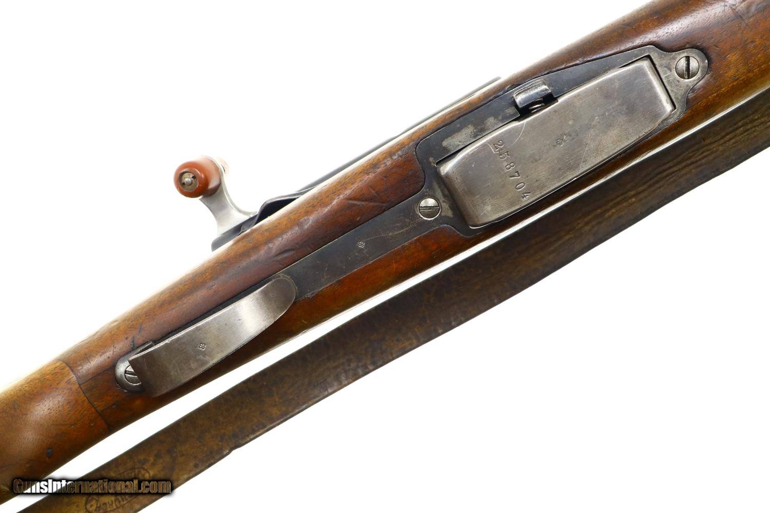 Description: Description: Standard configuration and matching 1896/11 rifle, caliber 7.5x55, with barrel length 30.7''/overall length 51.2''/6-shot detachable magazine, made 1912 to 1920, total production estimated at 135,000, according to swisswaffen this example made 1900, deacccessioned in 1963, with tangent rear sight graduated 3-20, straight pull bolt, detachable magazine, brass muzzle cap and metal buttplate. The left side of receiver is marked 258704, the same number repeated on the barrel, bolt, and bottom of the magazine. Walnut stock, military accepted. Metal buttplate. Correct muzzle cap. Leather sling. Synopsis: Bern 1896-11, Swiss Military Rifle, 258704, I-1050 Condition: G original blue with fading as photographed. Bright bore with sharp rifling. Perfect manual mechanics. A classic and early Swiss military rifle, in service for over 50 years, perfect for your collection! SOLD Manufacturer: Bern Model: 1896-11 Serial Number: 258704 Caliber Info: 7.5x55 Condition: G |