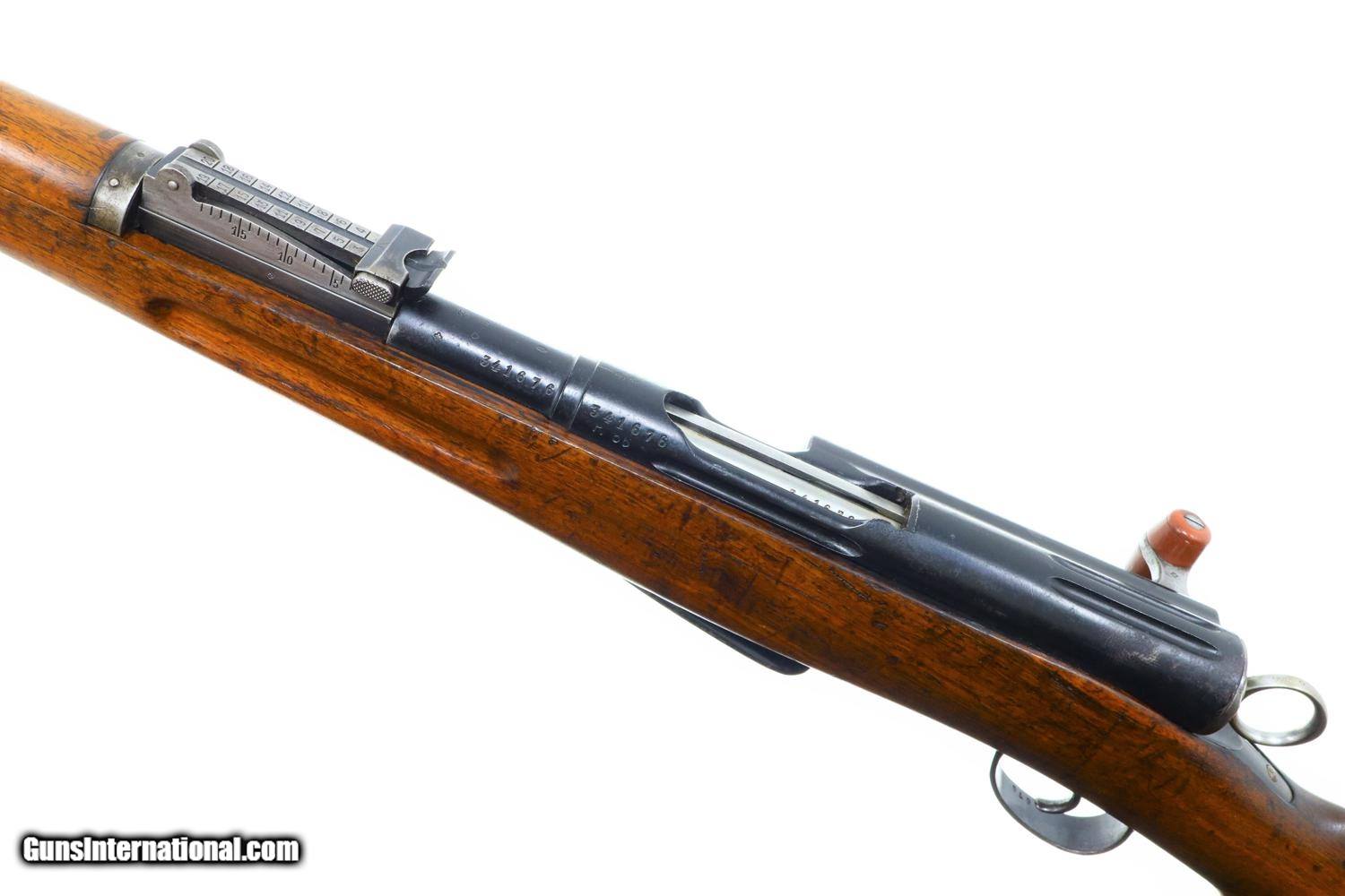 Description: Description: Standard configuration and matching 1896/11 rifle, caliber 7.5x55, with barrel length 30.7''/overall length 51.2''/6-shot detachable magazine, made 1912 to 1920, total production estimated at 135,000, according to swisswaffen this example made 1910, deacccessioned in 1963, with tangent rear sight graduated 3-20, straight pull bolt, detachable magazine, and metal buttplate. The left side of receiver is marked 341676, the same number repeated on the barrel, bolt, and bottom of the magazine. Walnut stock, military accepted. Metal buttplate. Synopsis: Bern 1896-11, Swiss Military Rifle, 341676, I-1048 Condition: G arsenal reblue with lightly sanded stock as carefully photographed. Mirror bore with sharp rifling. Perfect manual mechanics. A classic and early Swiss military rifle, in service for over 50 years, perfect for your collection! SOLD Manufacturer: Bern Model: 1896-11 Serial Number: 341676 Caliber Info: 7.5x55 Condition: G |