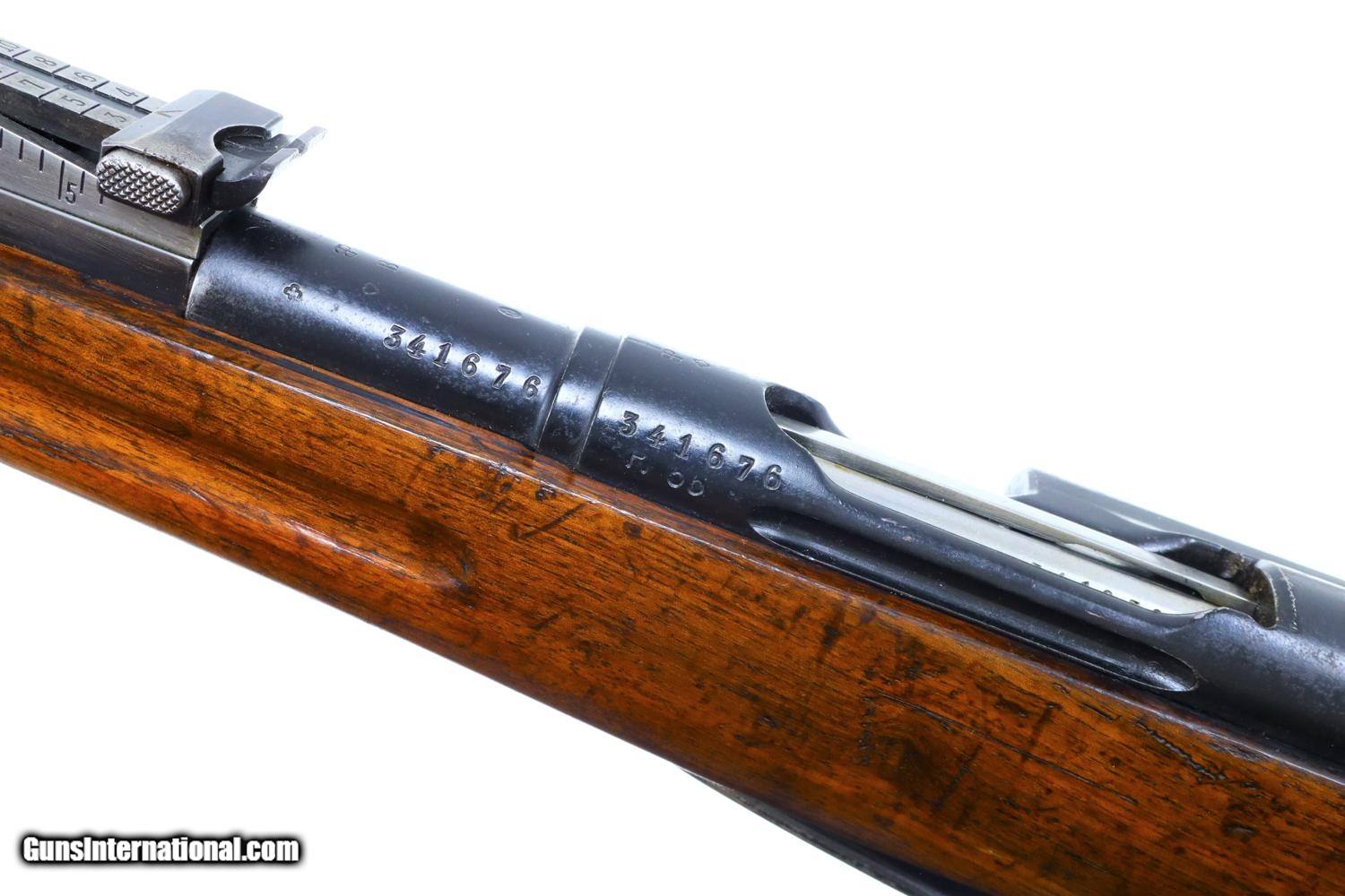 Standard configuration and matching 1896/11 rifle, caliber 7.5x55, with barrel length 30.7''/overall length 51.2''/6-shot detachable magazine, made 1912 to 1920, total production estimated at 135,000, according to swisswaffen this example made 1910, deacccessioned in 1963, with tangent rear sight graduated 3-20, straight pull bolt, detachable magazine, and metal buttplate. The left side of receiver is marked 341676, the same number repeated on the barrel, bolt, and bottom of the magazine. Walnut stock, military accepted. Metal buttplate.