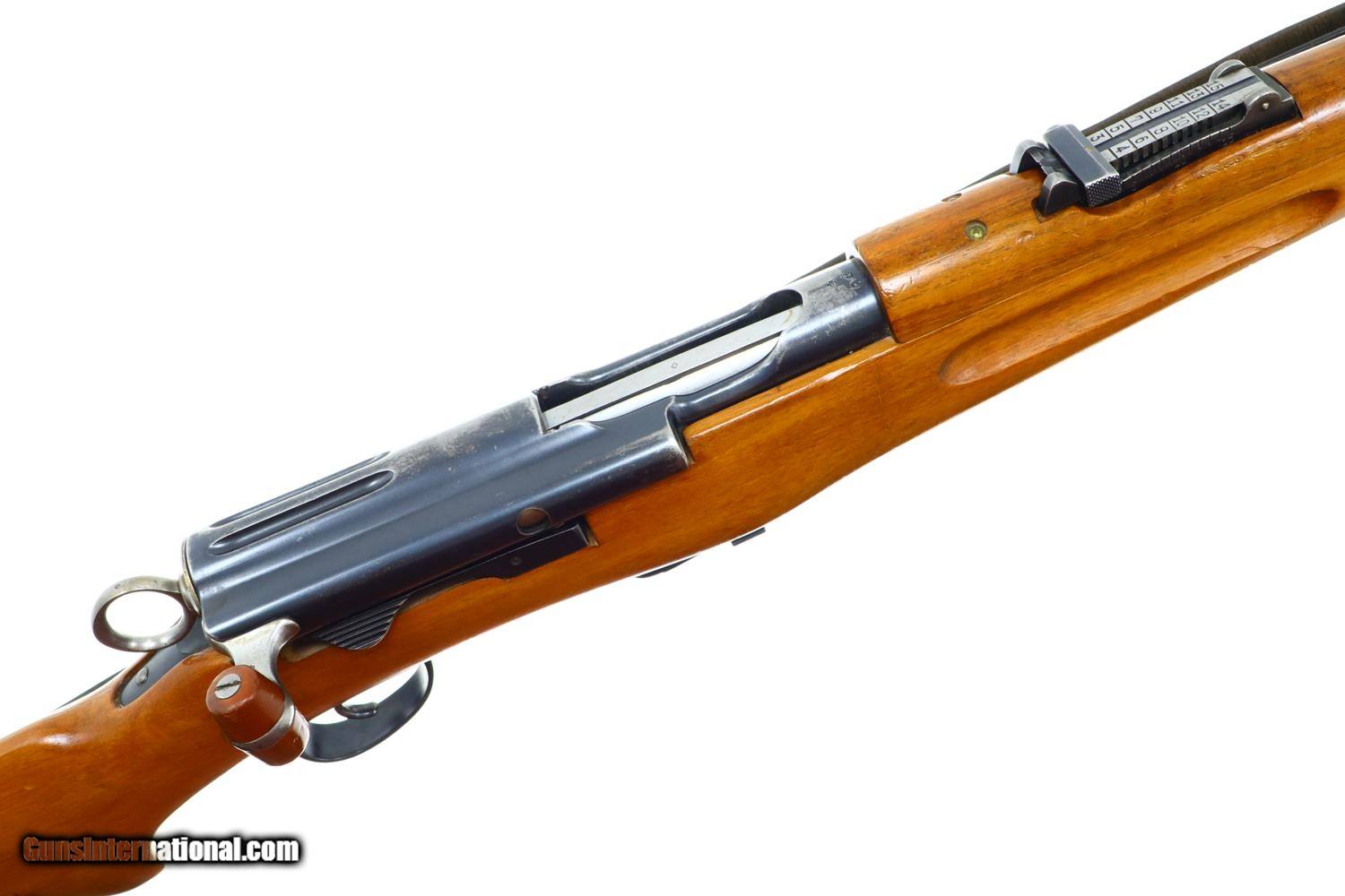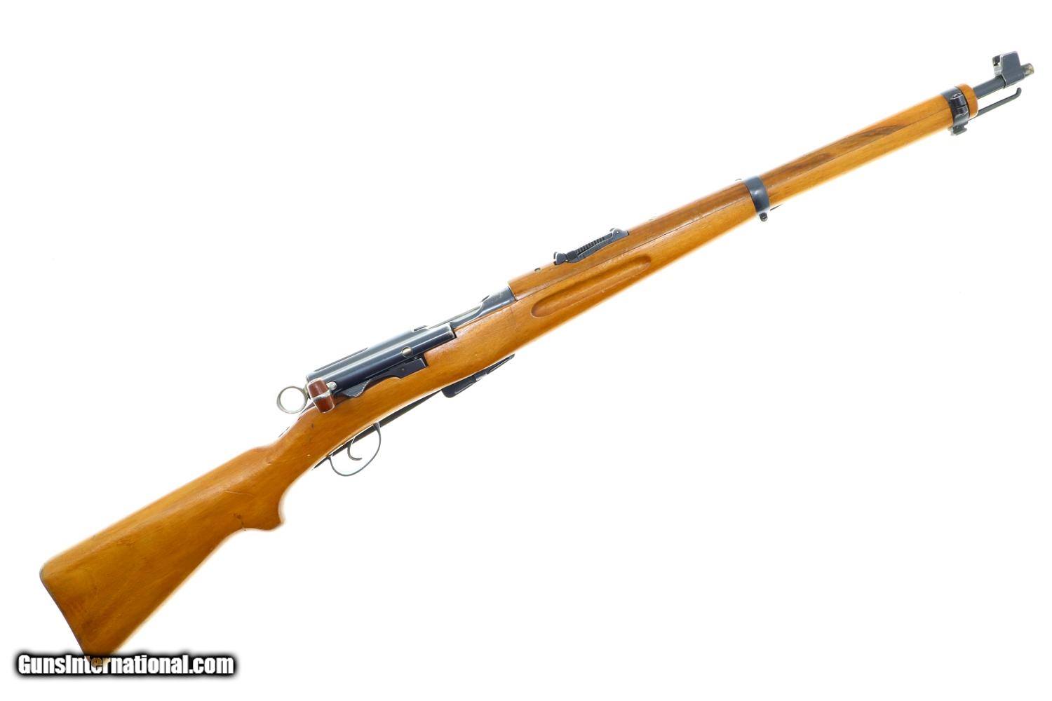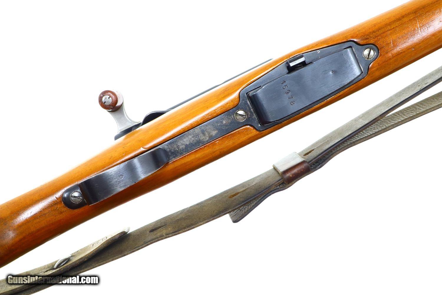 Description: Standard configuration and externally matching K11 carbine, circa 1931, with tangent rear sight graduated 1-15, straight pull bolt, detachable magazine, aluminum muzzle cap and metal buttplate. The left side of receiver is marked 15978 with “P” release, the same number repeated on the bolt and on the bottom of the magazine, the last three digits on the barrel. Import marked Walnut stock, military accepted. Metal buttplate. Synopsis: Bern, 1911, Swiss Military, K11 Carbine, 15978, I-1127 Condition: G-VG original blue with fading as photographed. VG+ walnut stock. Near Mirror bore with sharp rifling. Perfect manual mechanics. A classic Swiss military rifle in G-VG condition, perfect for the range or in your collection! ~~Insured shipping fee of $75; most packages shipped using FedEx 2nd Day.~~ SOLD Curio/Relic: Yes Manufacturer: Bern Serial Number: 15978 Caliber Info: 7.5x55 |