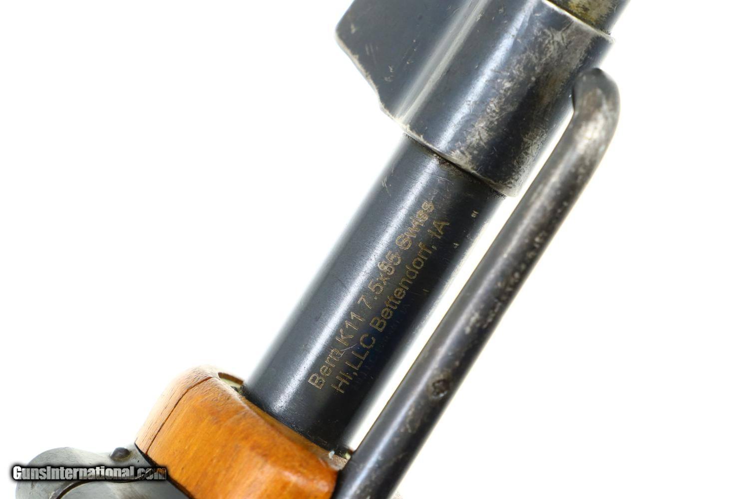 Description: Description: Standard configuration and externally matching K11 carbine, circa 1931, with tangent rear sight graduated 1-15, straight pull bolt, detachable magazine, aluminum muzzle cap and metal buttplate. The left side of receiver is marked 15978 with “P” release, the same number repeated on the bolt and on the bottom of the magazine, the last three digits on the barrel. Import marked Walnut stock, military accepted. Metal buttplate. Synopsis: Bern, 1911, Swiss Military, K11 Carbine, 15978, I-1127 Condition: G-VG original blue with fading as photographed. VG+ walnut stock. Near Mirror bore with sharp rifling. Perfect manual mechanics. A classic Swiss military rifle in G-VG condition, perfect for the range or in your collection! SOLD Manufacturer: Bern Model: K11 Serial Number: 15978 Caliber Info: 7.5x55 Condition: Near Mirror bore with sharp rifling |