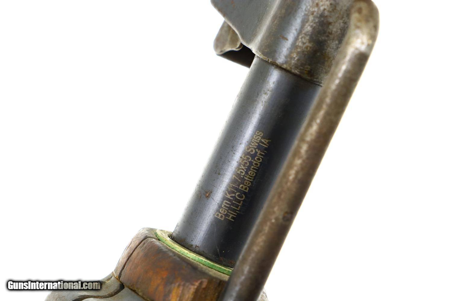Description: Standard configuration and externally matching K11 carbine, circa 1931, with tangent rear sight graduated 1-15, straight pull bolt, detachable magazine, brass muzzle cap and metal buttplate. The left side of receiver is marked 16296 with “P” release, the same number repeated on the bolt and on the bottom of the magazine, the last three digits on the barrel that has a Swiss military muzzle cap. Import marked Walnut stock, military accepted. Metal buttplate. Military sling dated “not discernible”. Synopsis: Bern 1911 Swiss Military K11 Carbine, 16296, I-1040 Condition: G with considerable fading and staining of metal. Comparable walnut stock. Bright bore with sharp rifling. Perfect manual mechanics. Excellent, later era sling. A classic Swiss military rifle in G condition, perfect for the range or in your collection! ~~Insured shipping fee of $75; most packages shipped using FedEx 2nd Day.~~ SOLD Manufacturer: Bern Serial Number: 16296 Caliber Info: 7.5x55 |