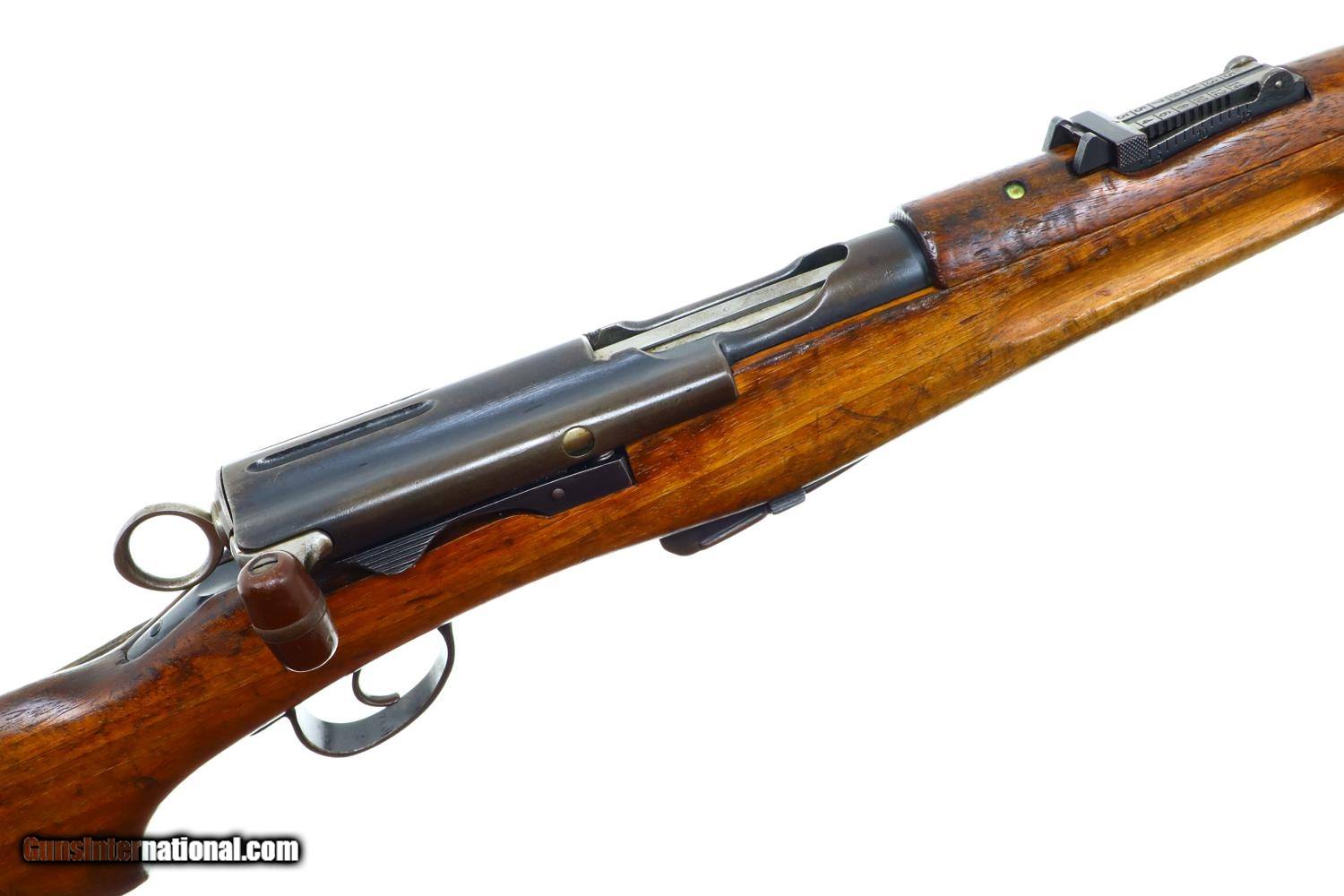 Standard configuration and externally matching K11 carbine, circa 1923, with tangent rear sight graduated 1-15, straight pull bolt, detachable magazine, brass muzzle cap and metal buttplate. The left side of receiver is marked 77784 with “P” release, the same number repeated on the bolt and on the bottom of the magazine, the last three digits on the barrel. Import marked Walnut stock, military accepted. Metal buttplate. Military sling.